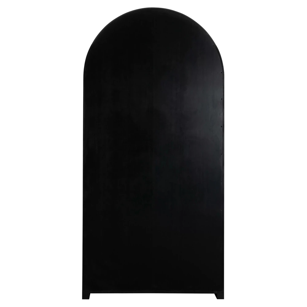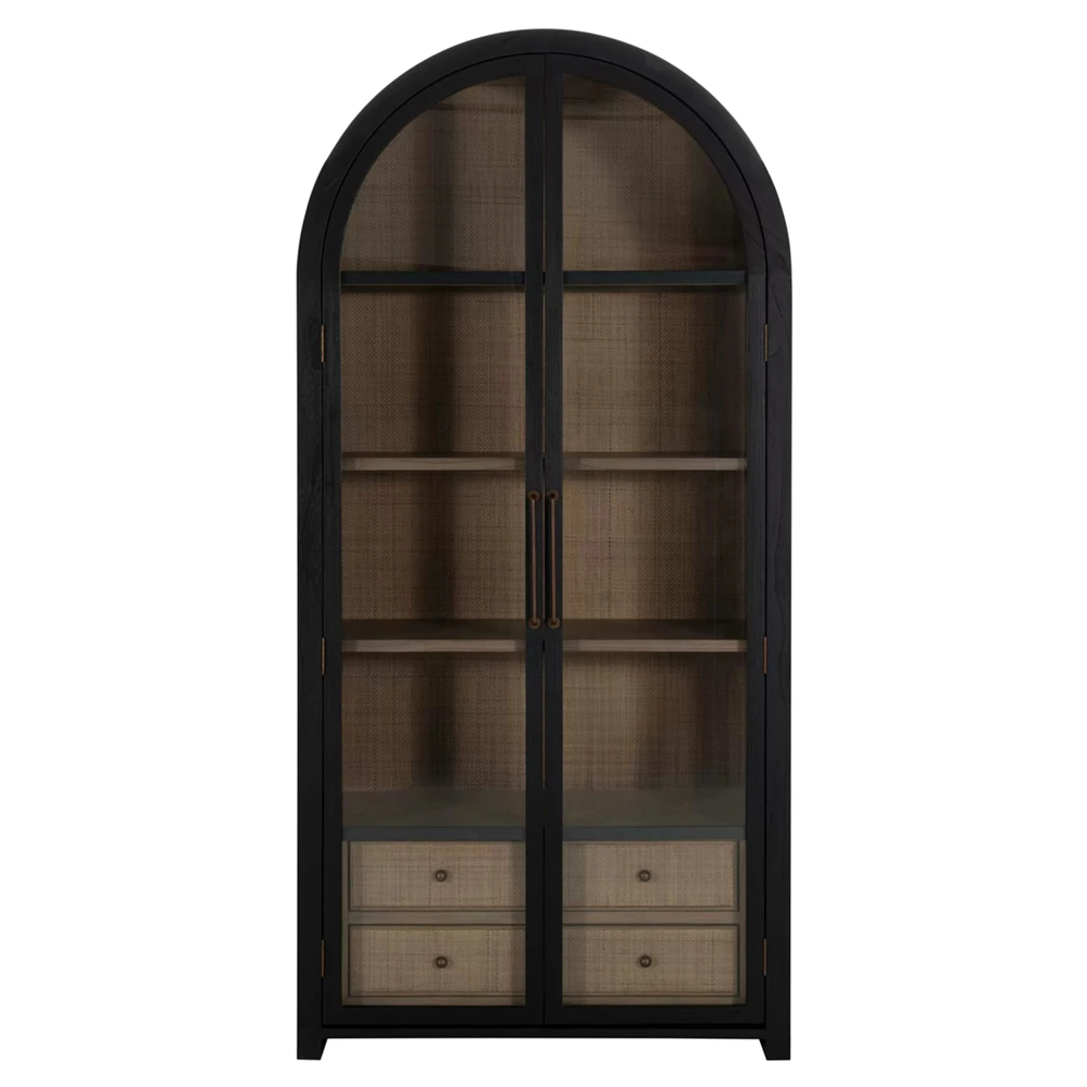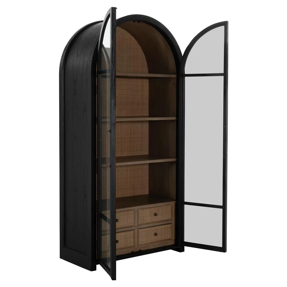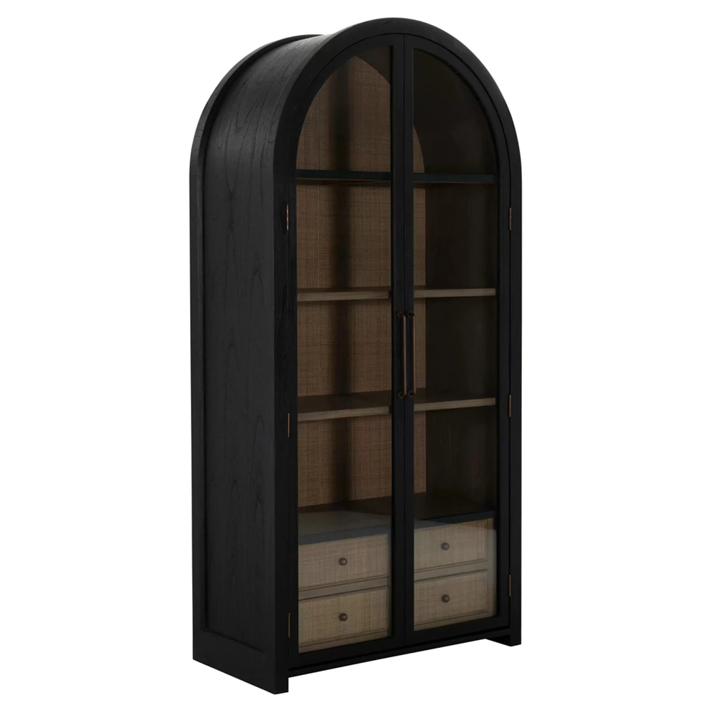 Elsa Updated Traditional Black Wood Rattan Arched China Cabinet