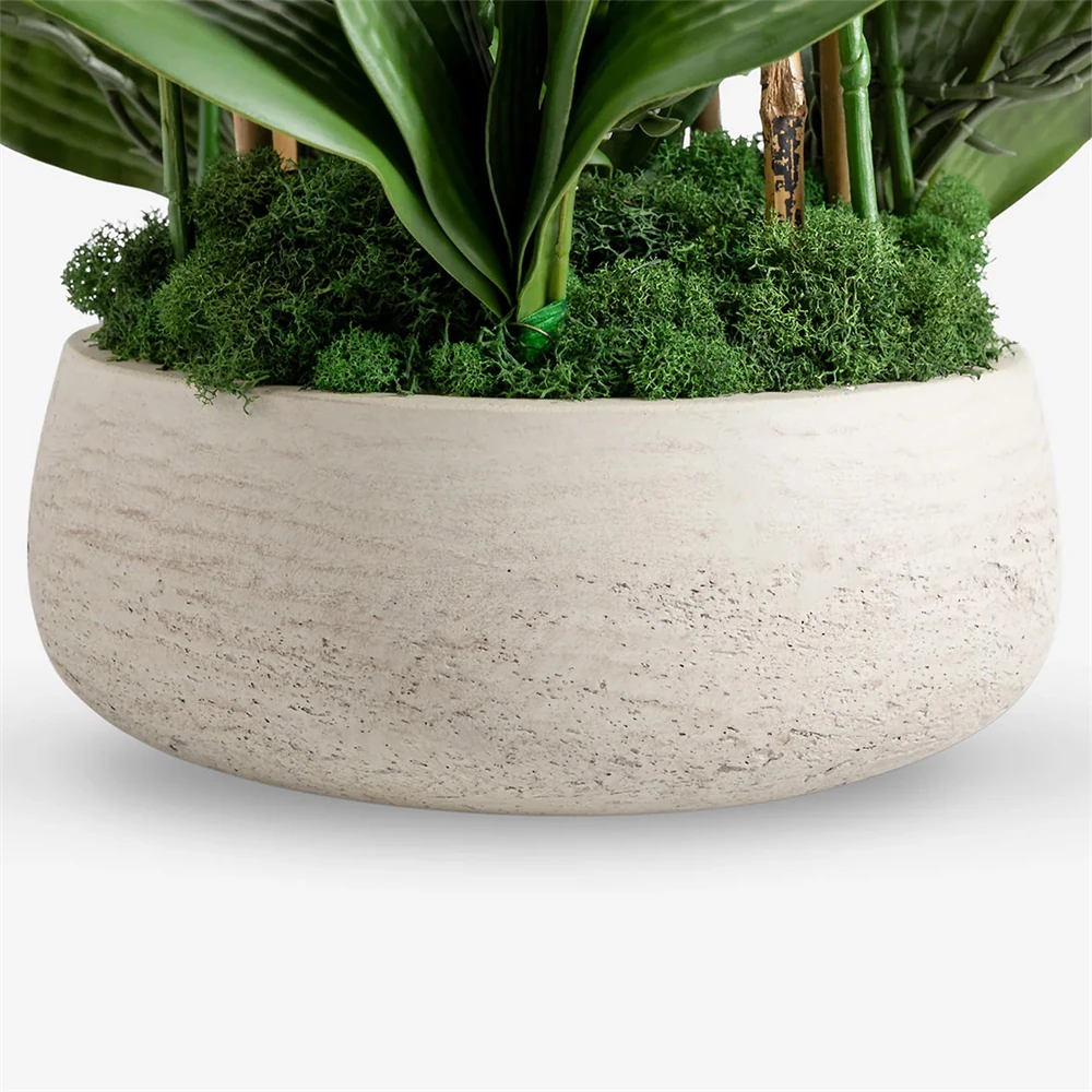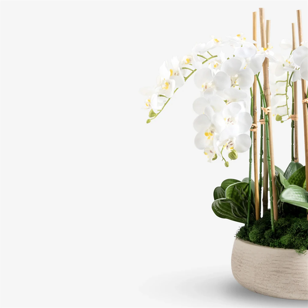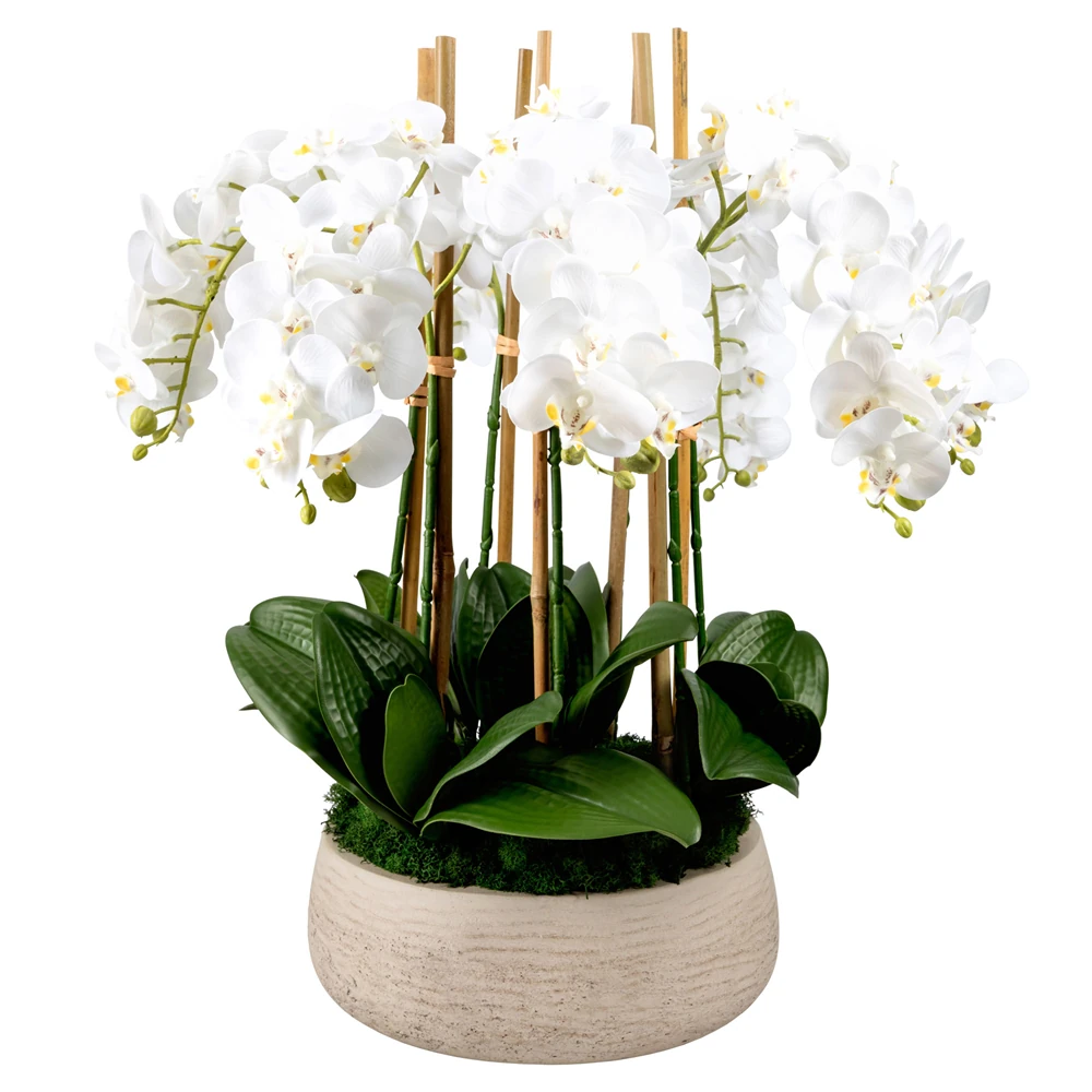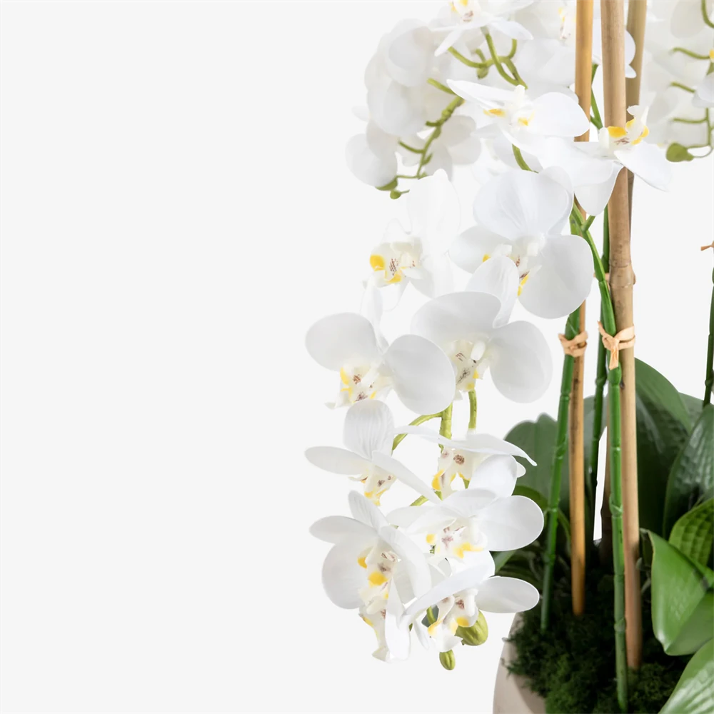 • Features 7 RealTouch Orchids with orchid leaves and bamboo sticks, set in a curved cement vase