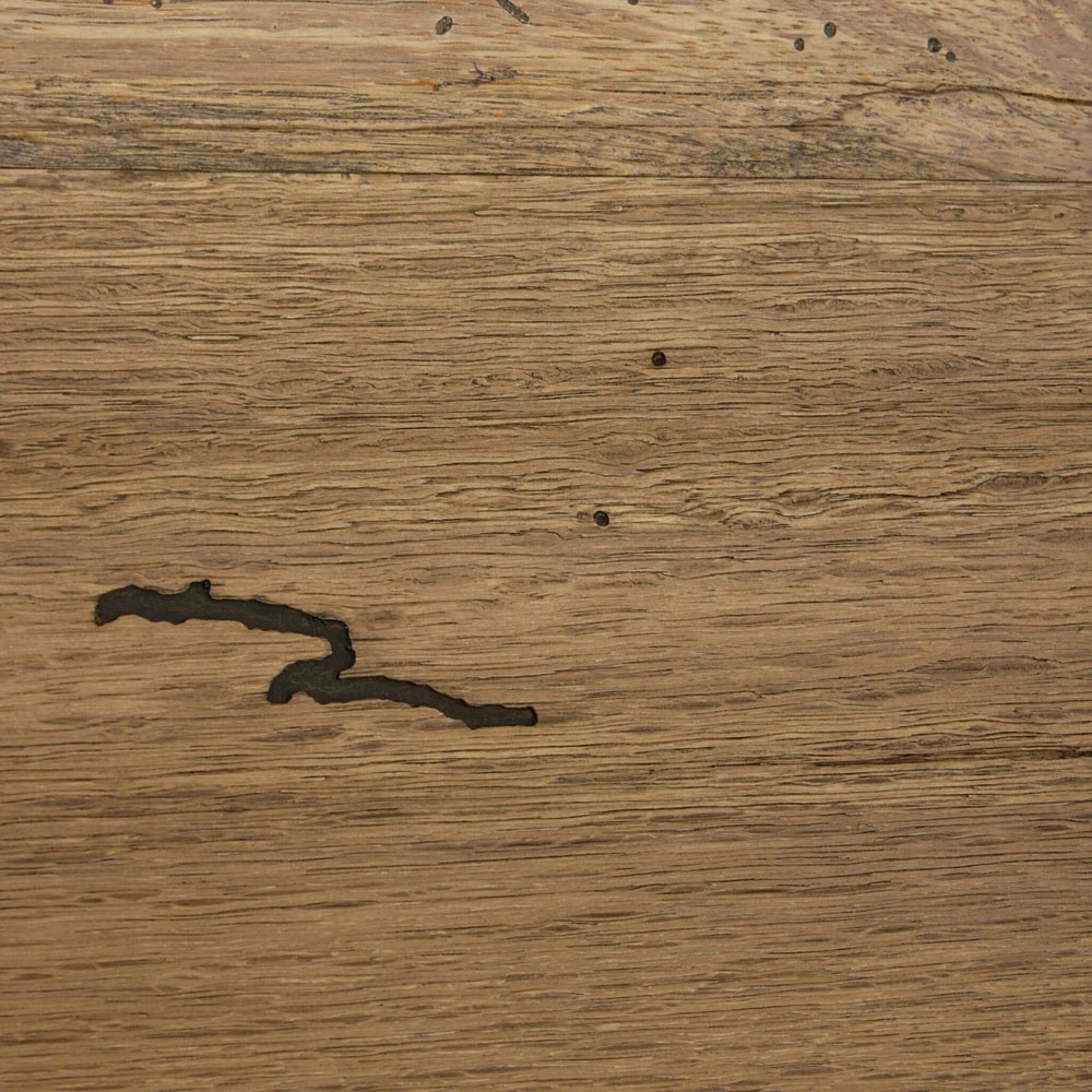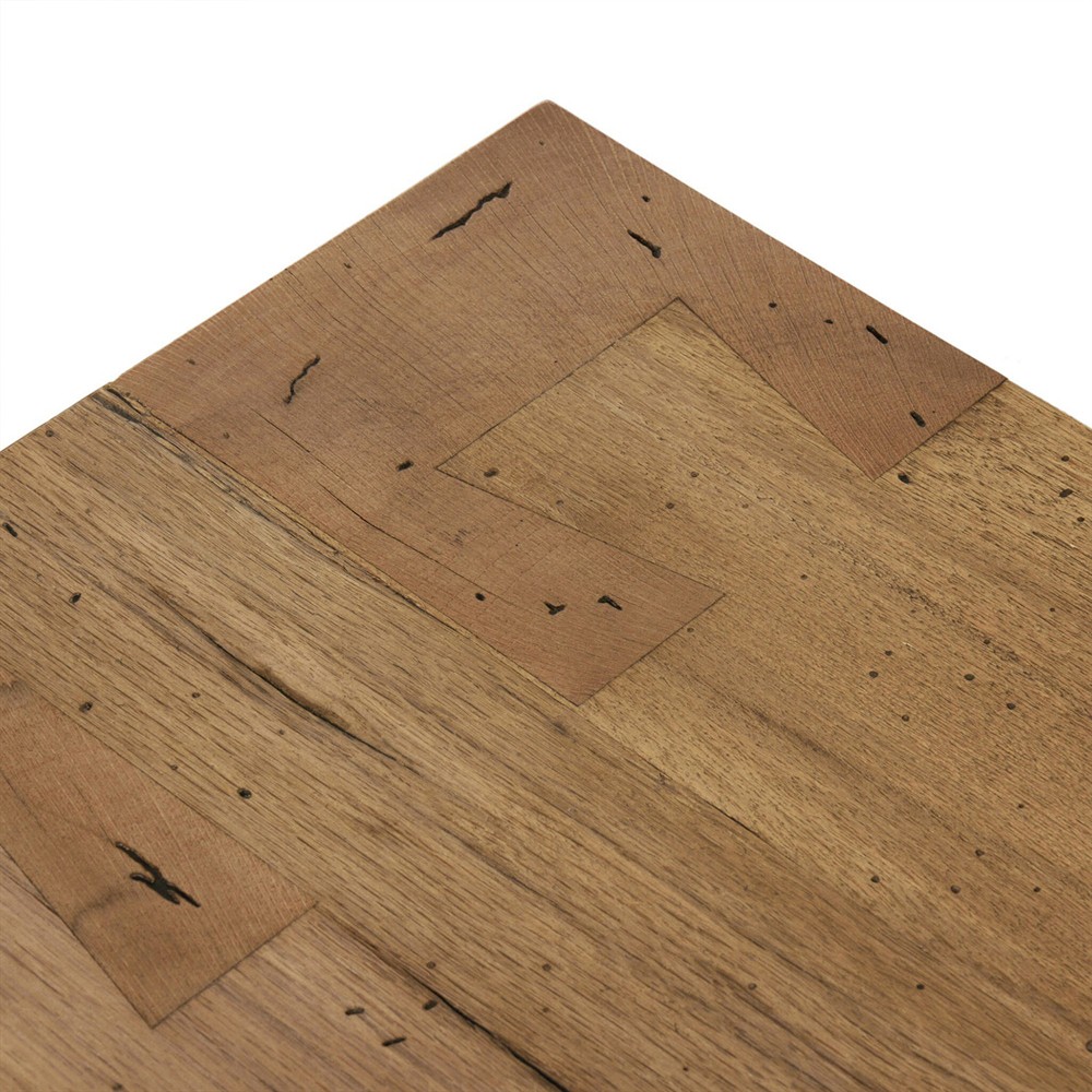 • Features thick-cut oak veneer with a faux rustic finish, clean parsons lines, chunky squared legs and dovetail joinery detailing