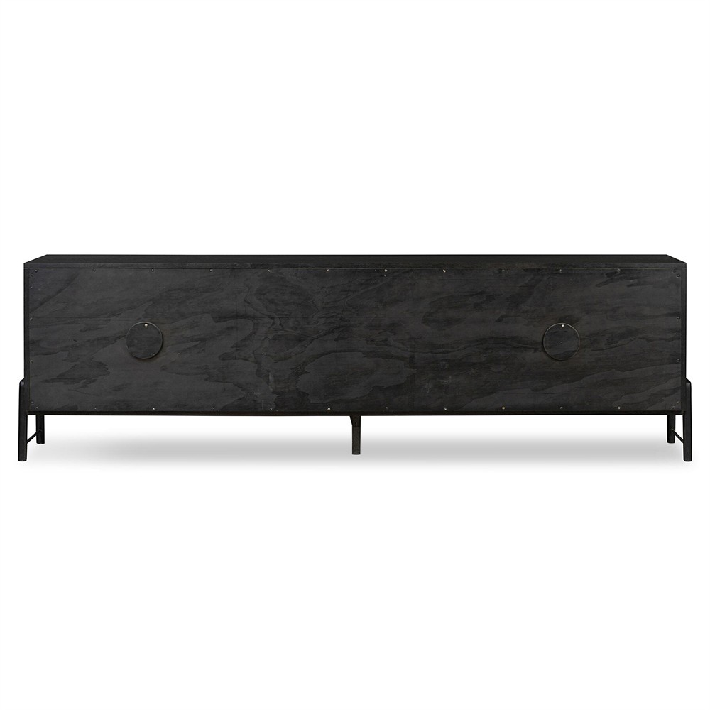 • Emilie Mid Century Light Brown Mango Wood Woven Cane Iron Base Media Console - 65"W|Kathy Kuo Home