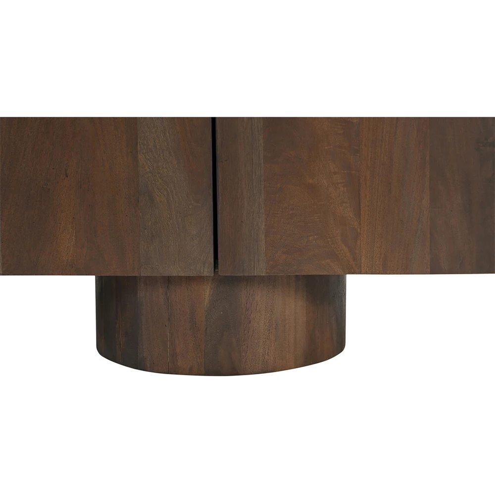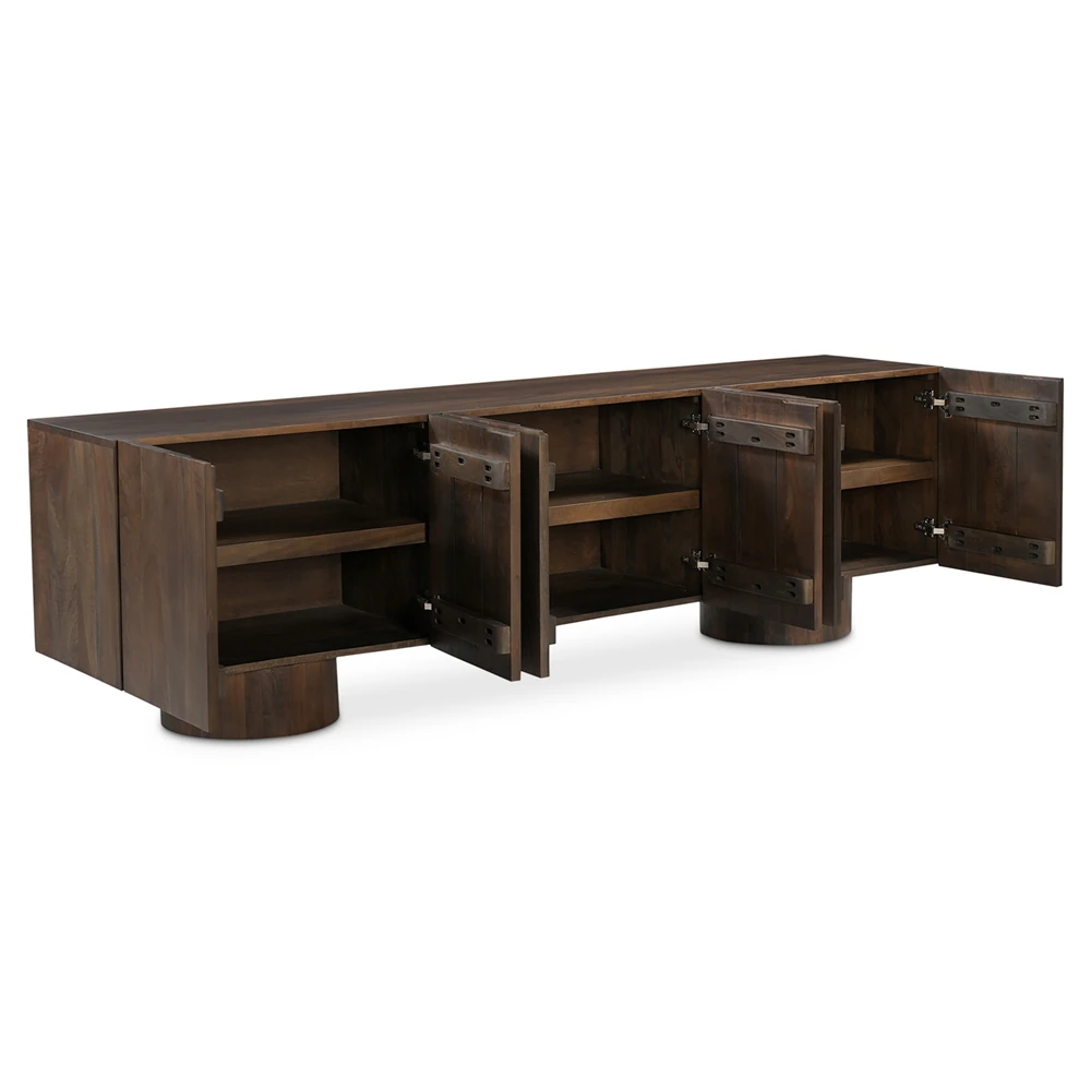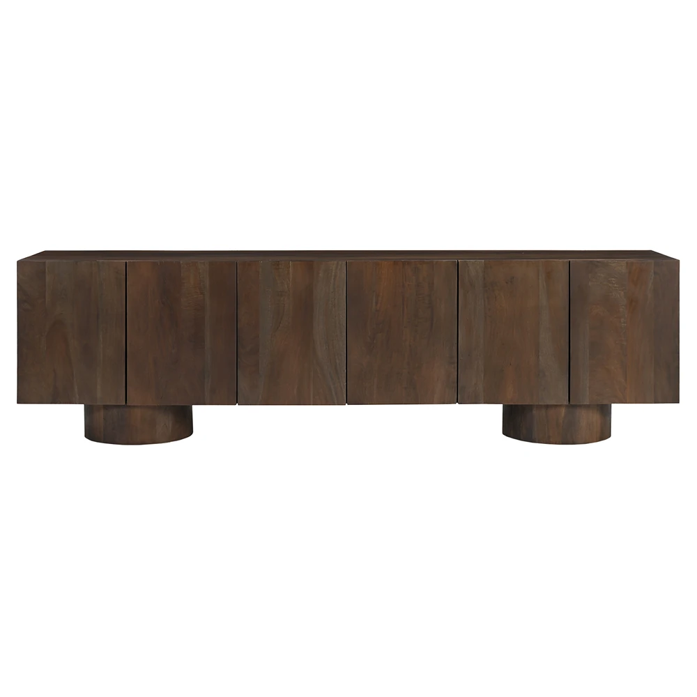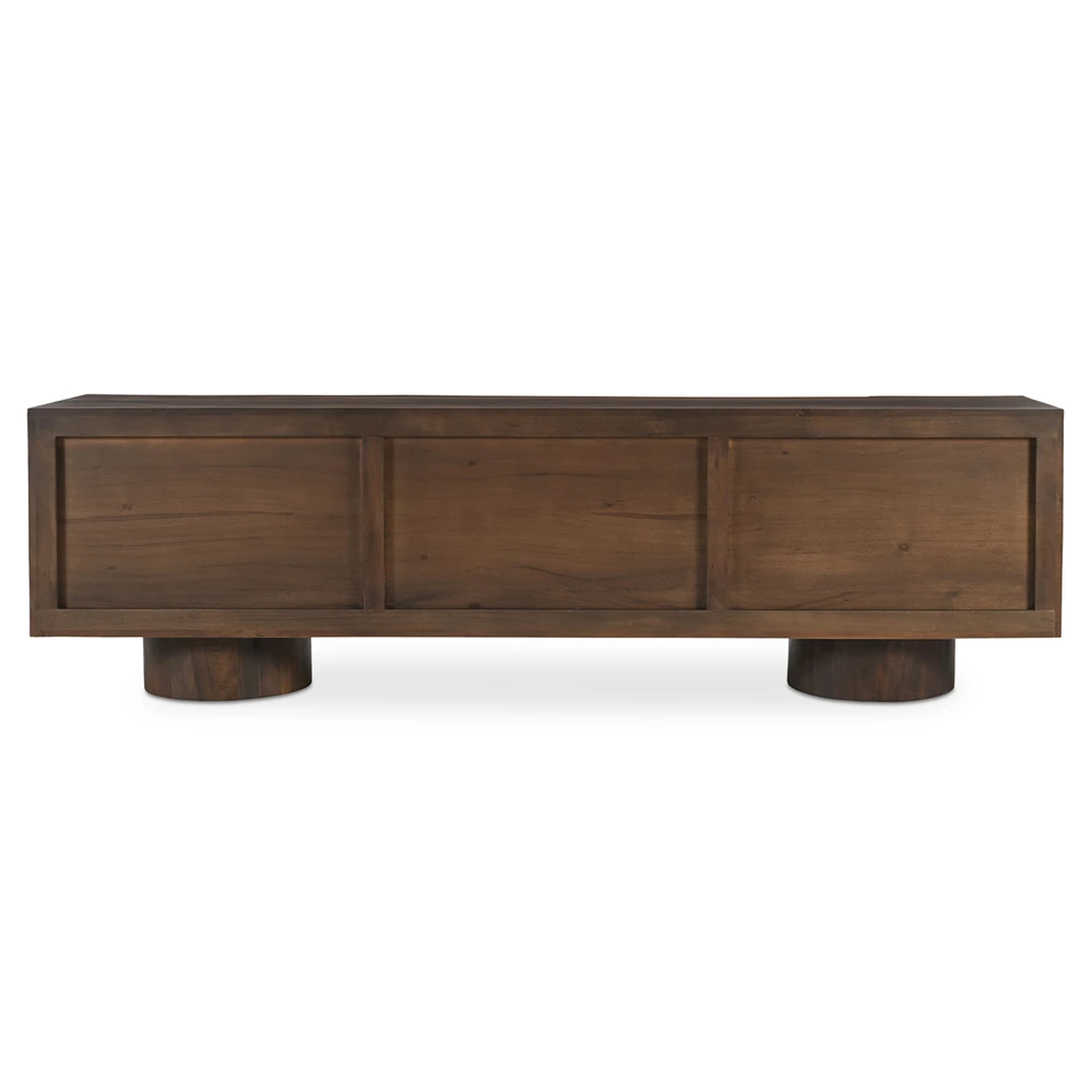 • Features a substantial 2-inch reclaimed neem wood top with cylindrical bases, six doors revealing three interior shelves, built-in cable management, and unique natural wood variations