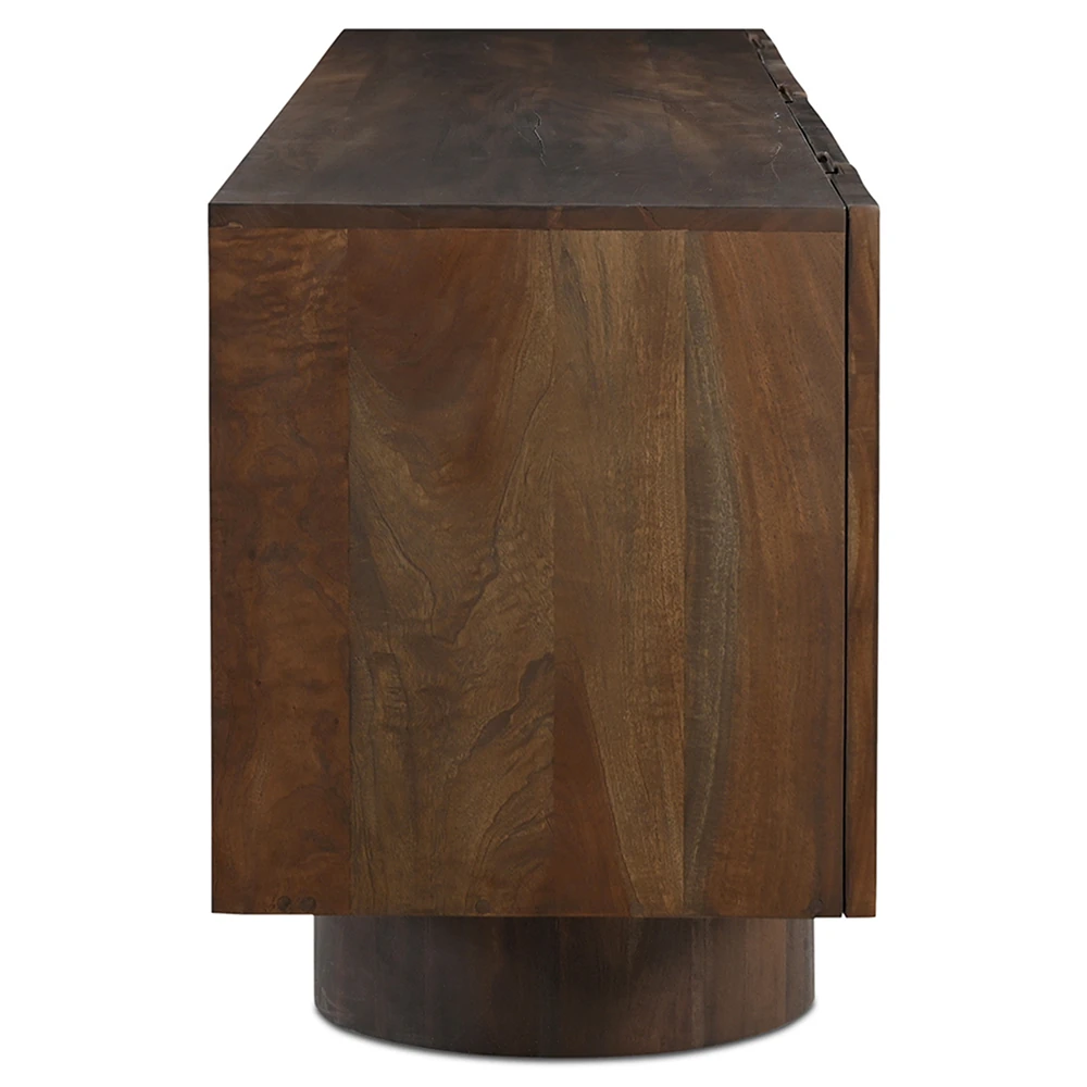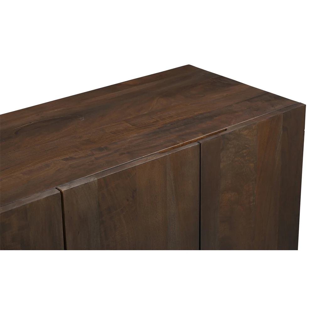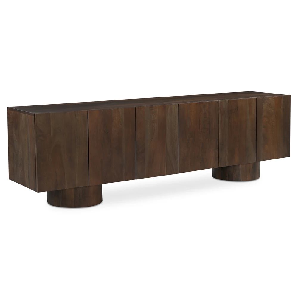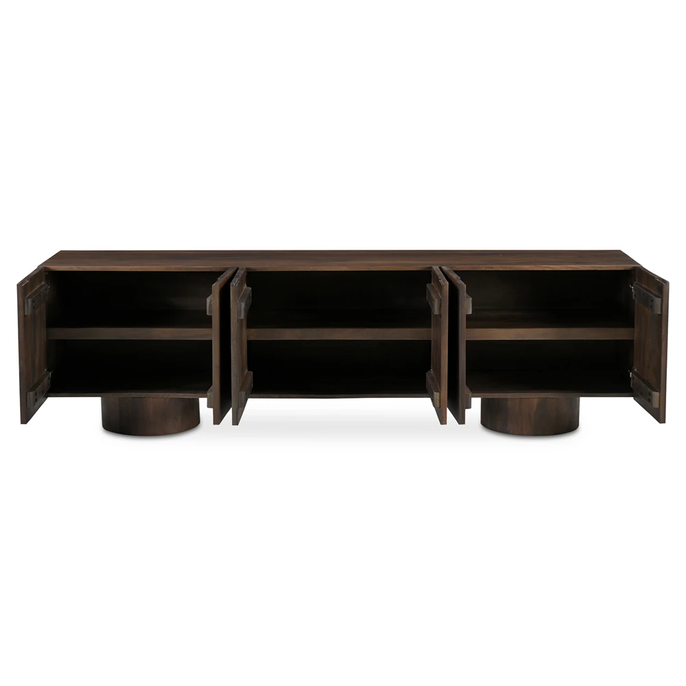 • Features a substantial 2-inch reclaimed neem wood top with cylindrical bases, six doors revealing three interior shelves, built-in cable management, and unique natural wood variations