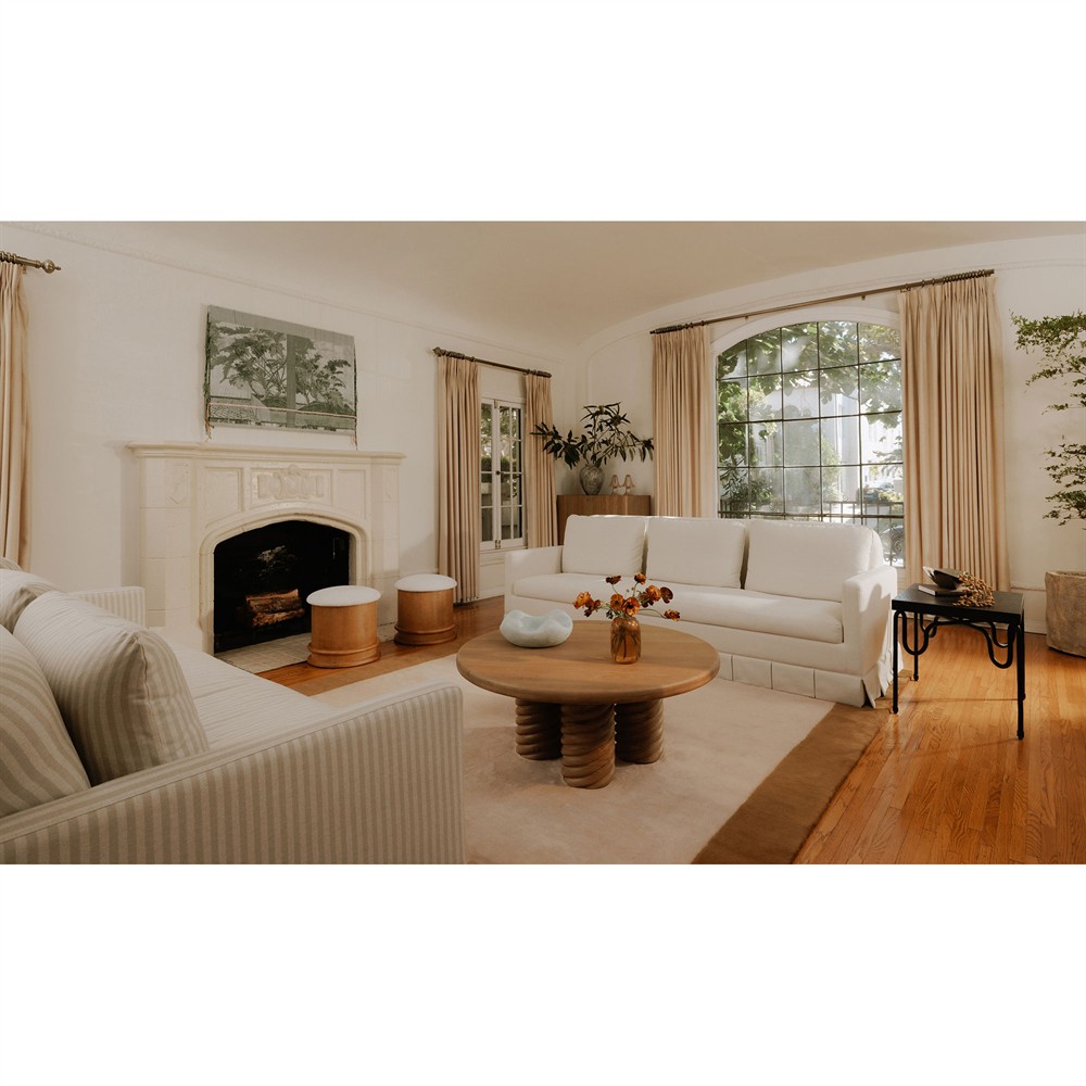 • Leith Modern Classic Cream Linen Boulder Brown Wood Round Ottoman|Kathy Kuo Home