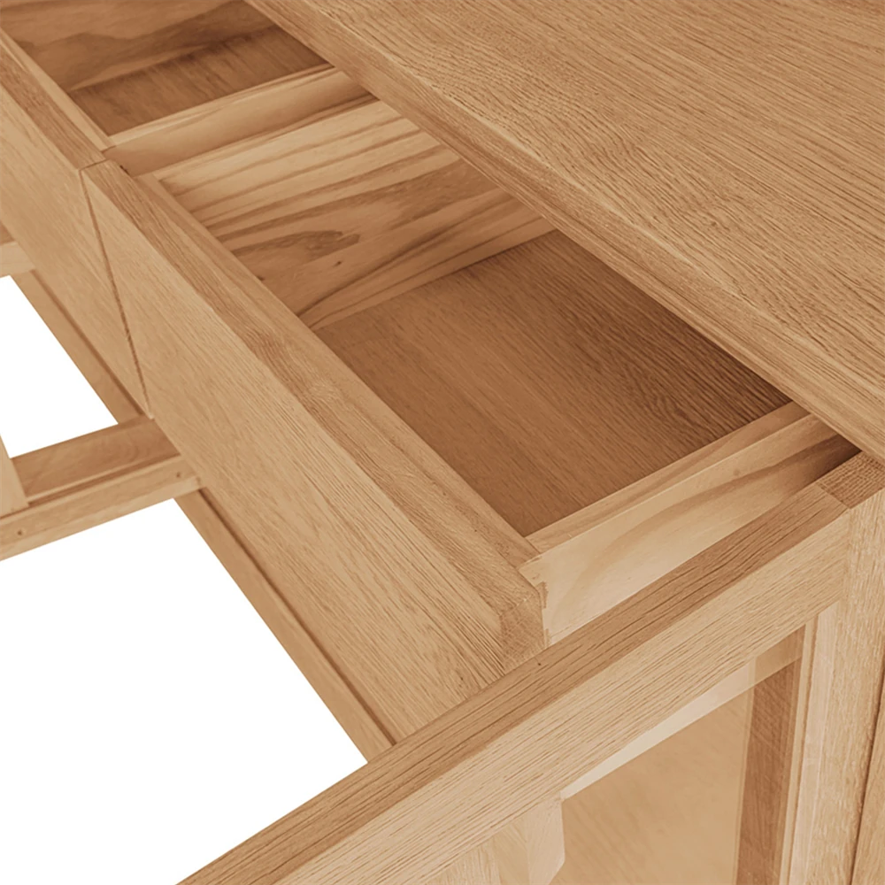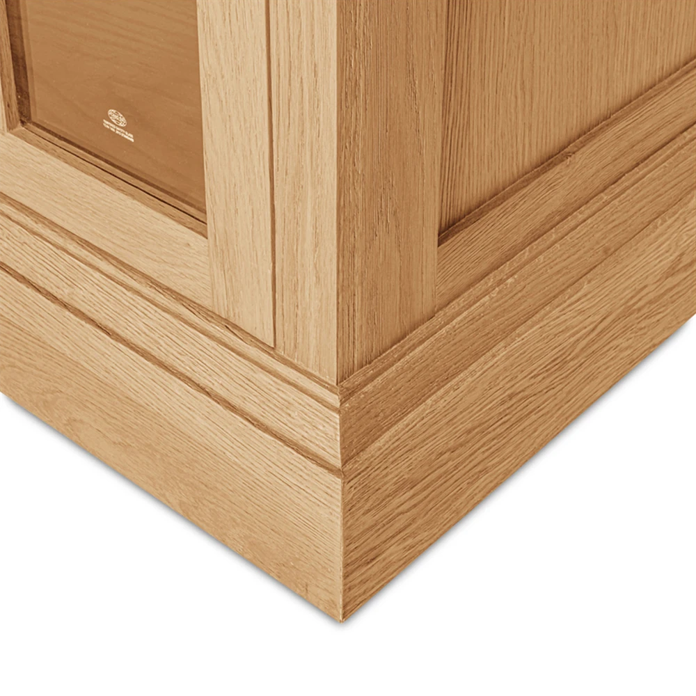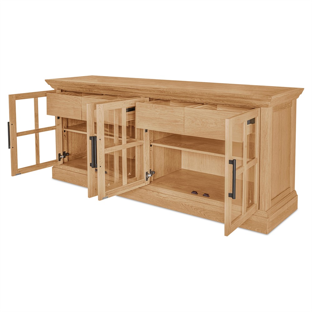 • Features 4 interior drawers, wire-brushed solid oak construction, glass front with traditional molding and overhang and 2 media cable management holes