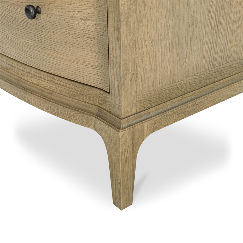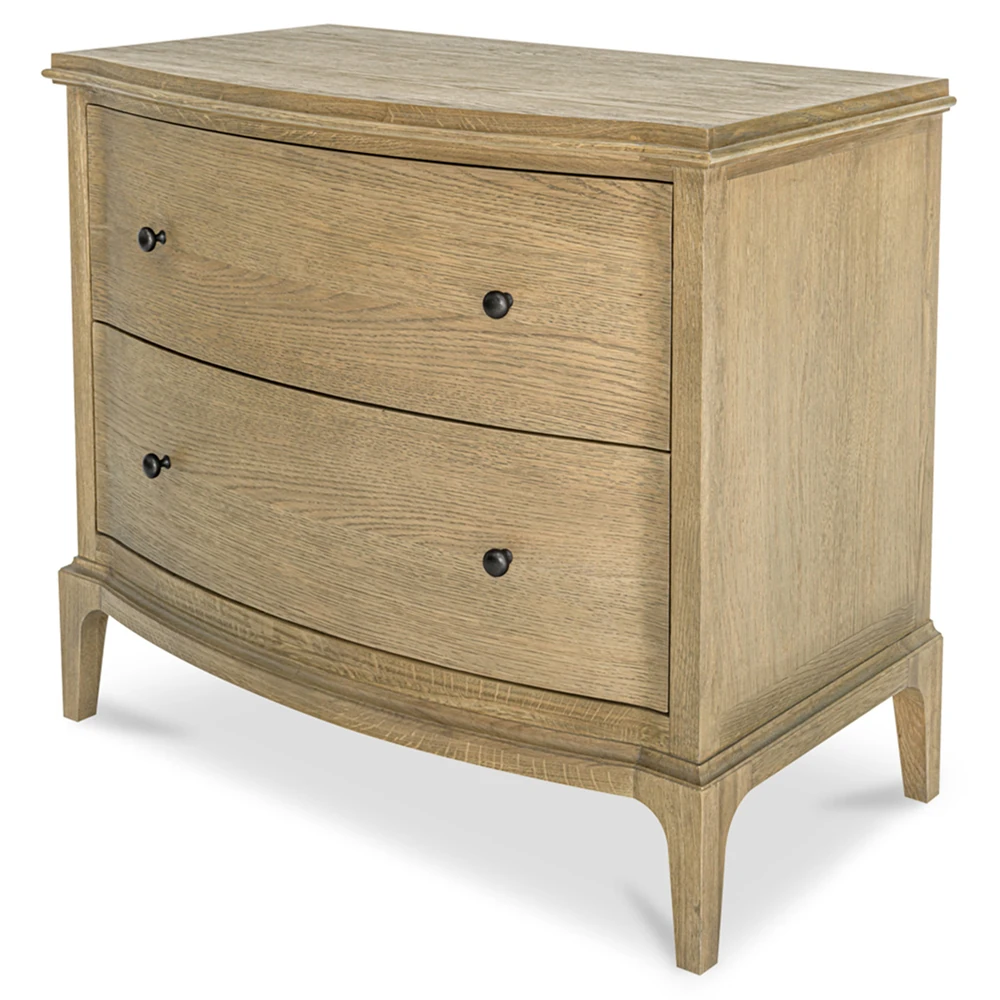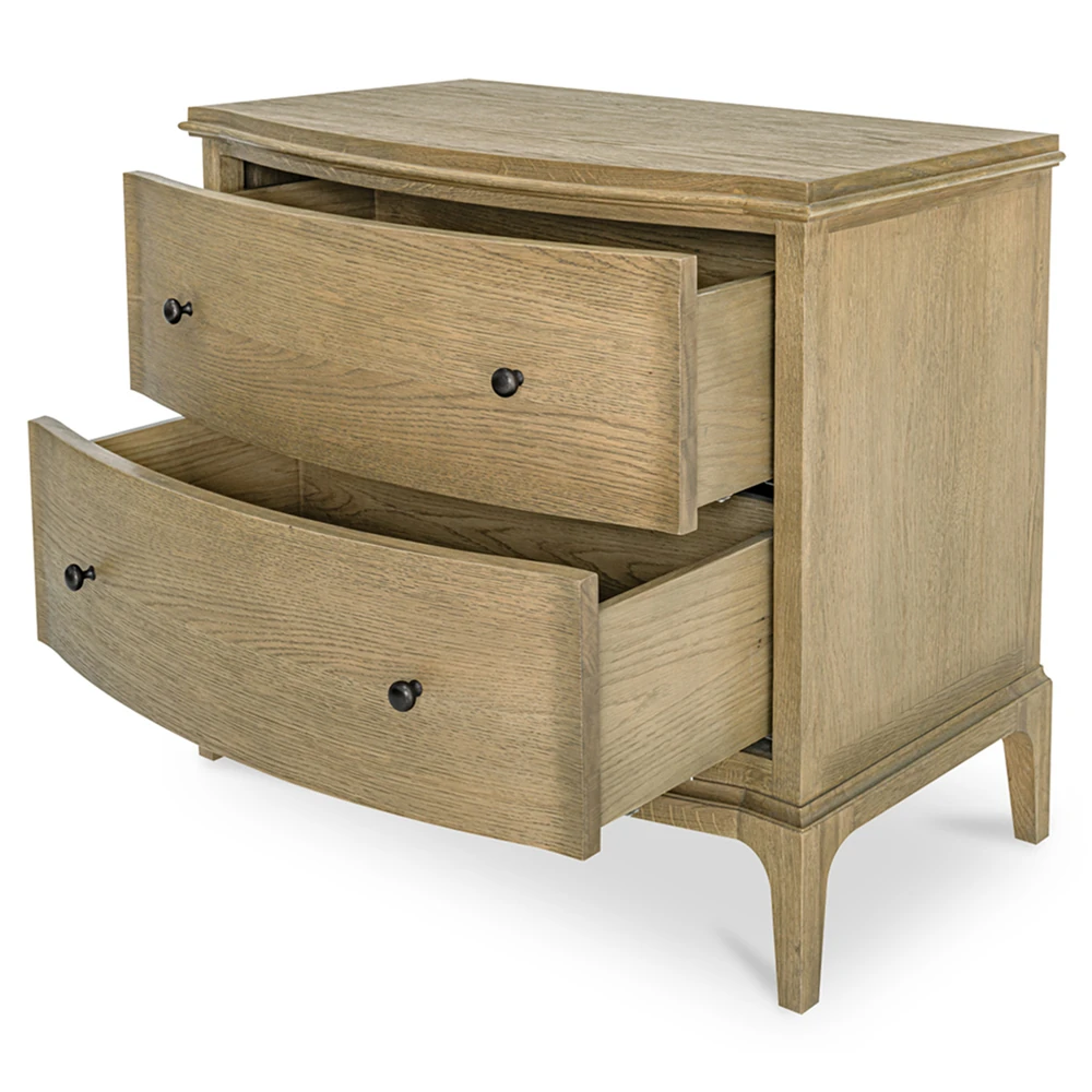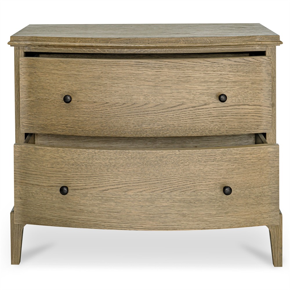 • Features 2 drawers with undermounted glides, wire-brushed oak construction and a curved front with rounded overhang edges