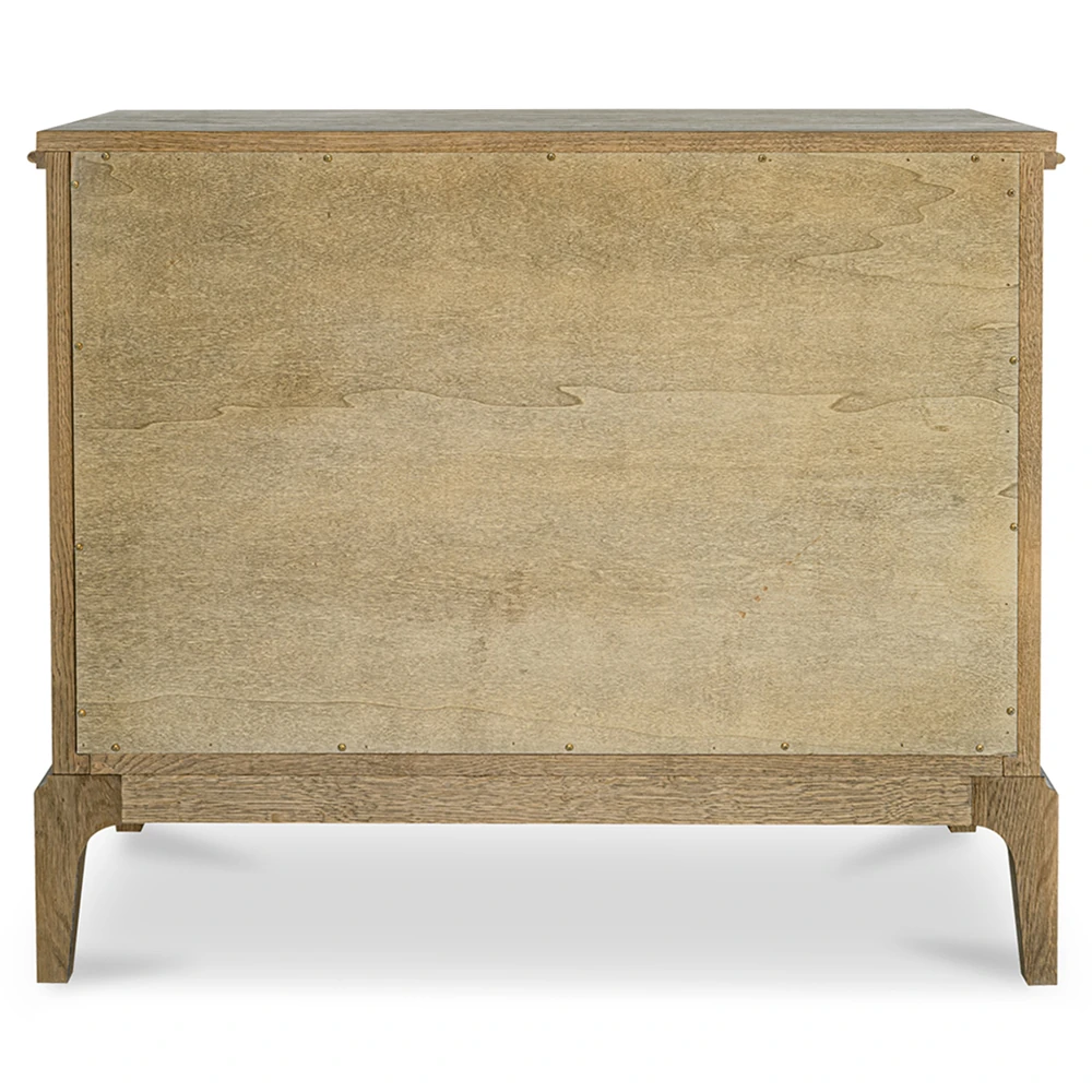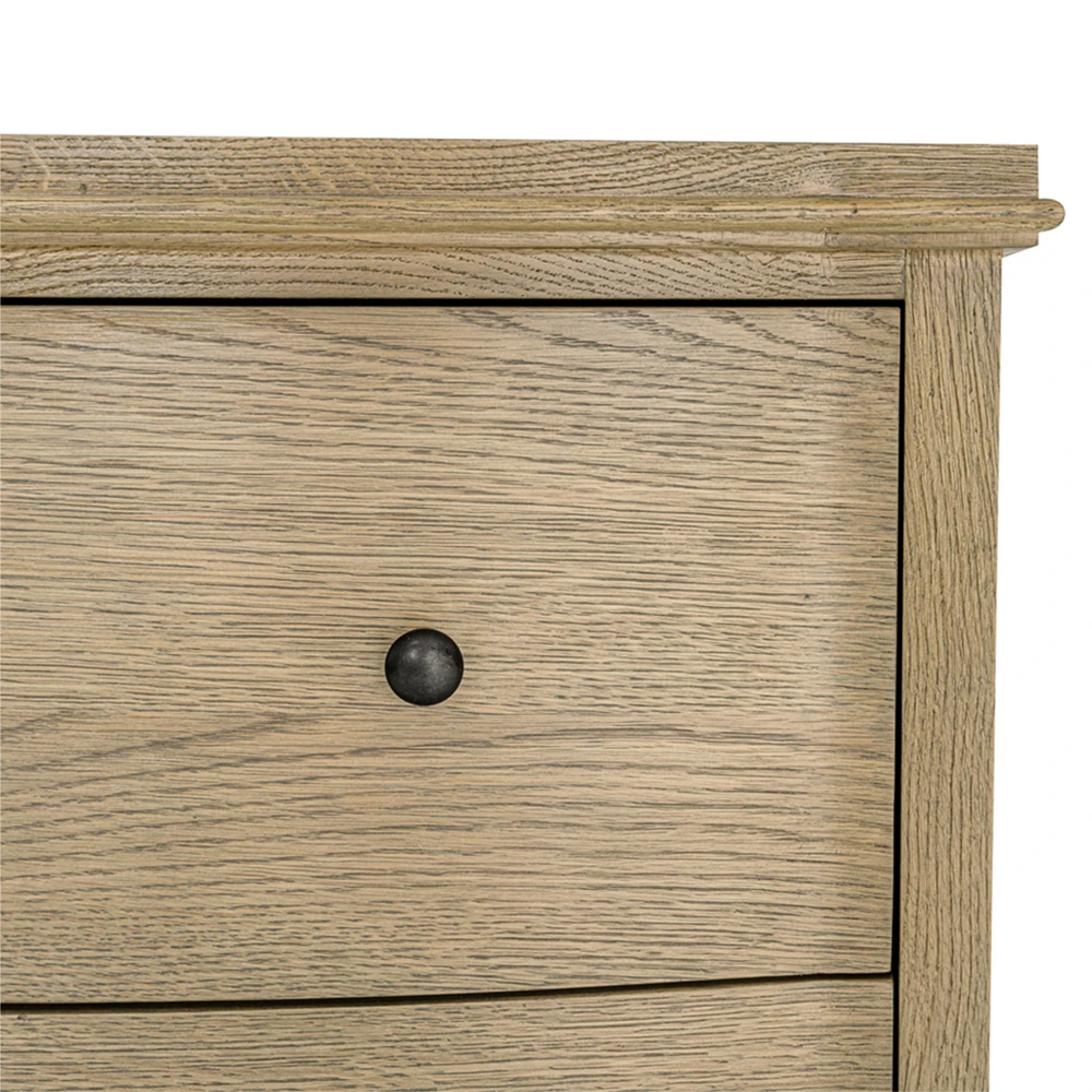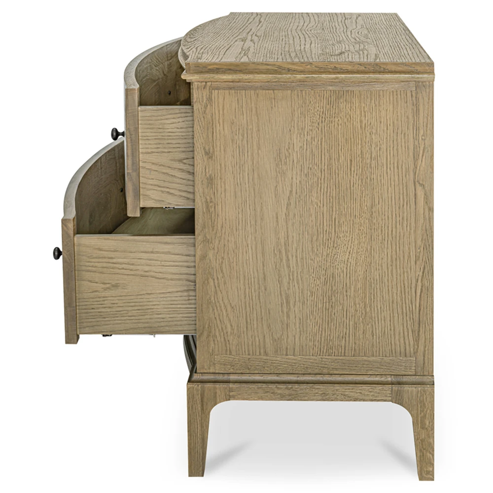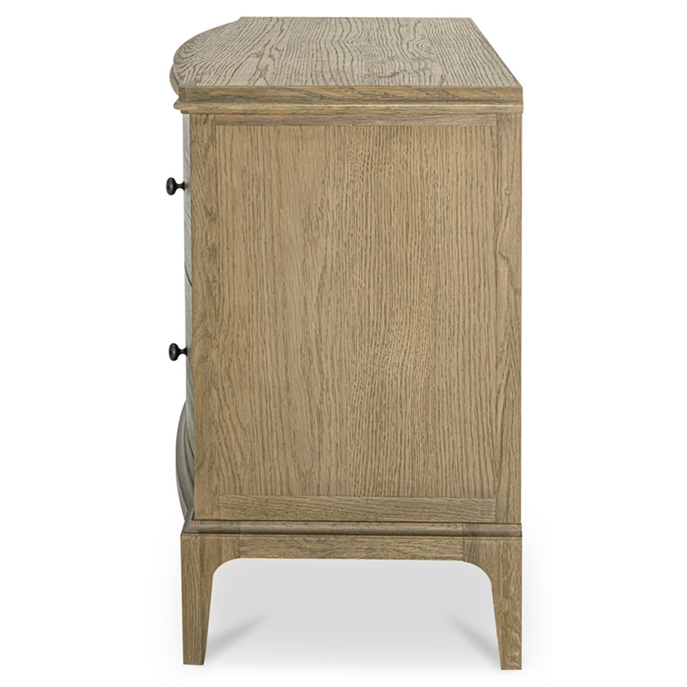 • Features 2 drawers with undermounted glides, wire-brushed oak construction and a curved front with rounded overhang edges