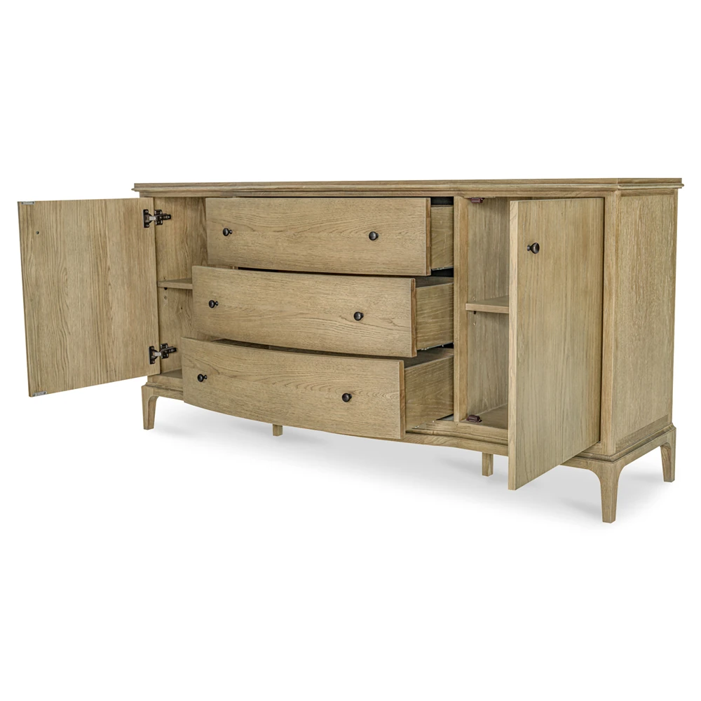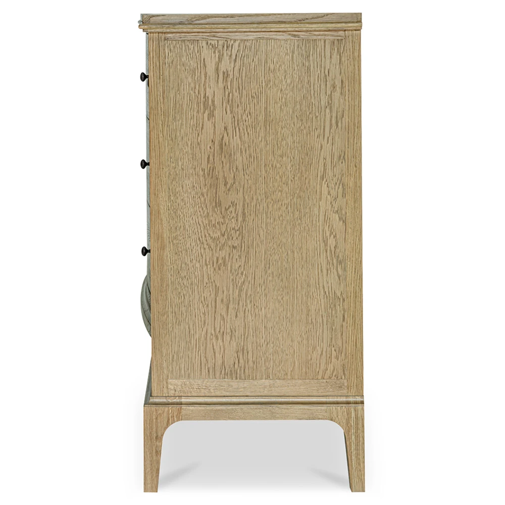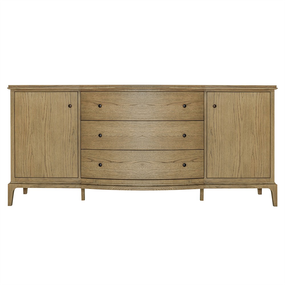 • Features 3 drawers with undermounted glides, wire-brushed oak construction, curved front with rounded overhang edges and 2 media cable organization holes