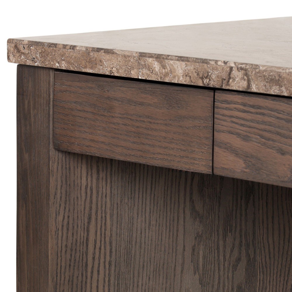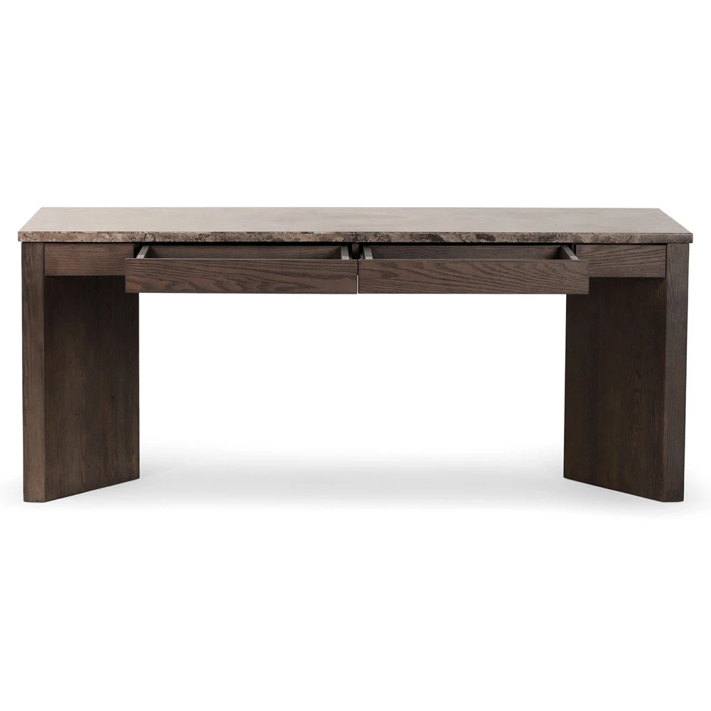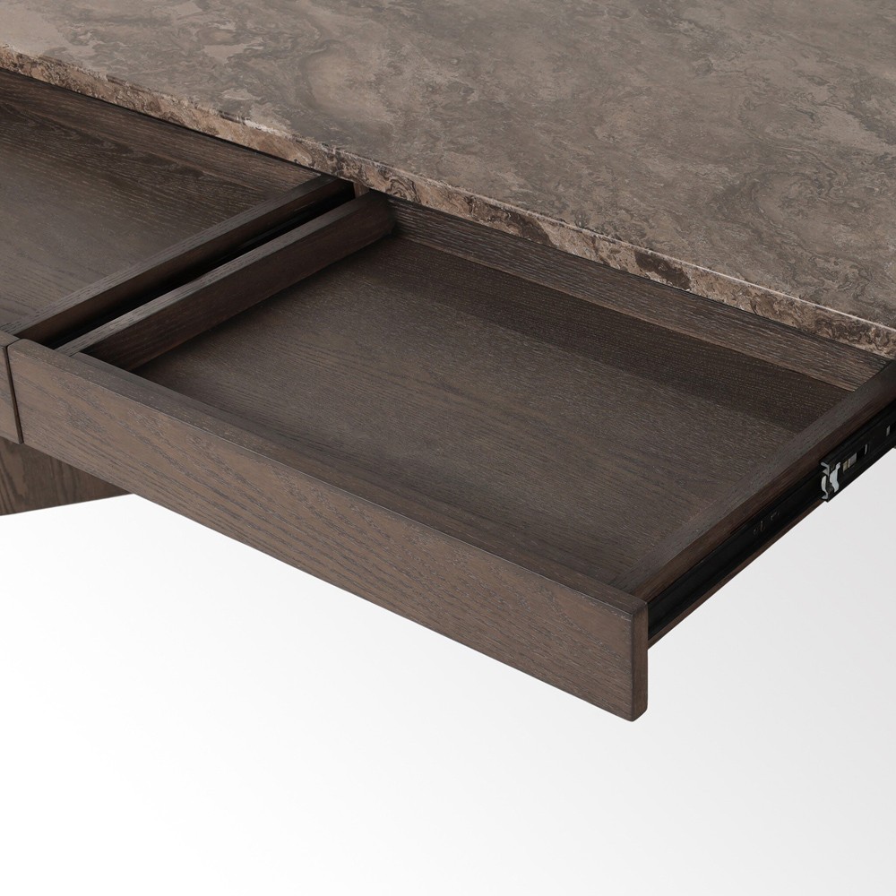 • Features a vein-rich grey marble top, angular brown oak base, and 2 pencil drawers for storage
