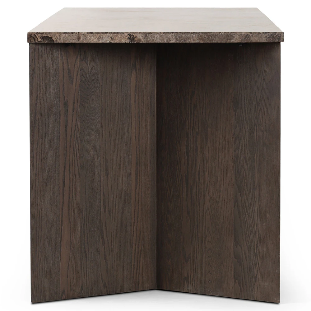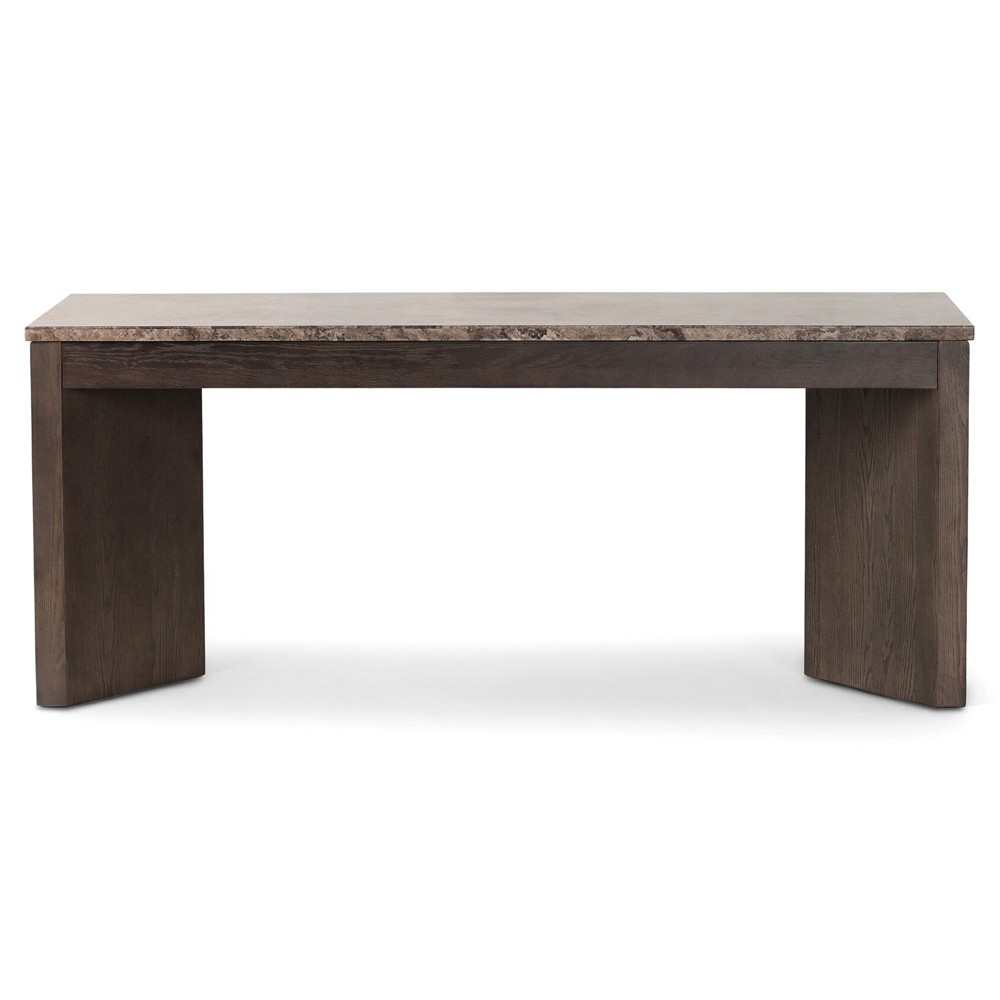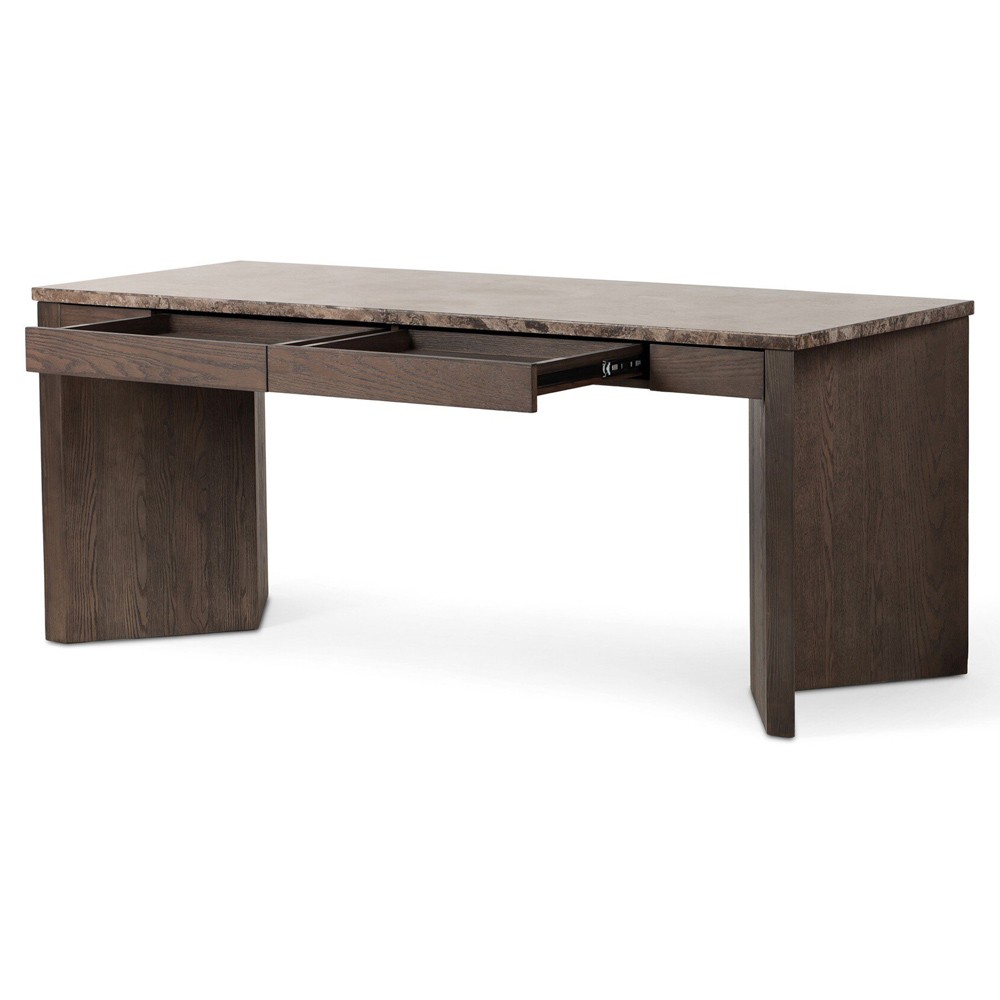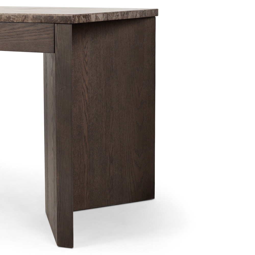 • Features a vein-rich grey marble top, angular brown oak base, and 2 pencil drawers for storage