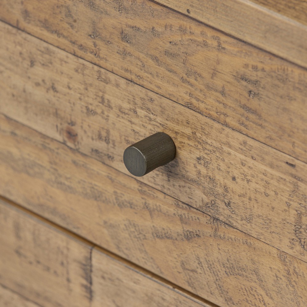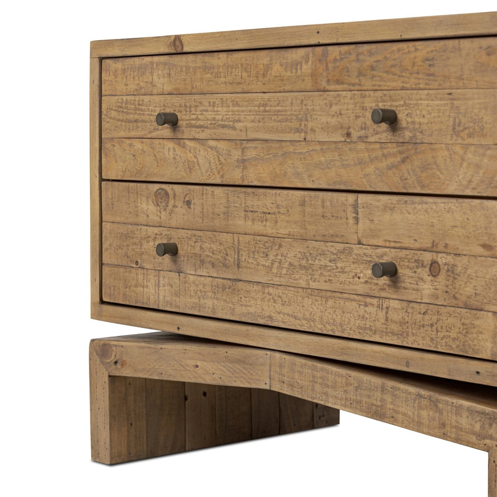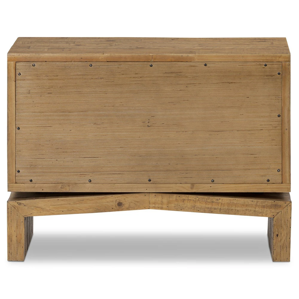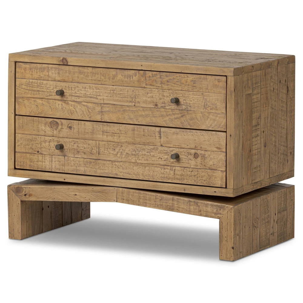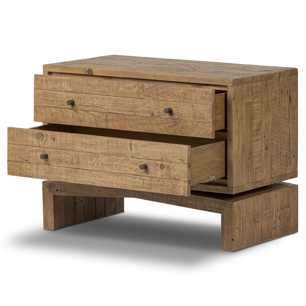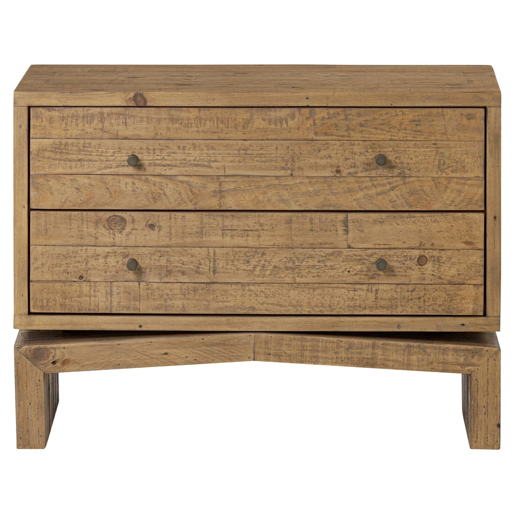 • Features 2 drawers crafted from solid reclaimed pine with a rustic finish that highlights natural knots and grain patterns
