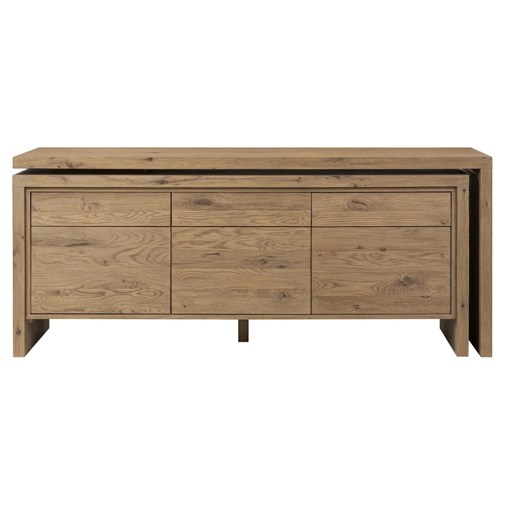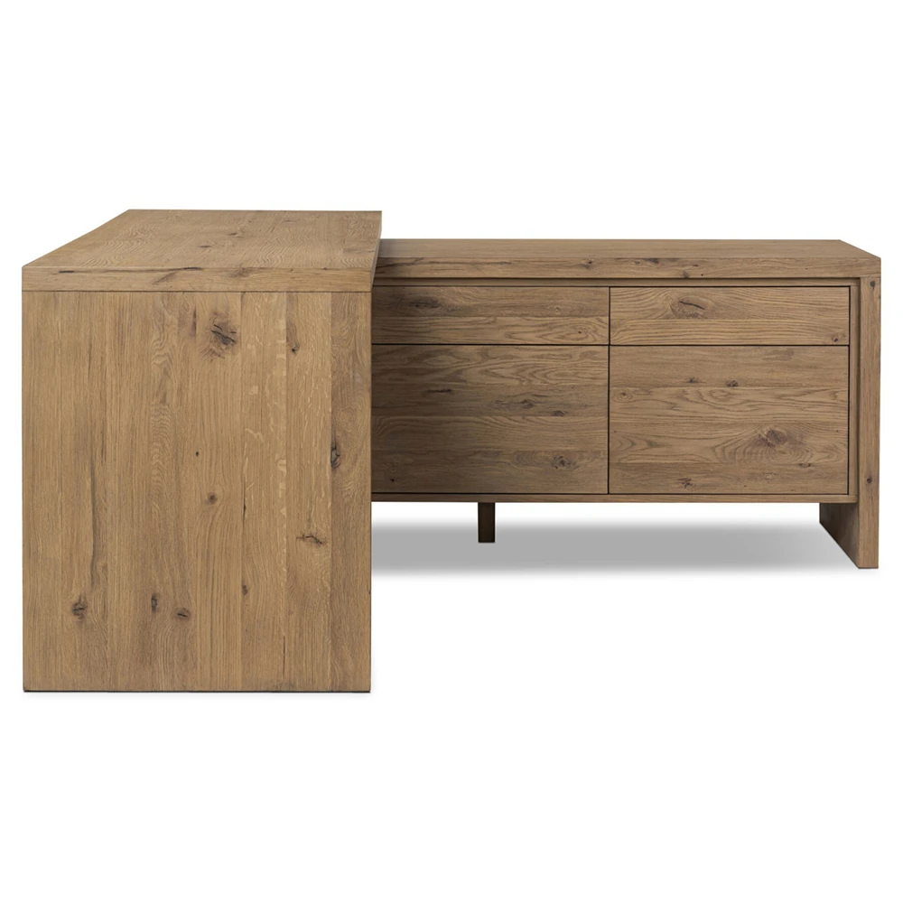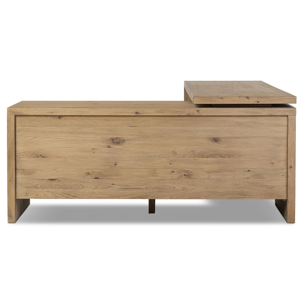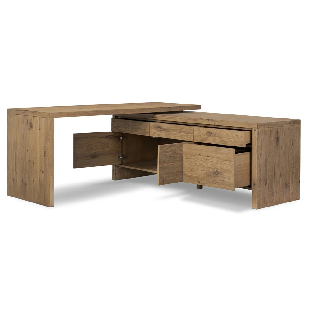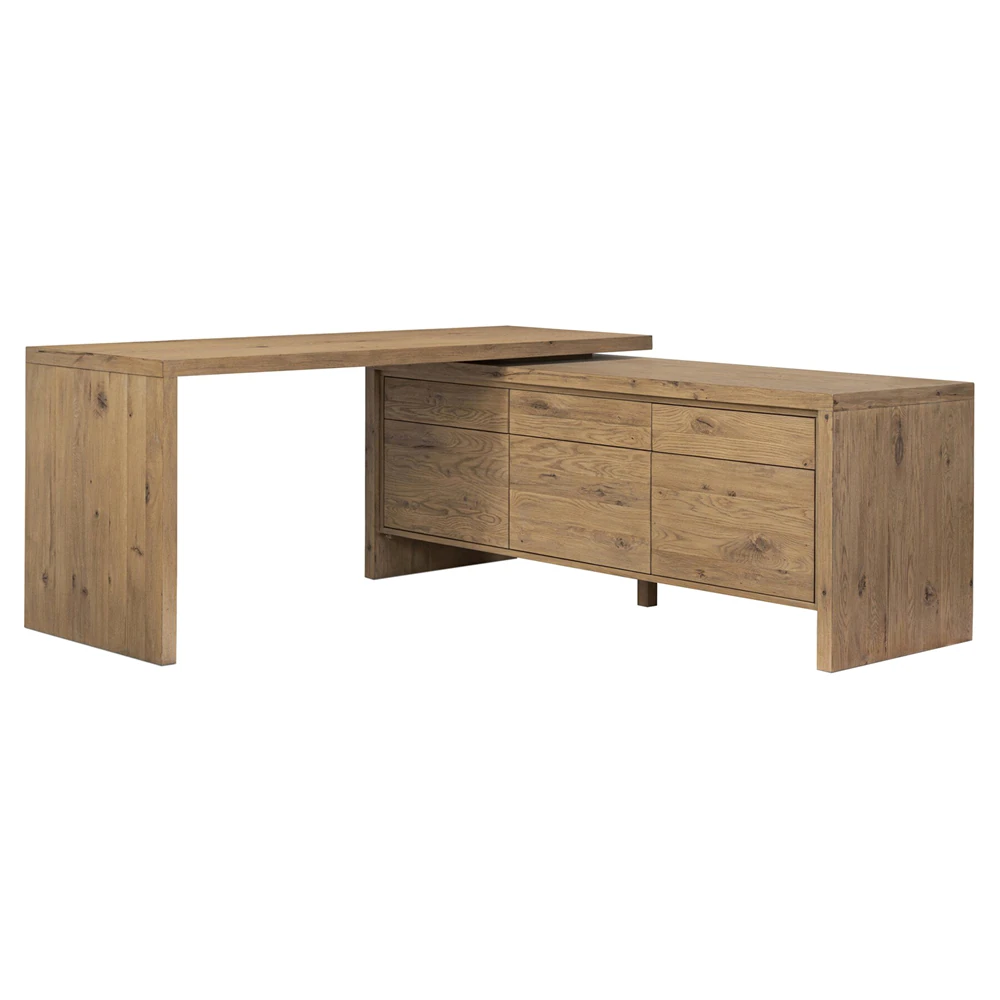 • Features an L-shaped rotating design in aged smoked oak with drawers and cabinetry for storage and 360-degree mobility