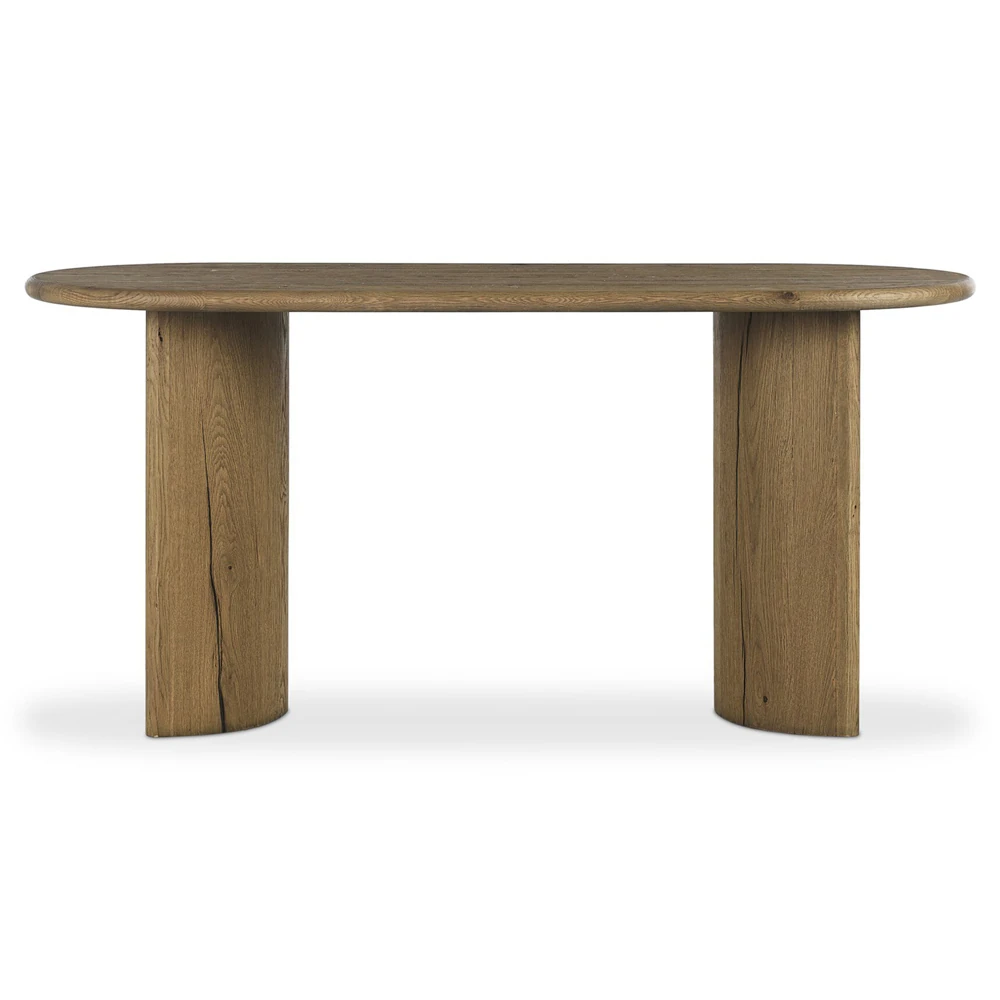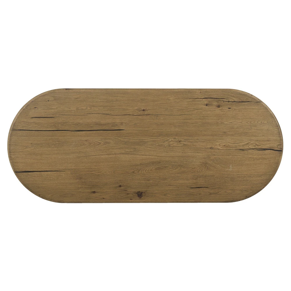 • Features crescent-shaped legs and a long oval tabletop crafted from light worn oak