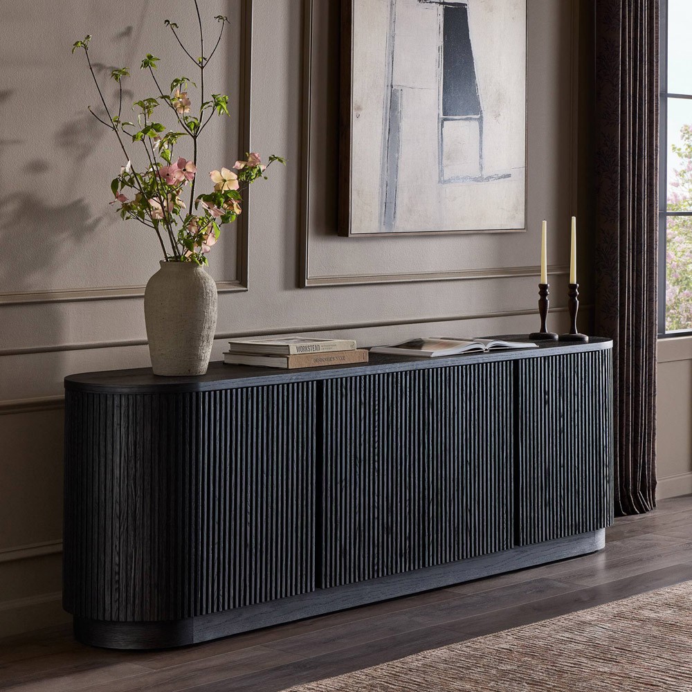 • Manvel Modern Classic Smoked Black Oak Media Cabinet - 85"|Kathy Kuo Home