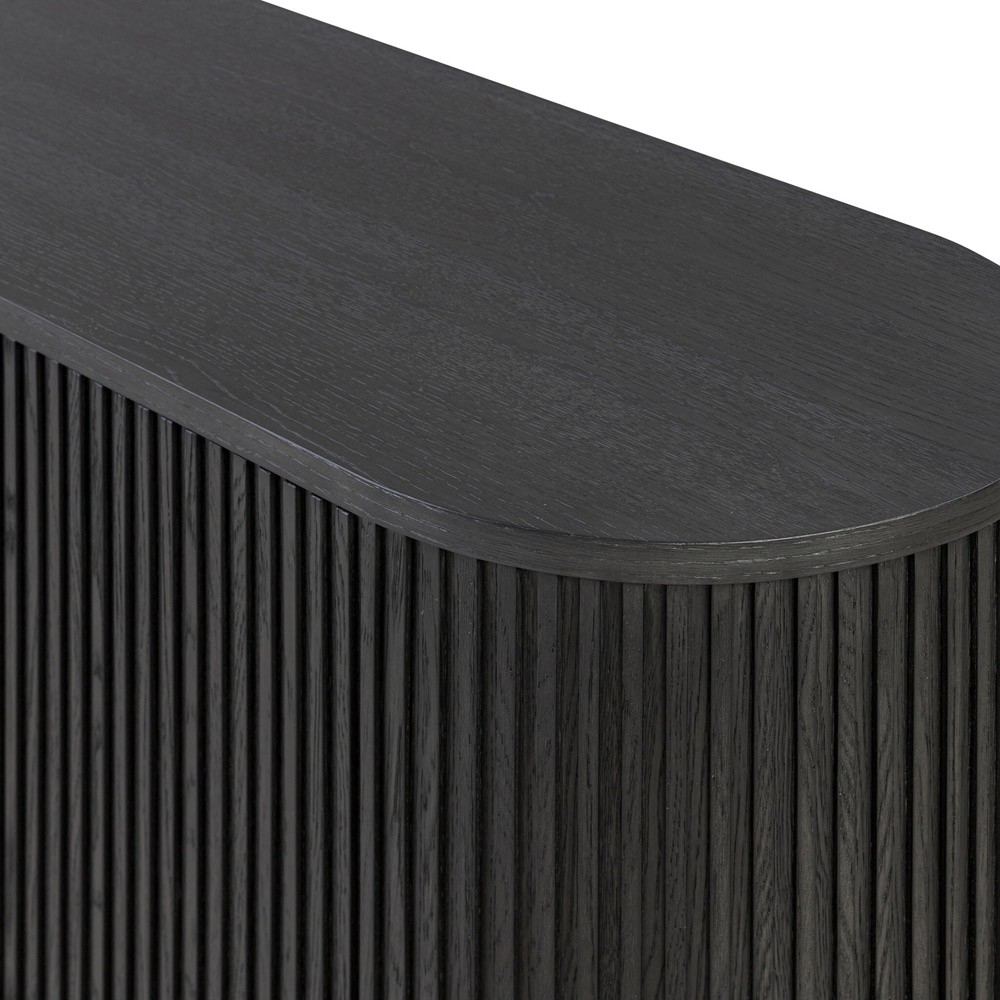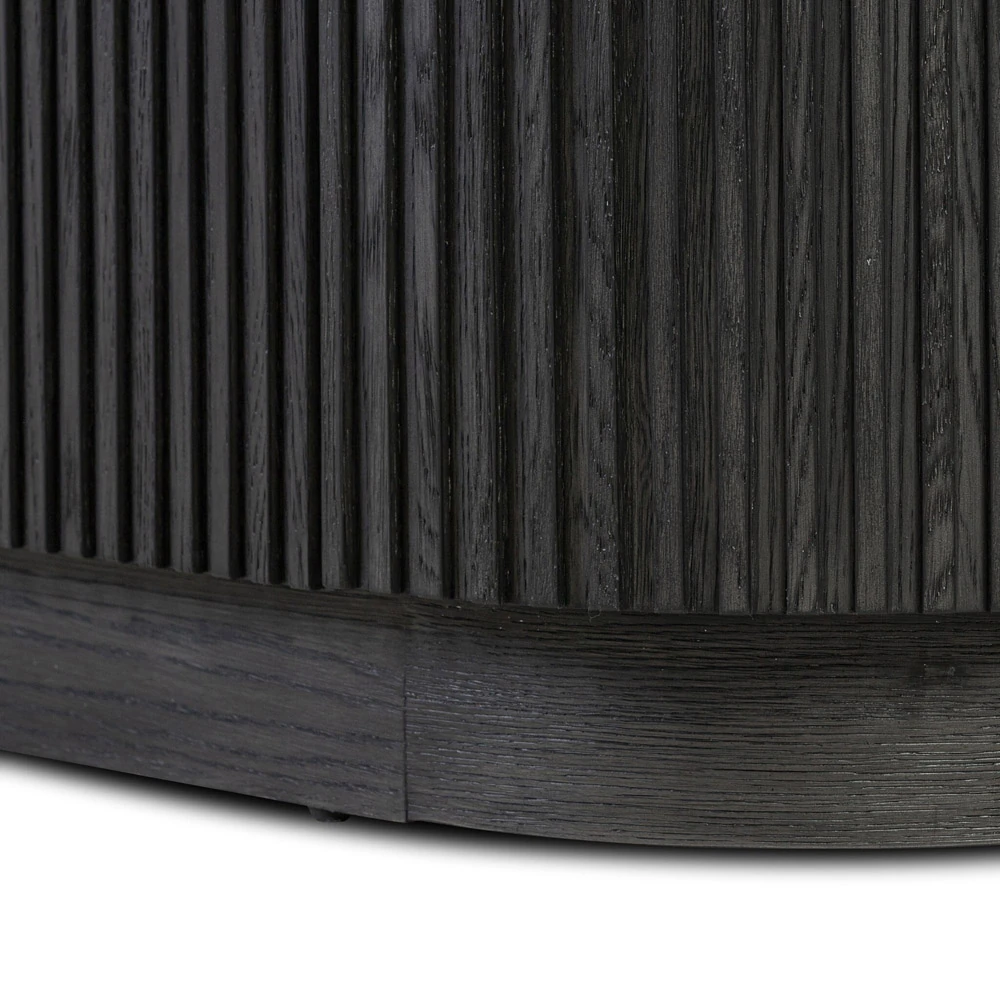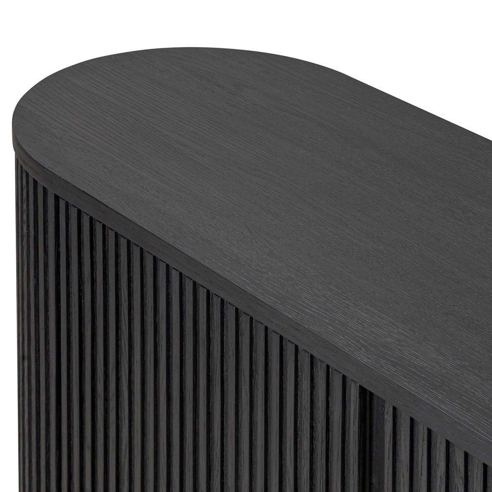 • Features desert oak solids and veneers with a plinth-style base, rounded sides, linear reeding, and a fully finished interior with shelves.