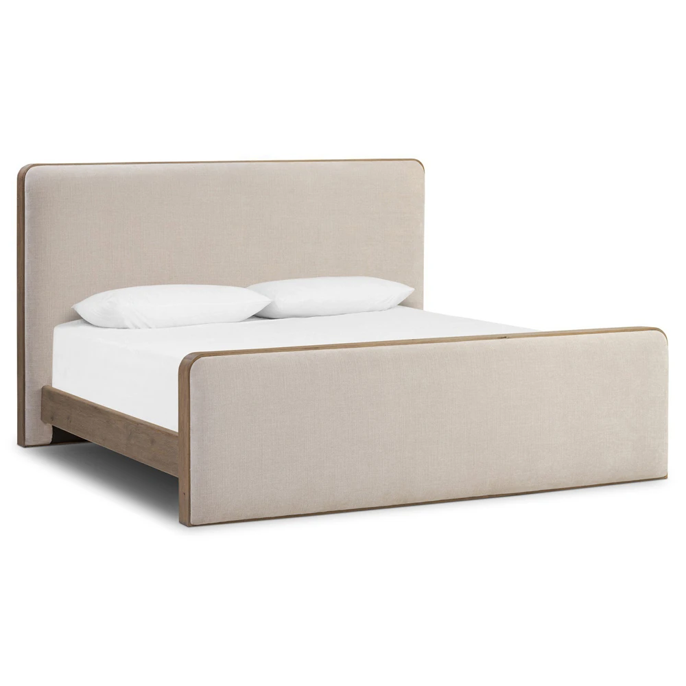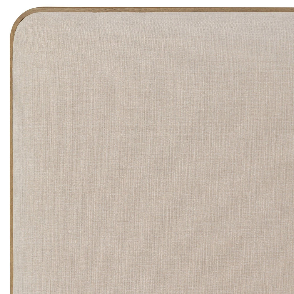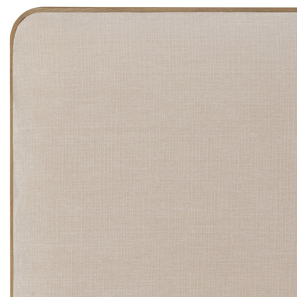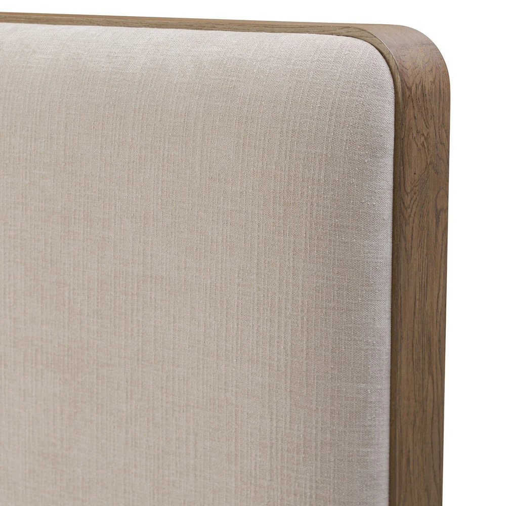 • Features aged solid oak framing upholstered head and footboards with soft contours and subtly rounded corners for a versatile, timeless bedroom design