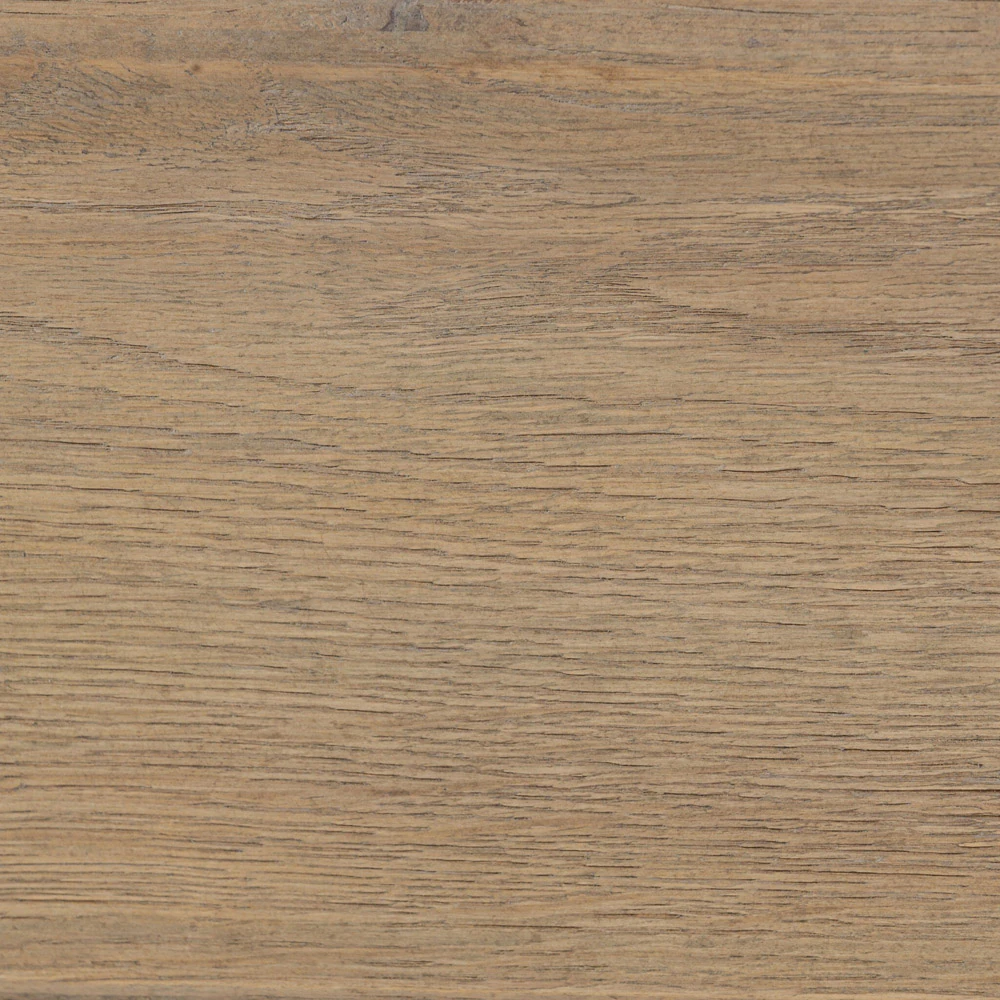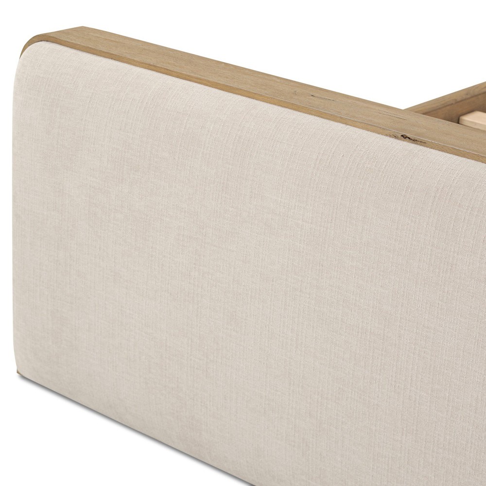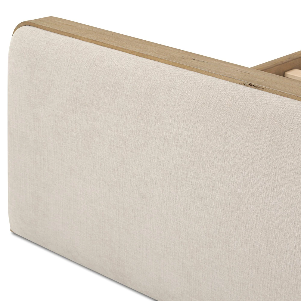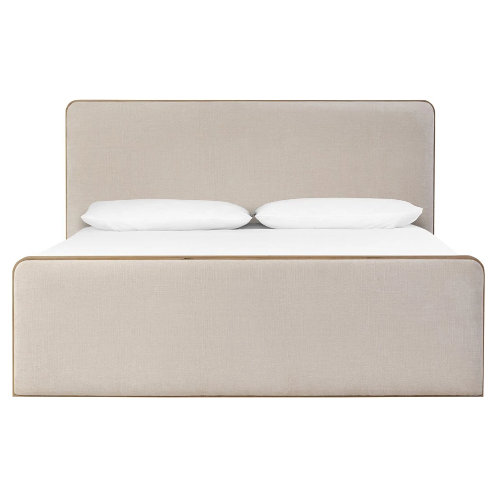 • Features aged solid oak framing upholstered head and footboards with soft contours and subtly rounded corners for a versatile, timeless bedroom design