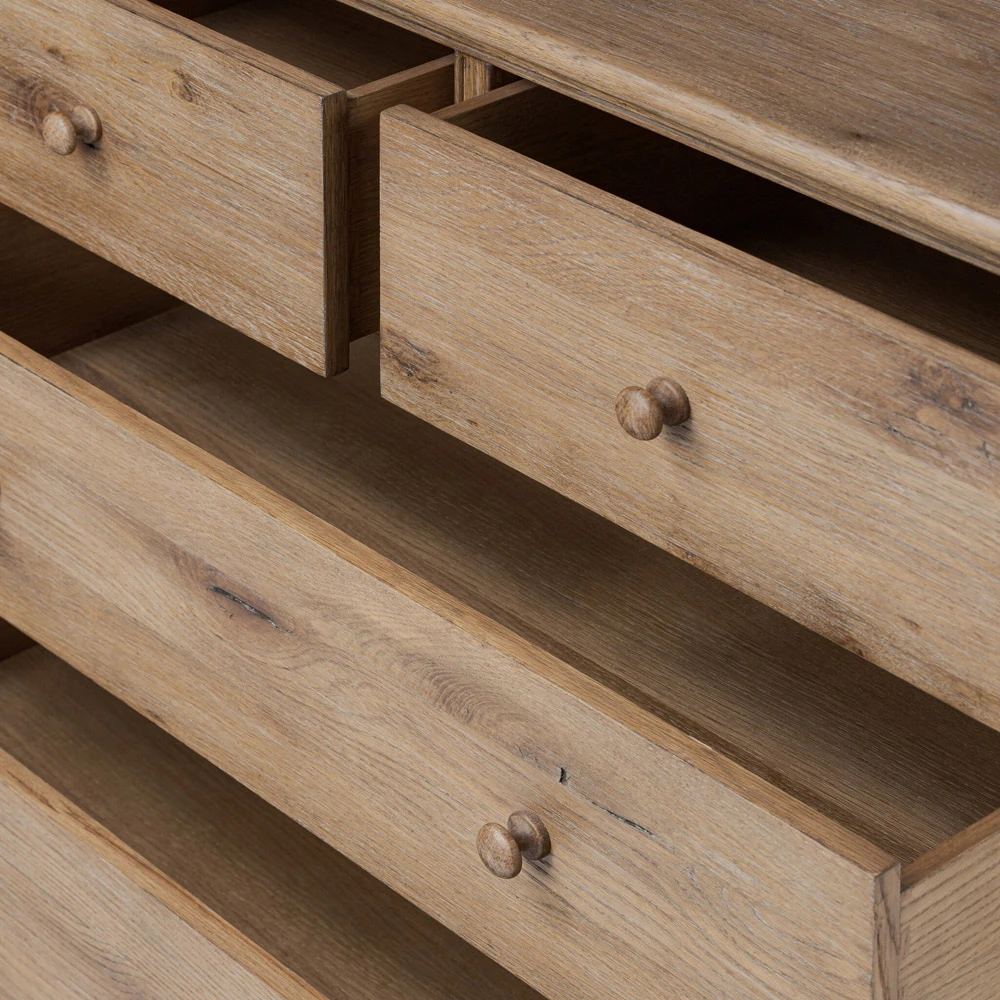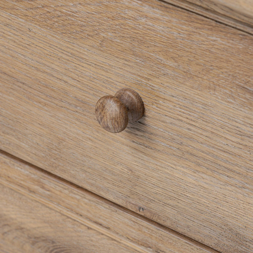 • Features heavy weathered oak construction with natural cracks and graining, beaded drawer fronts, and turned wood hardware