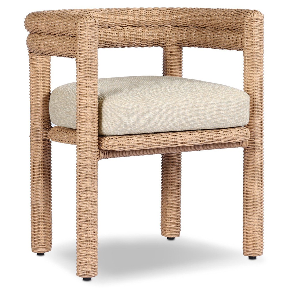 • Sienna White Canvas Cushion Brown Faux Rattan Woven Outdoor Dining Arm Chair|Kathy Kuo Home