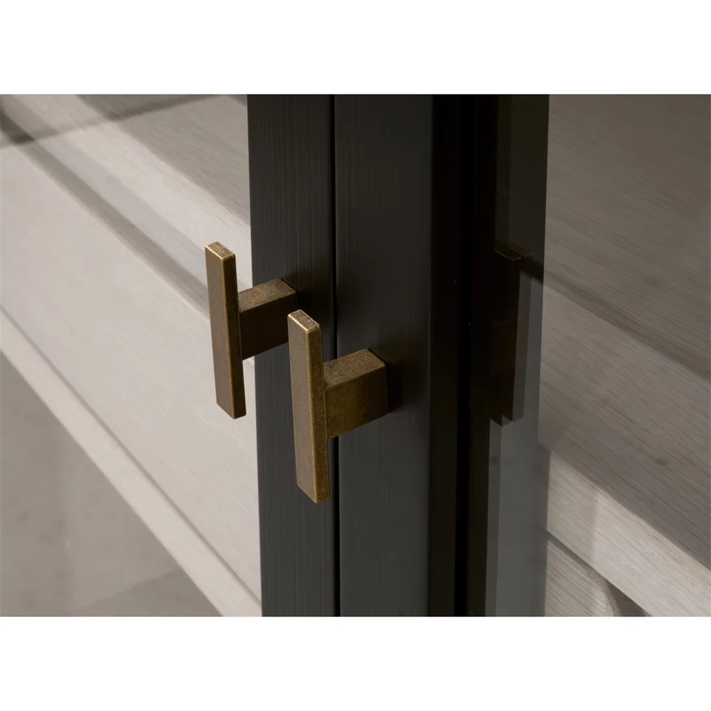• Stancil Industrial Brown Oak Wood Black Iron Clear Glass Door Arch Display Case|Kathy Kuo Home