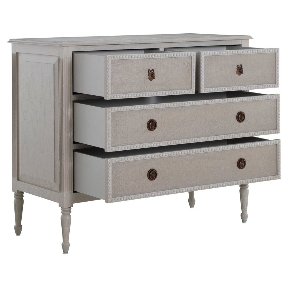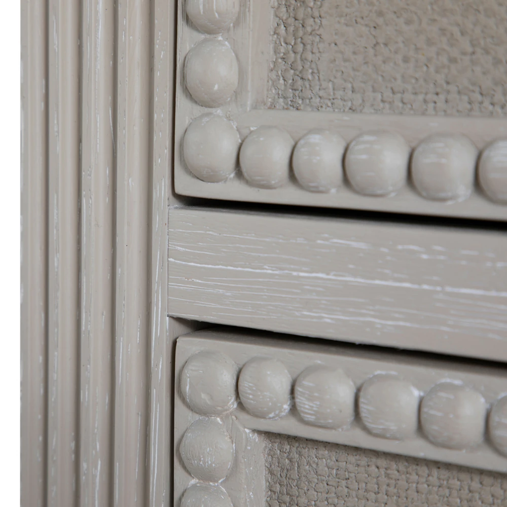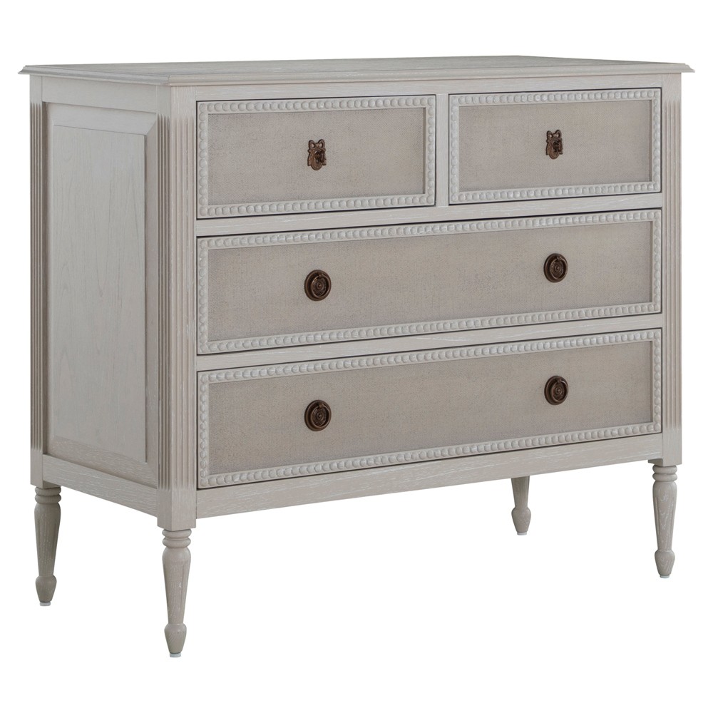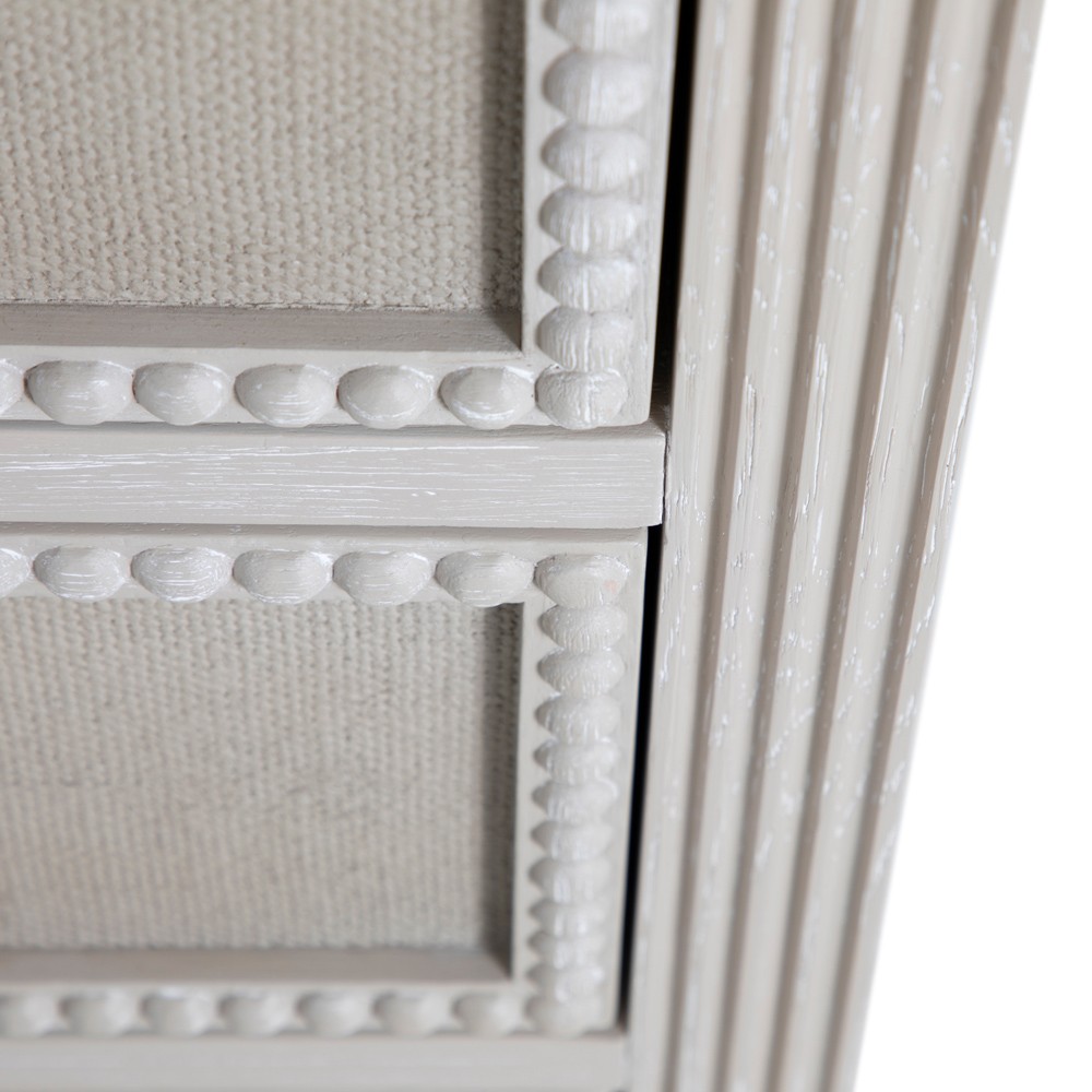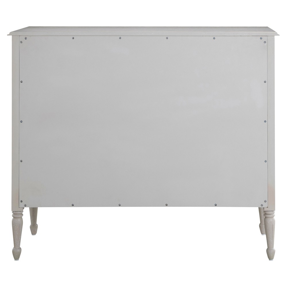 • Features textured painted white burlap drawer fronts, antique-style hardware and turned legs