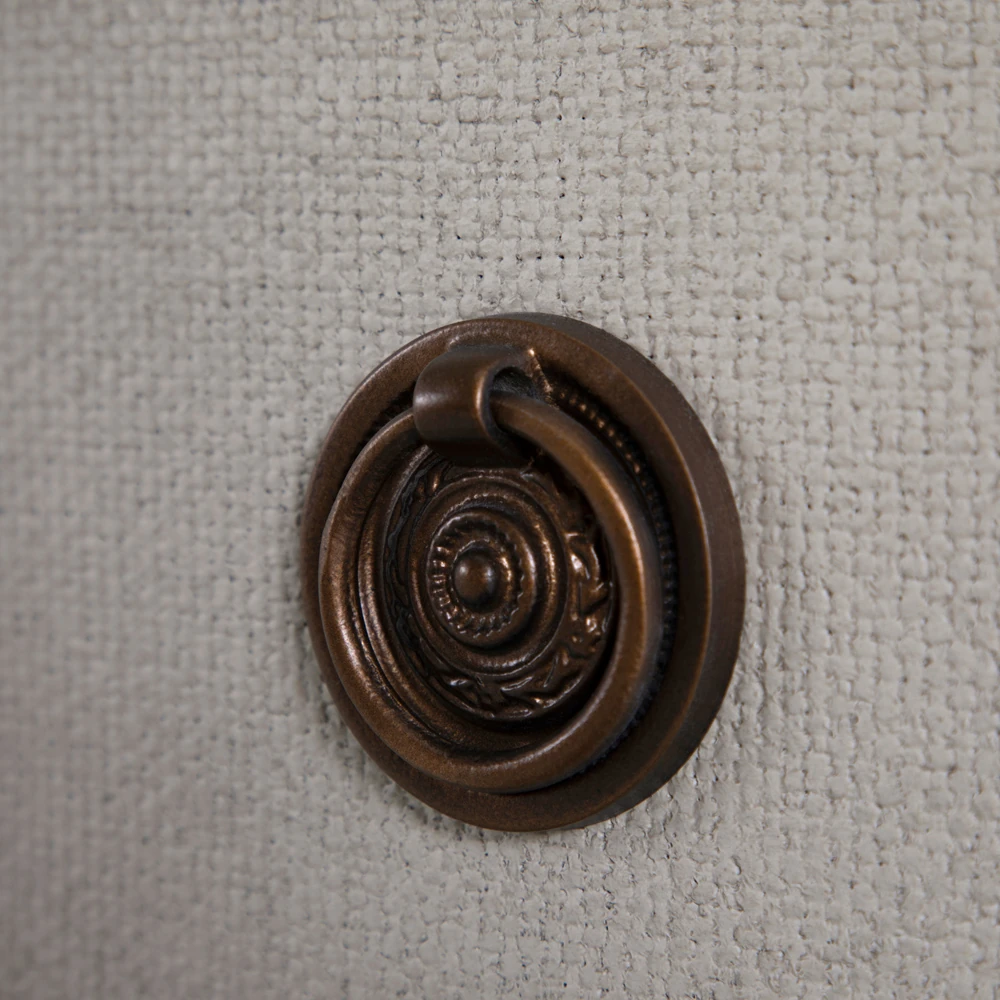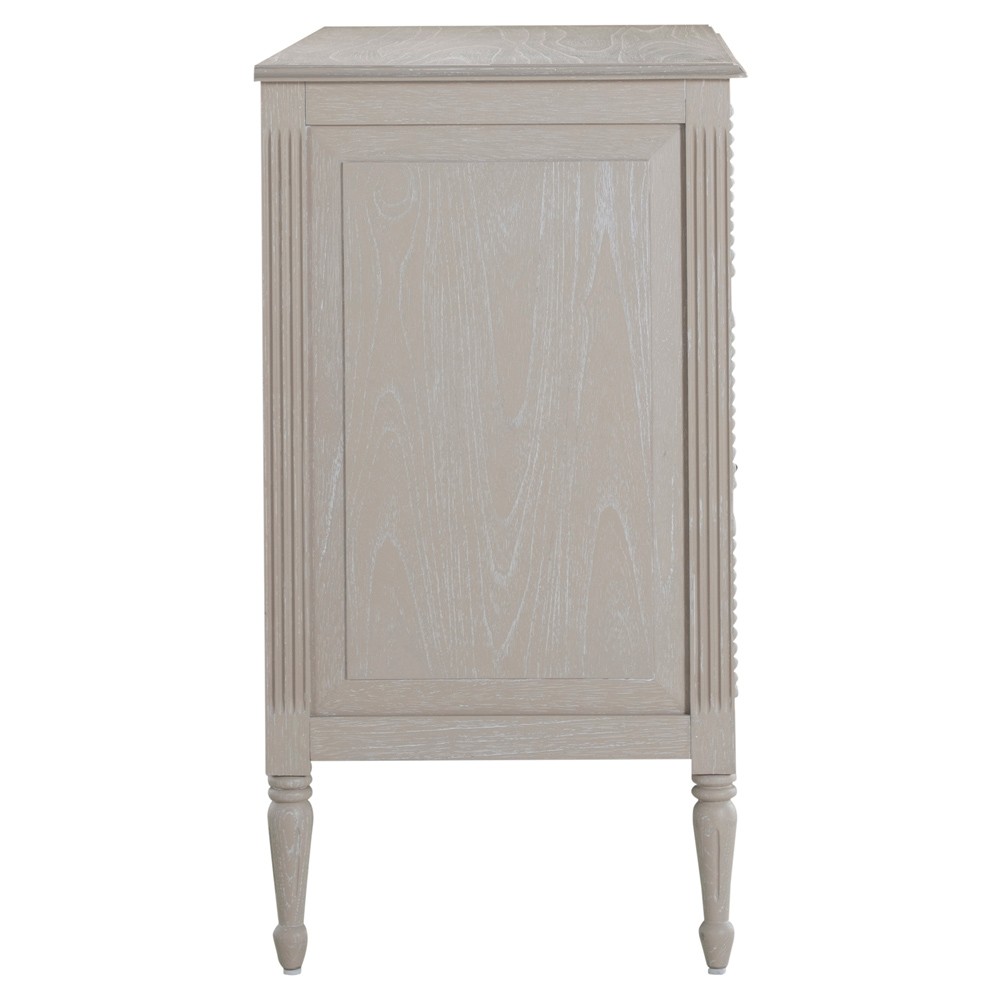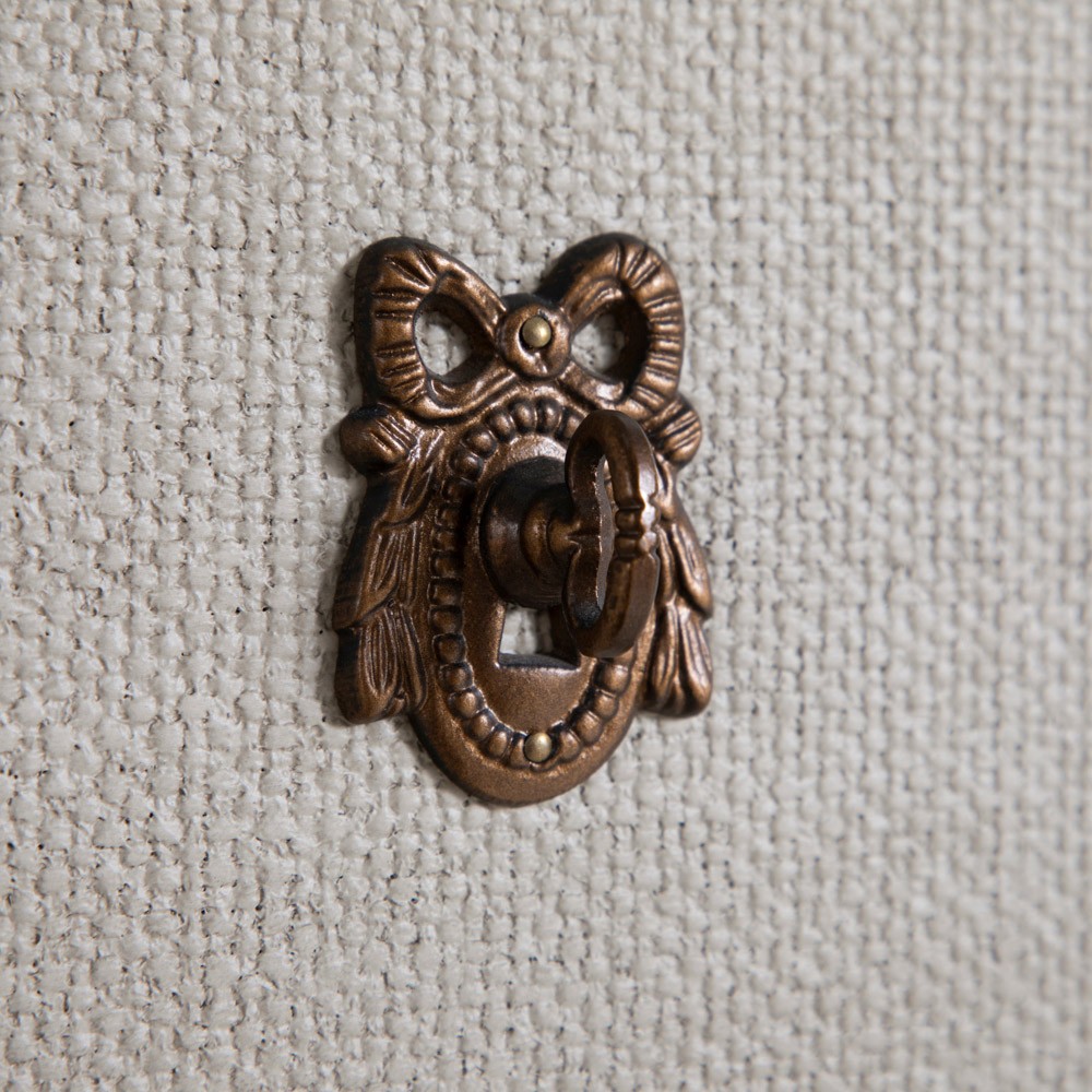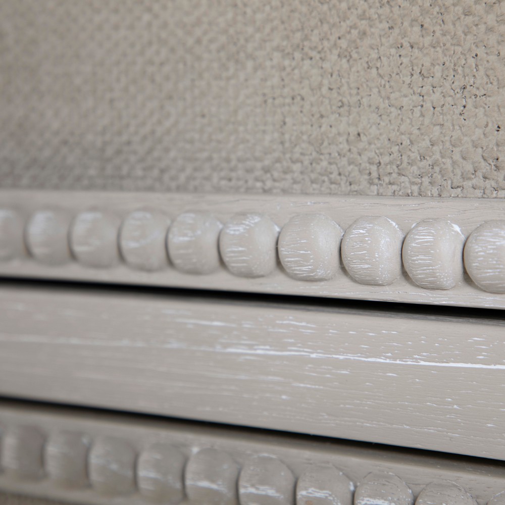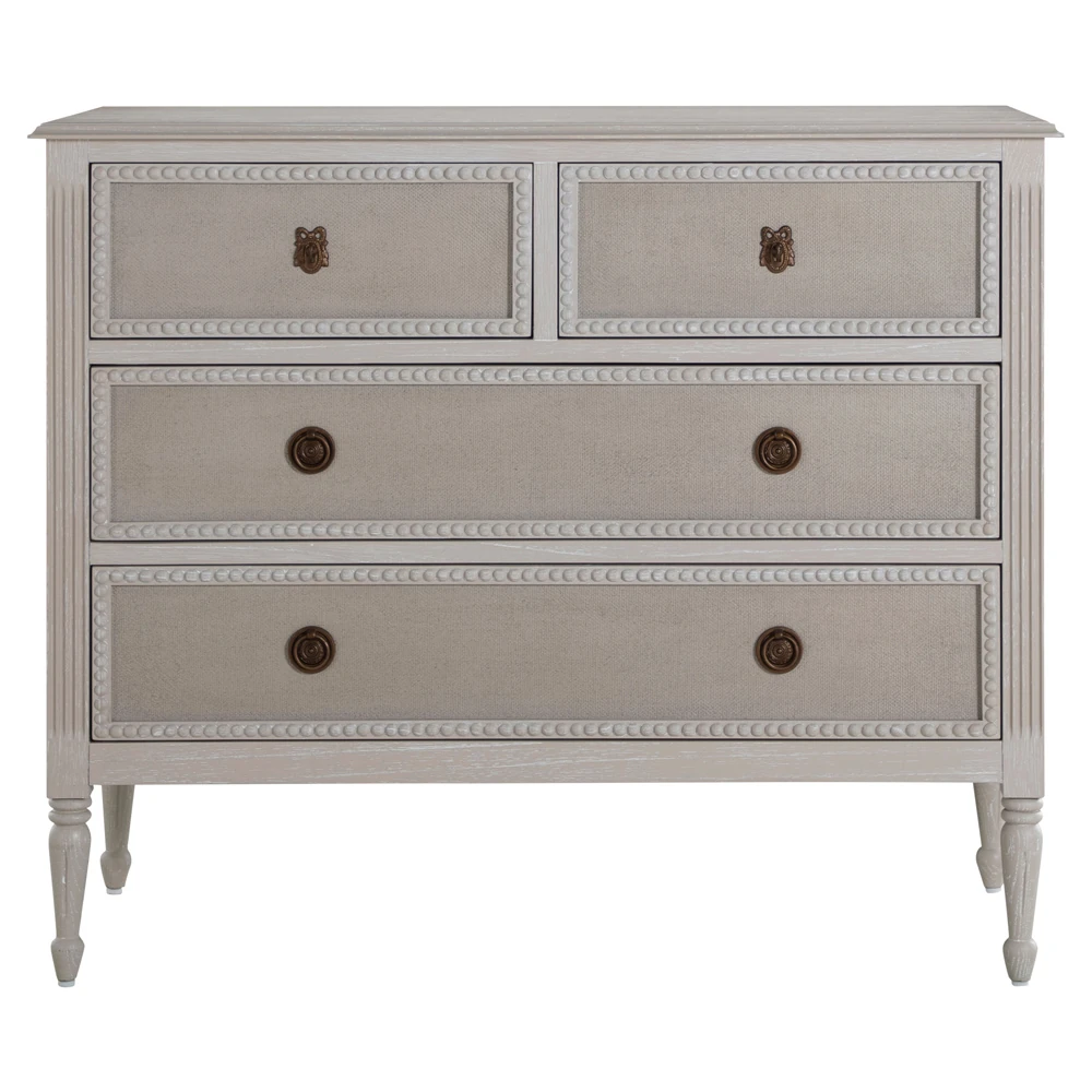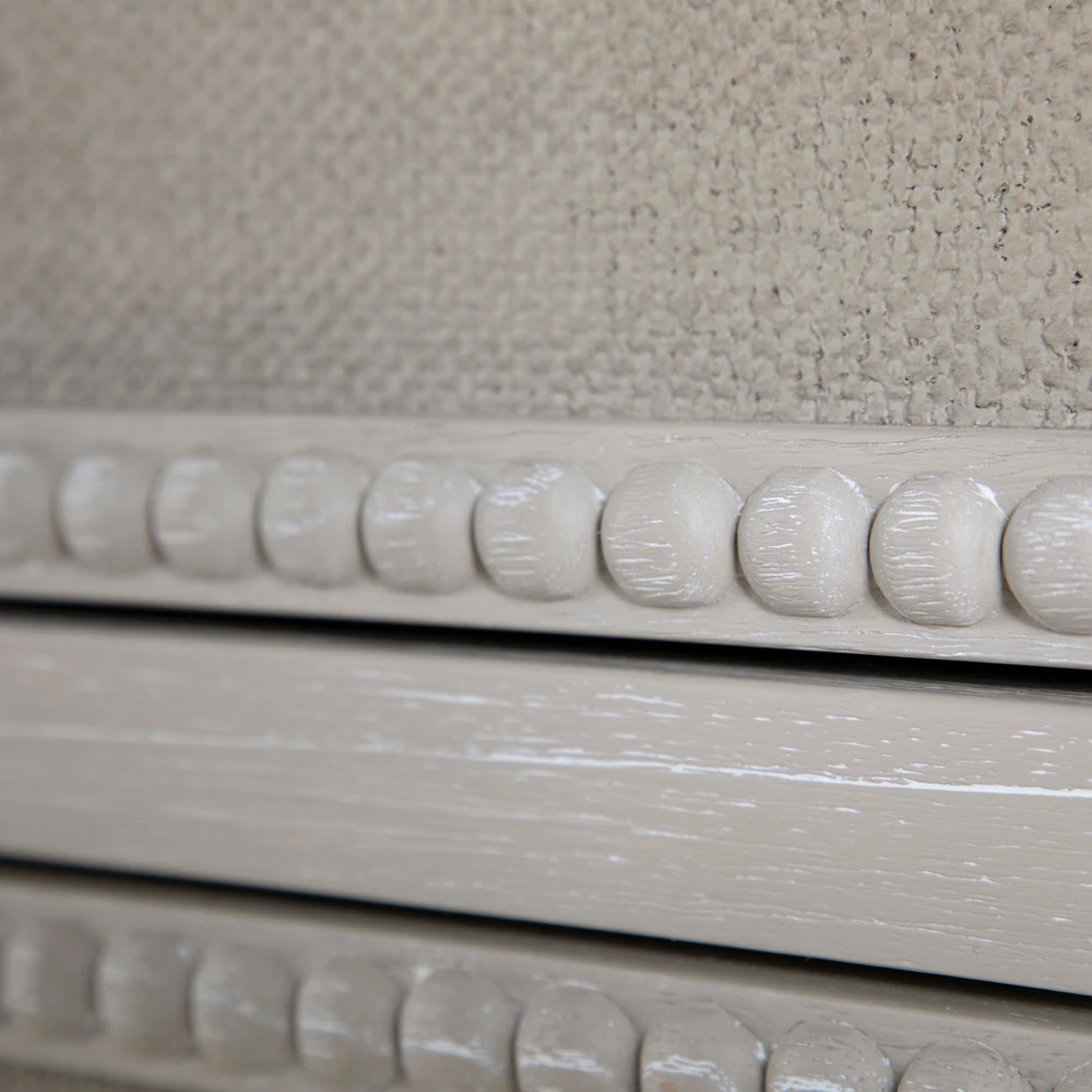 • Features textured painted white burlap drawer fronts, antique-style hardware and turned legs