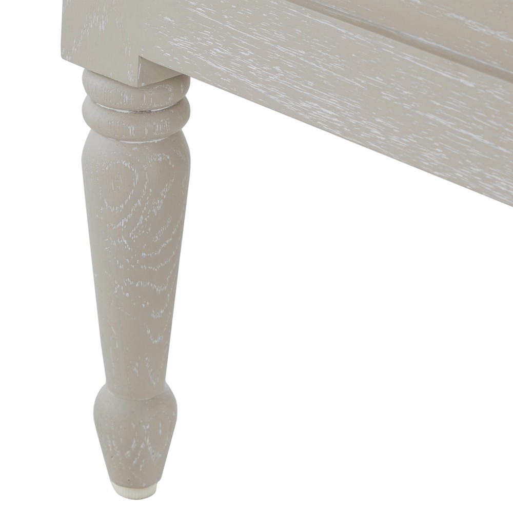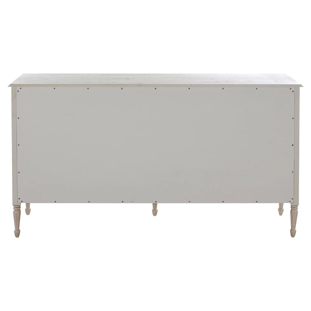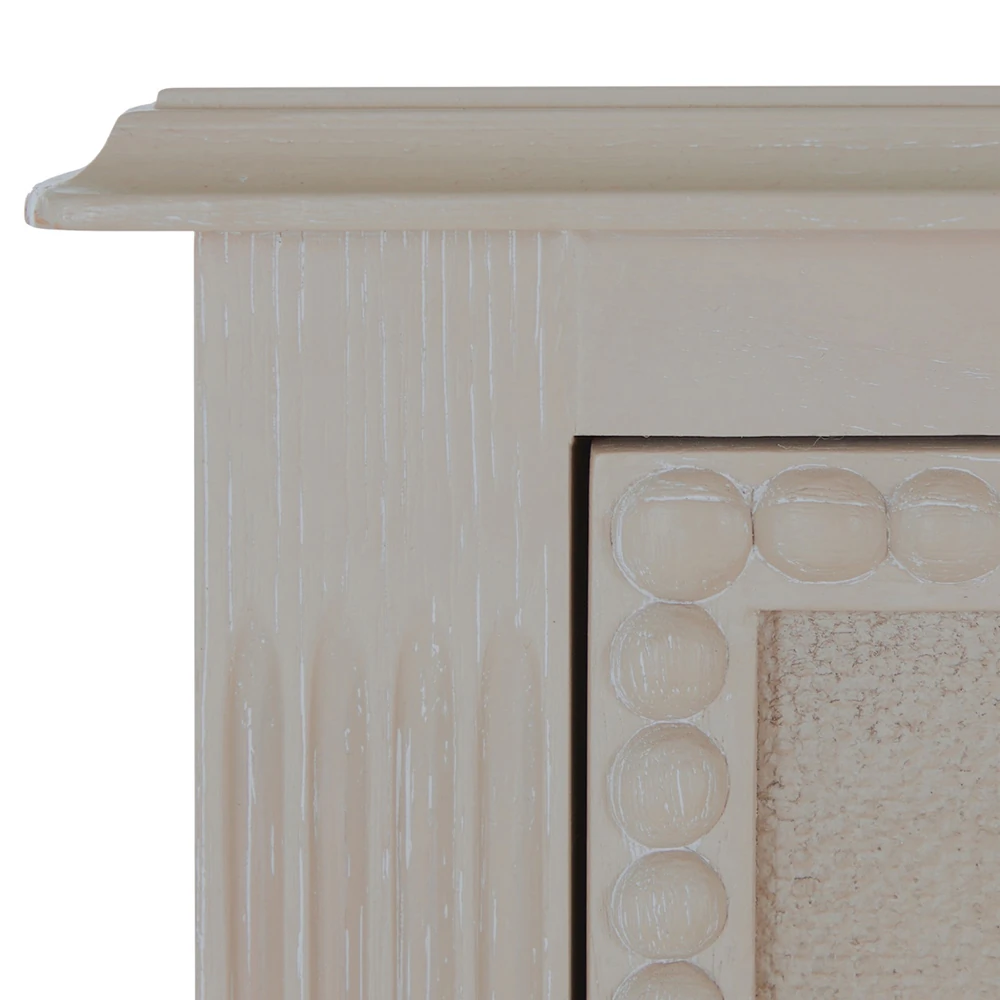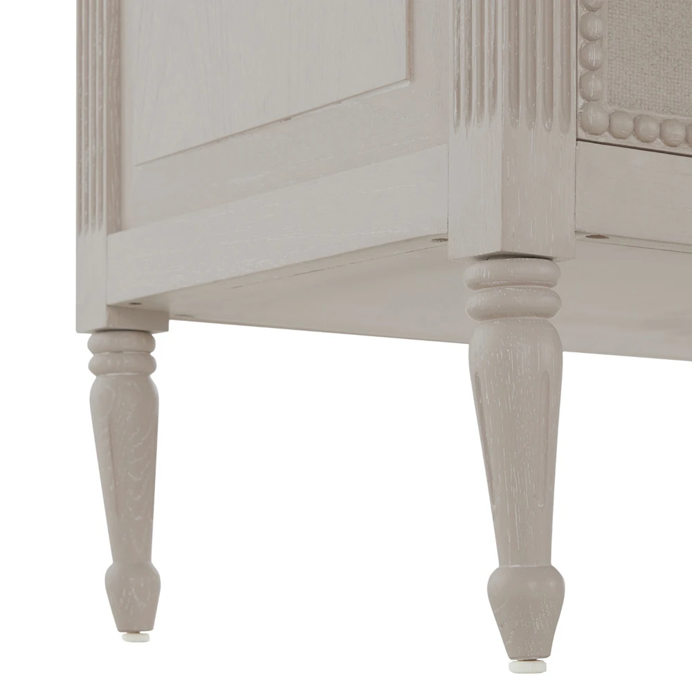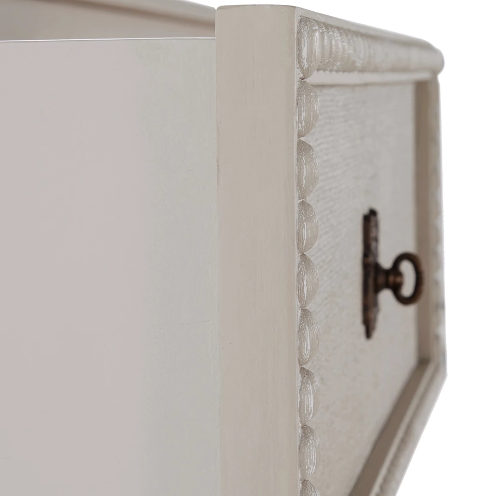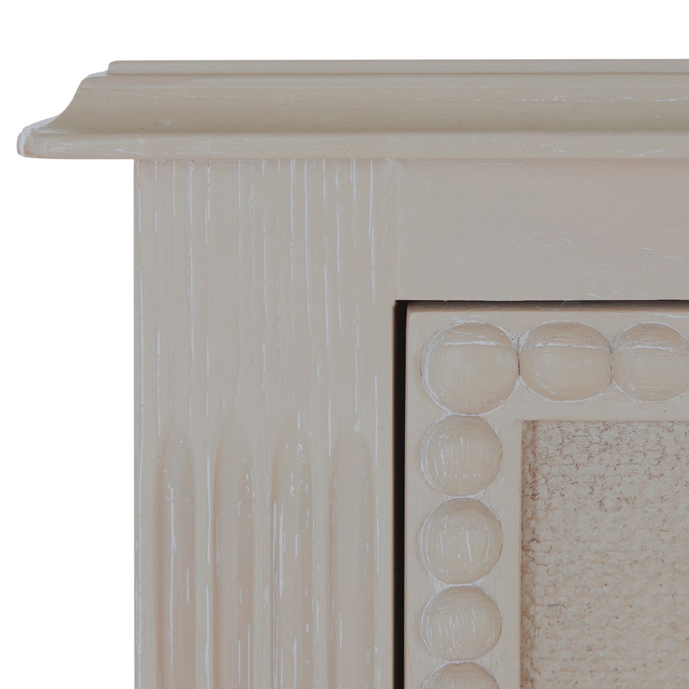 • Features textured painted white burlap drawer fronts, antique-style hardware and turned legs