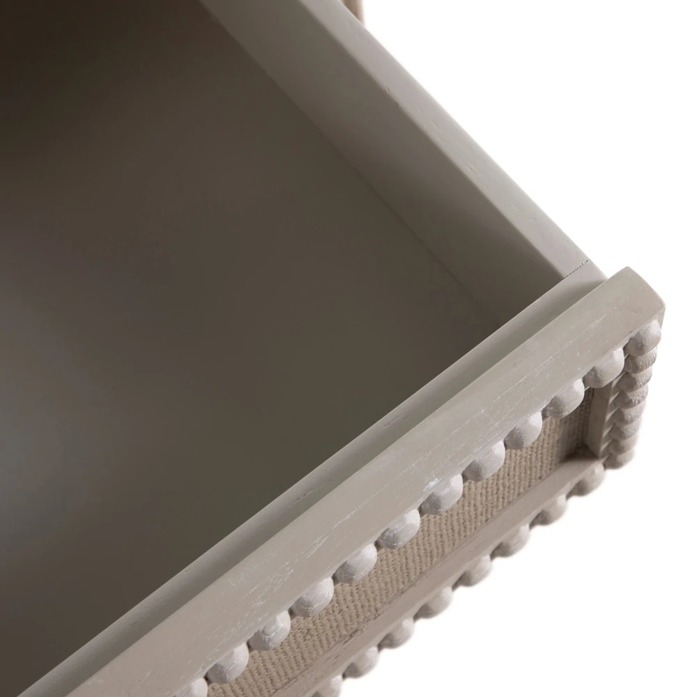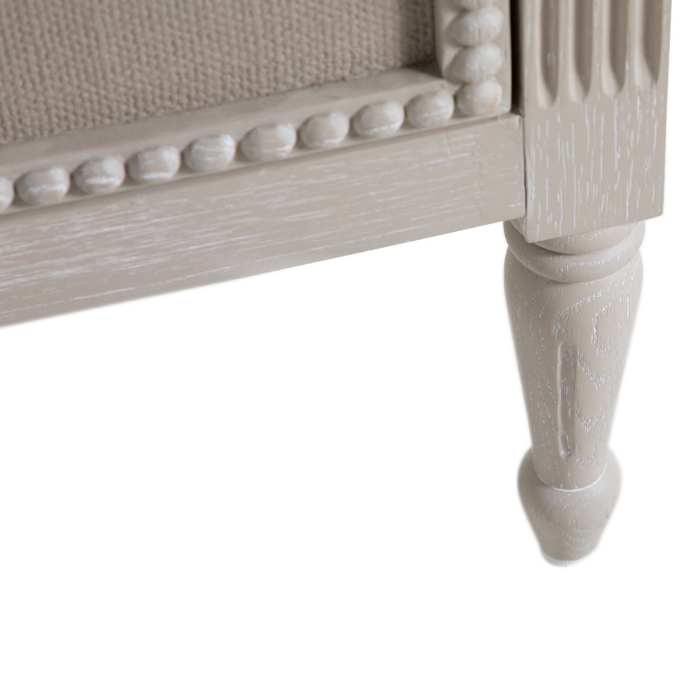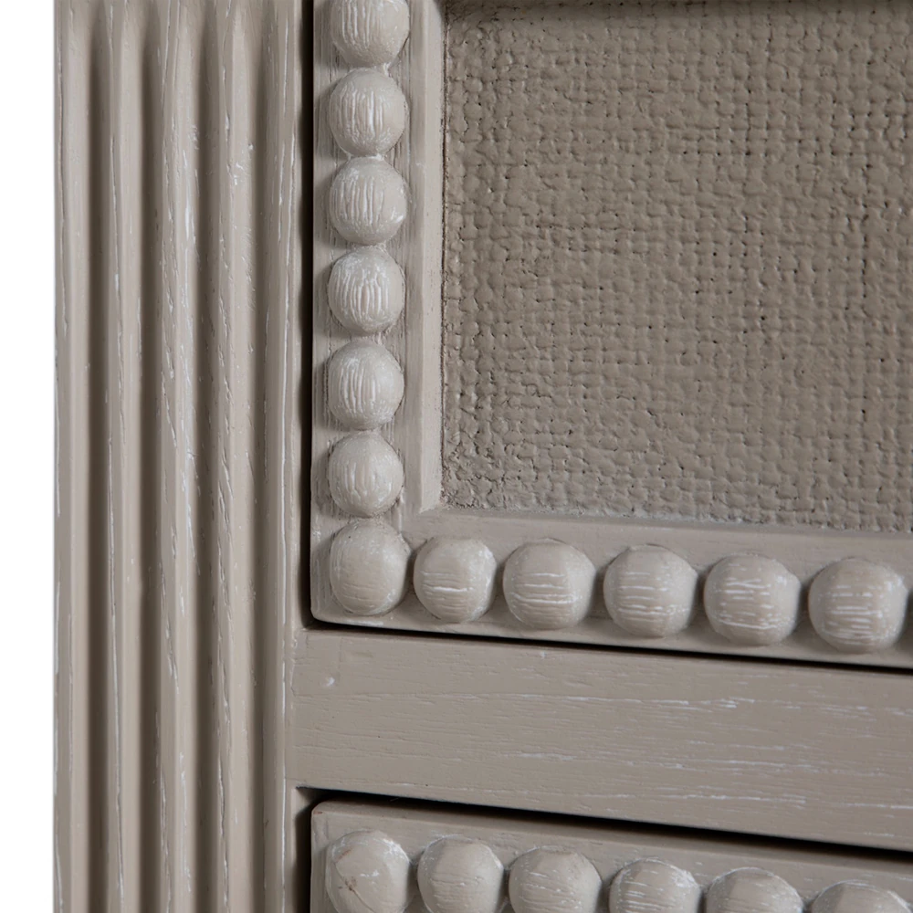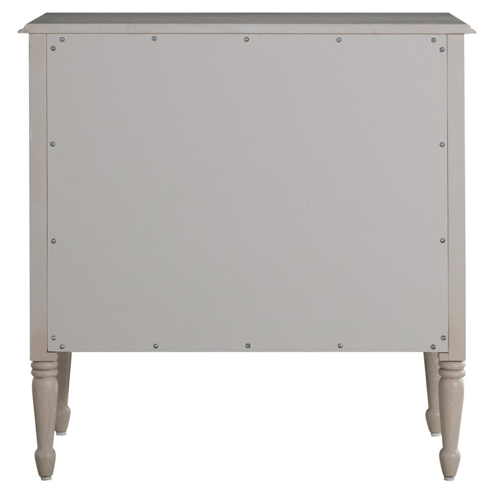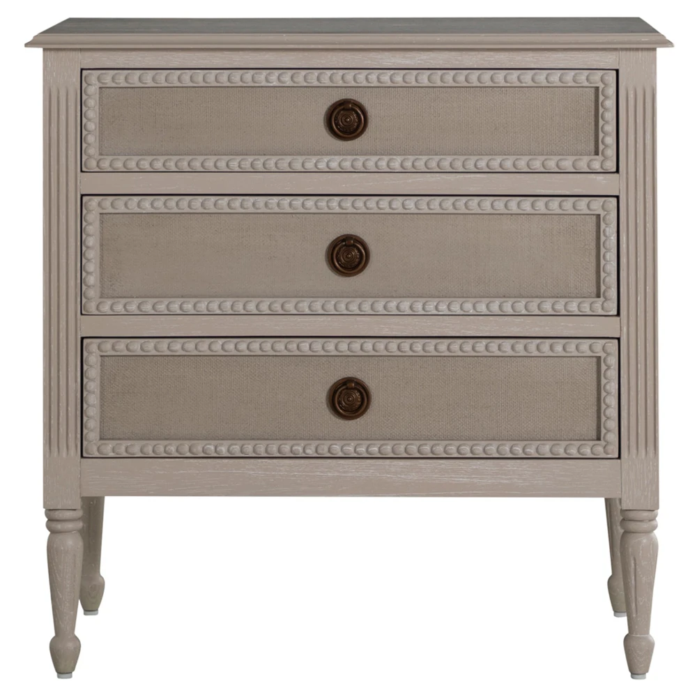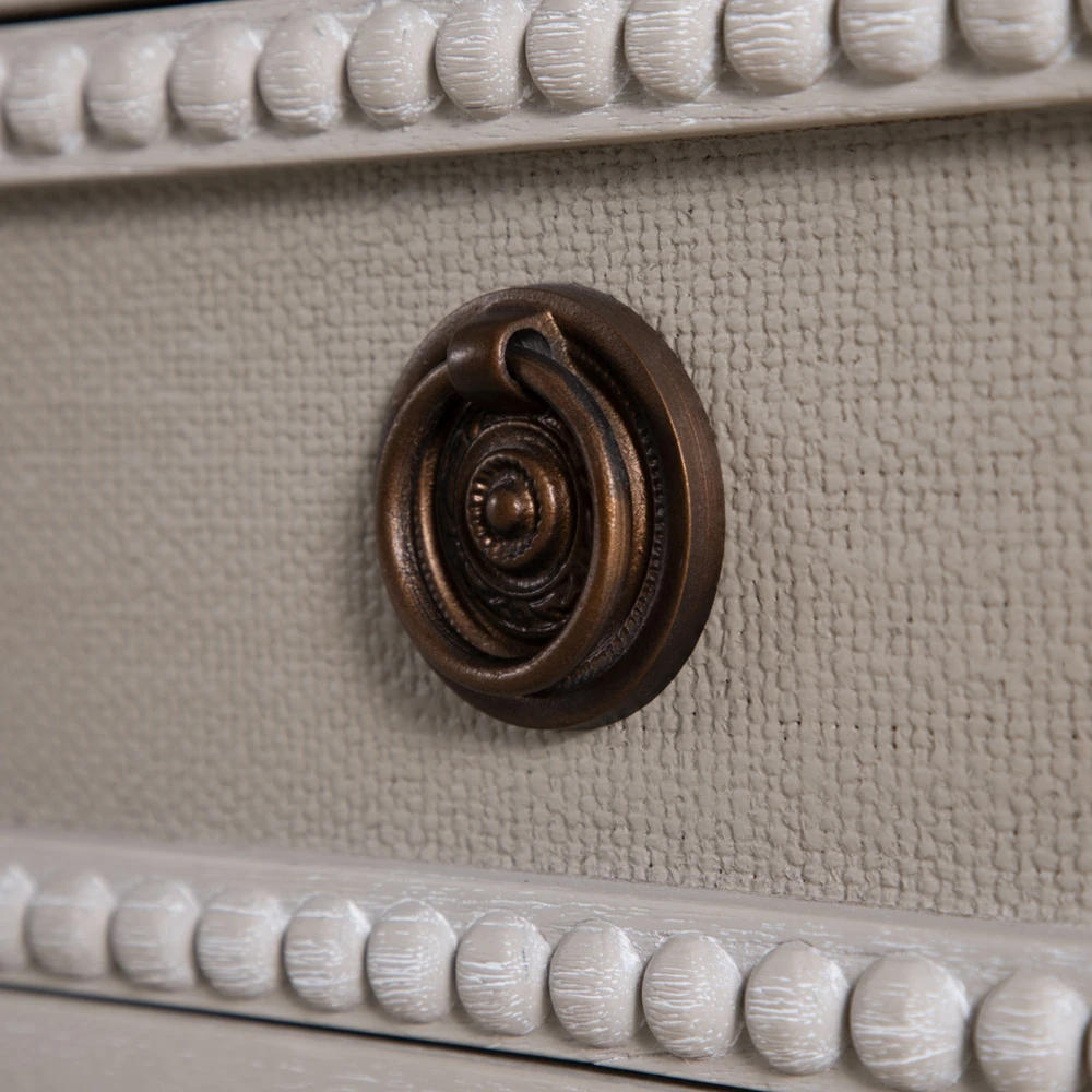 • Features textured painted white burlap drawer fronts, antique-style hardware and turned legs