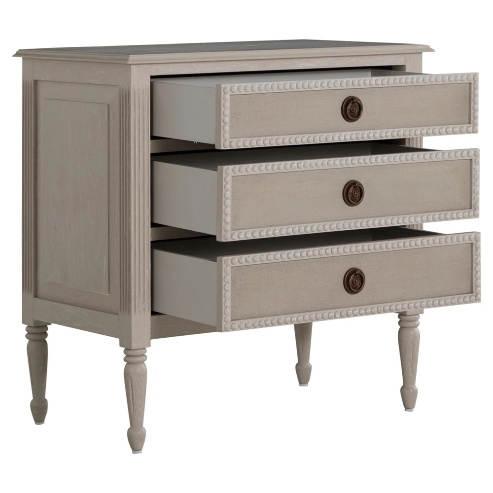 • Has 3 drawers with carved drawer trims