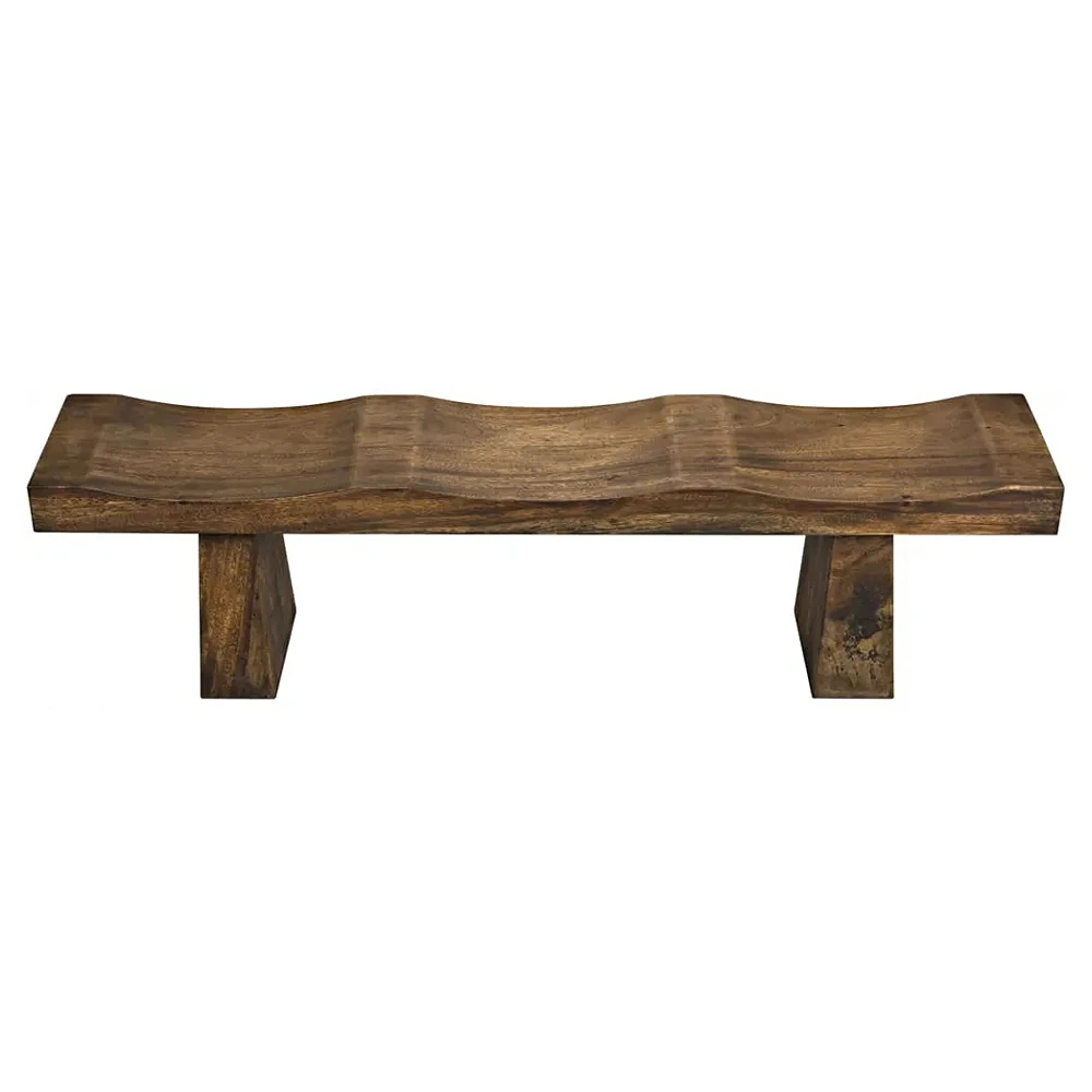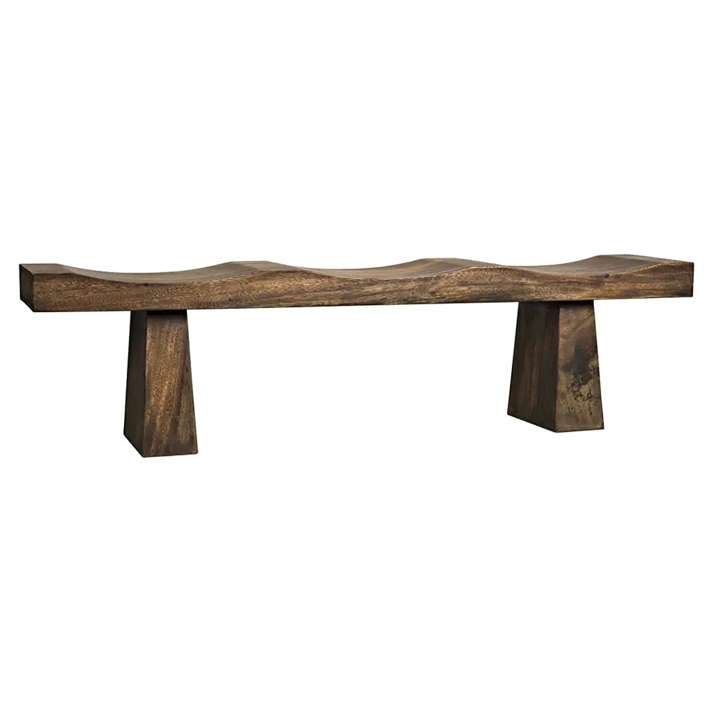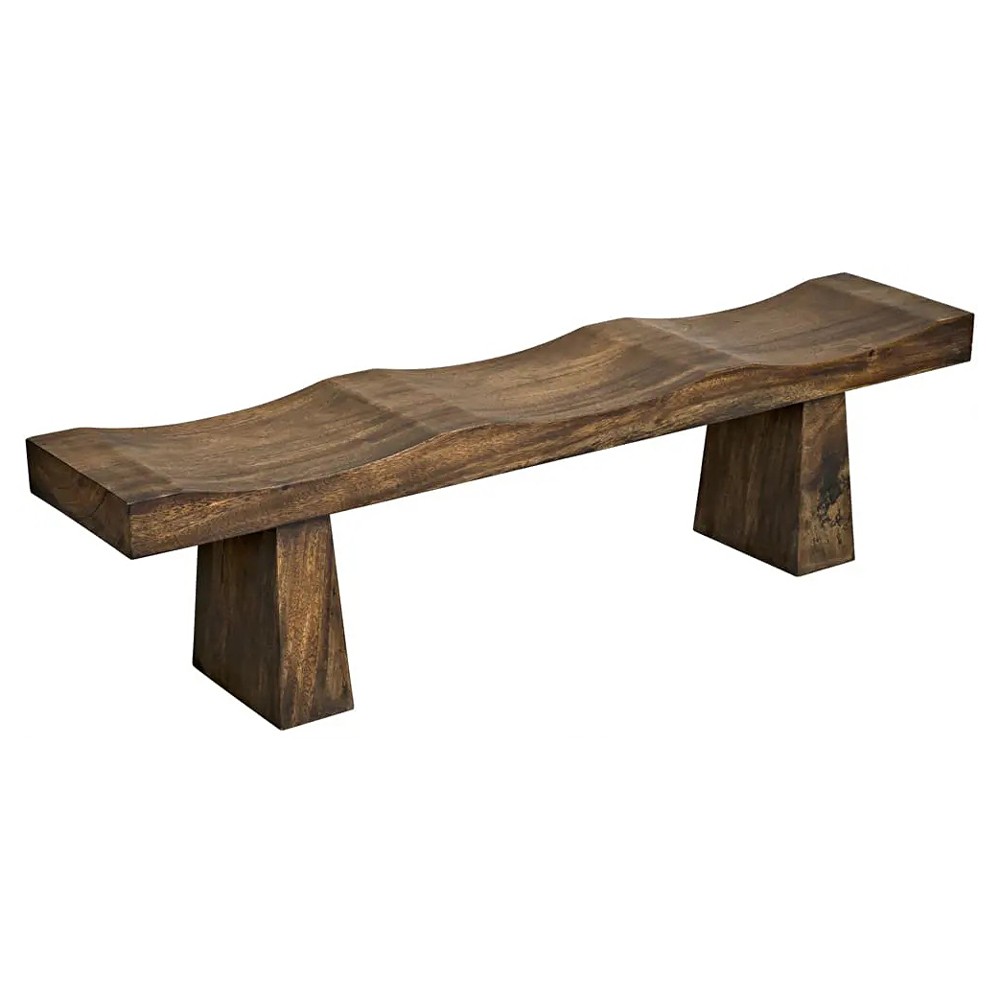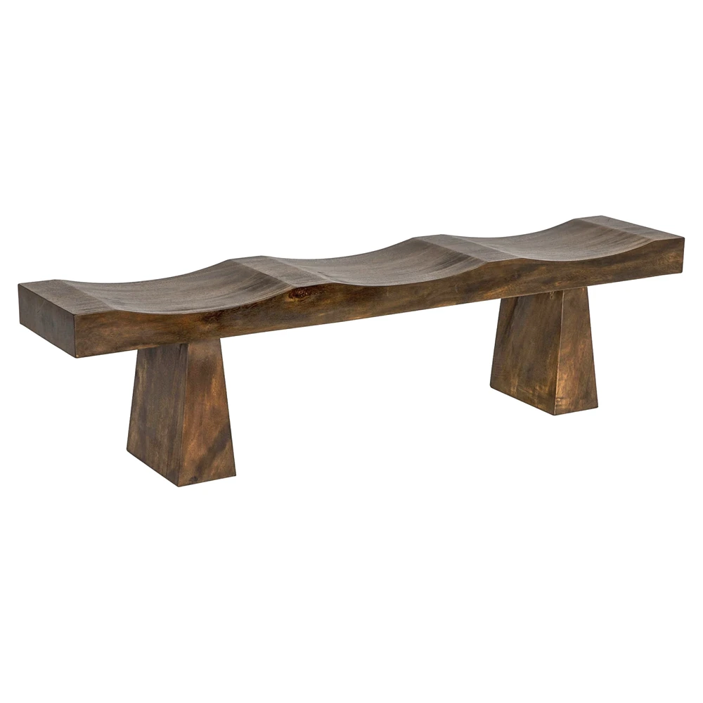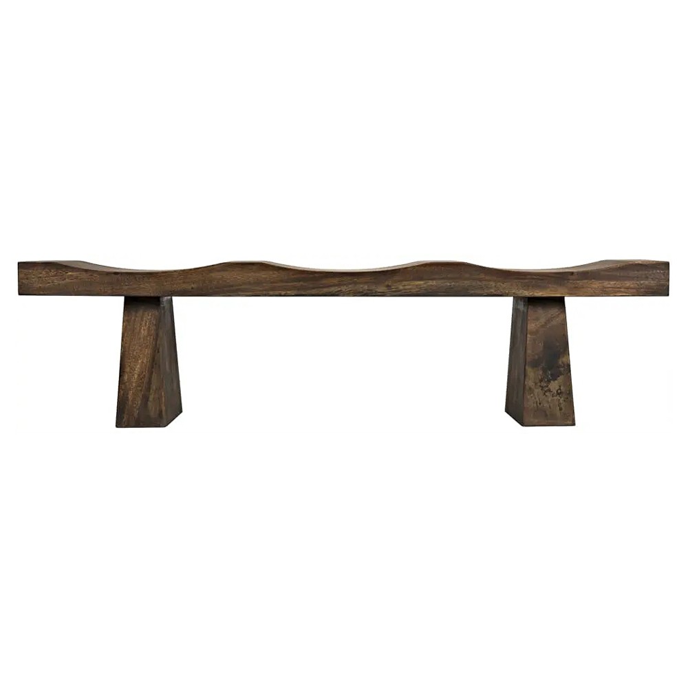 • Features bold blocky construction with tapered wedge feet, a 3-seat bench, and a finish that highlights the natural grain