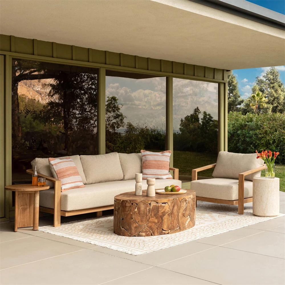 • Aviel Rustic Lodge Beige Upholstered Teak Outdoor Sofa - 96"|Kathy Kuo Home
