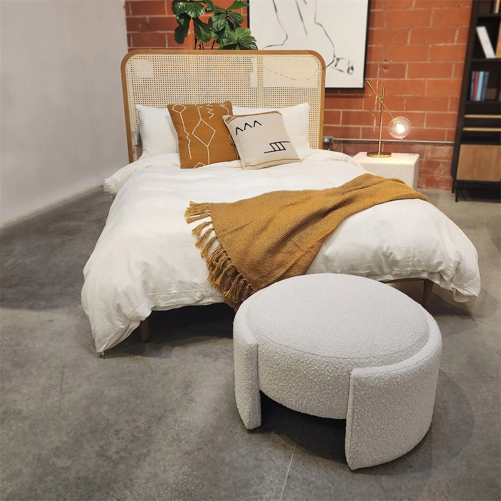 • Features a round frame with off-white boucle upholstery for enhanced comfort and multifunctional use as a footrest or display surface