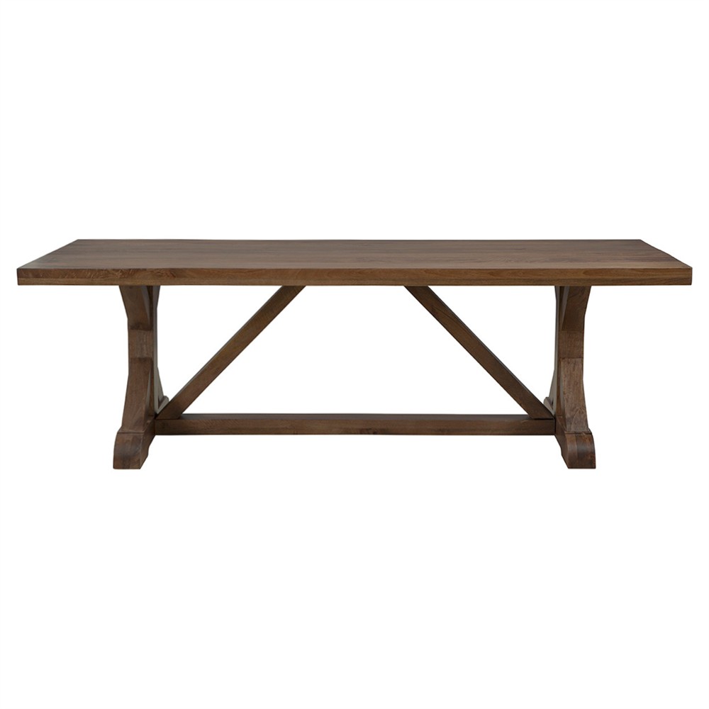 • Nayden Rustic Lodge Brown Pine Wood Oval Trestle Dining Table - Small - 86.5"W|Kathy Kuo Home