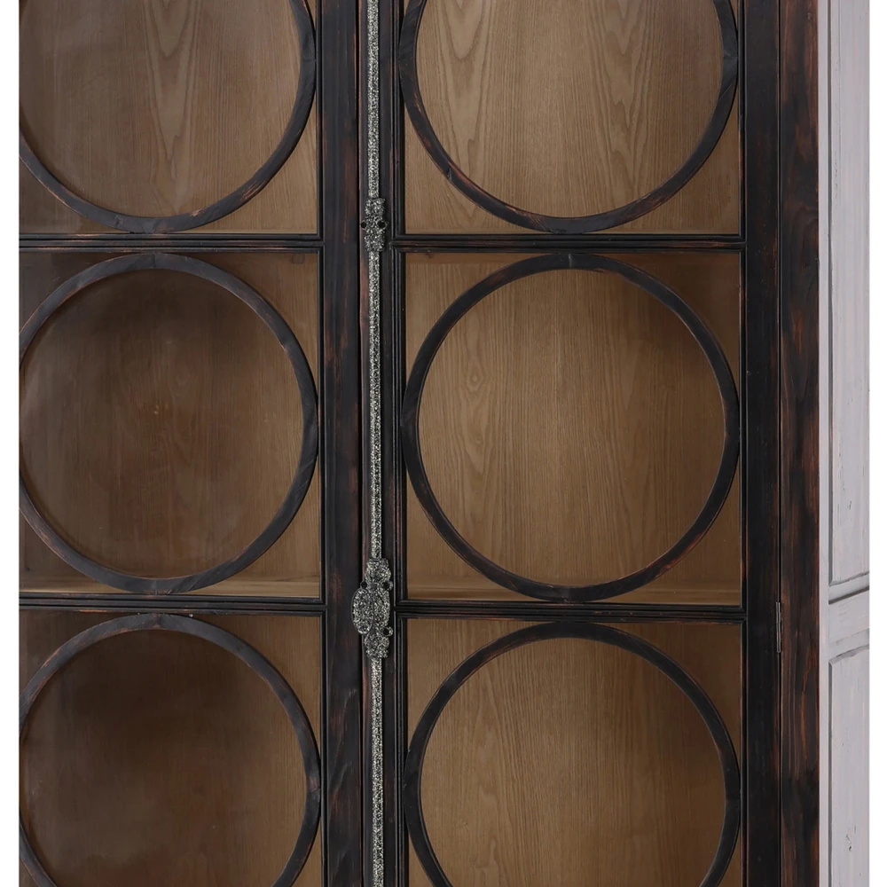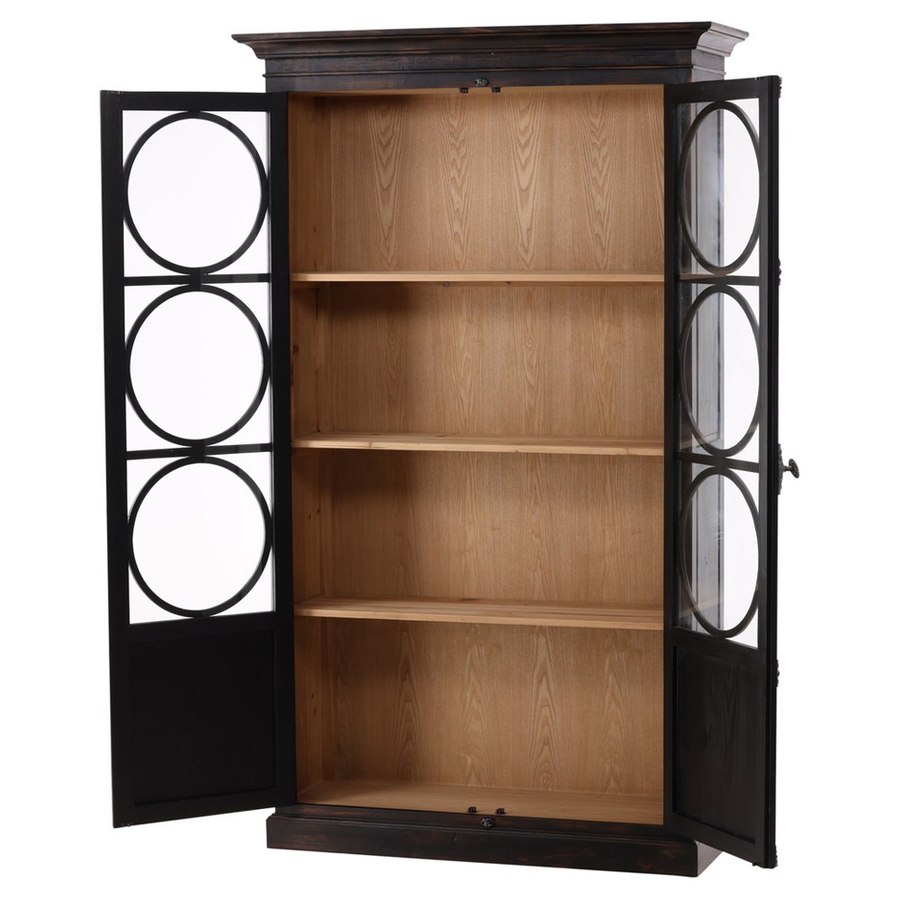 • Features a reclaimed fir frame with hand-painted black rub-through finish, natural wood interior and tempered glass panels