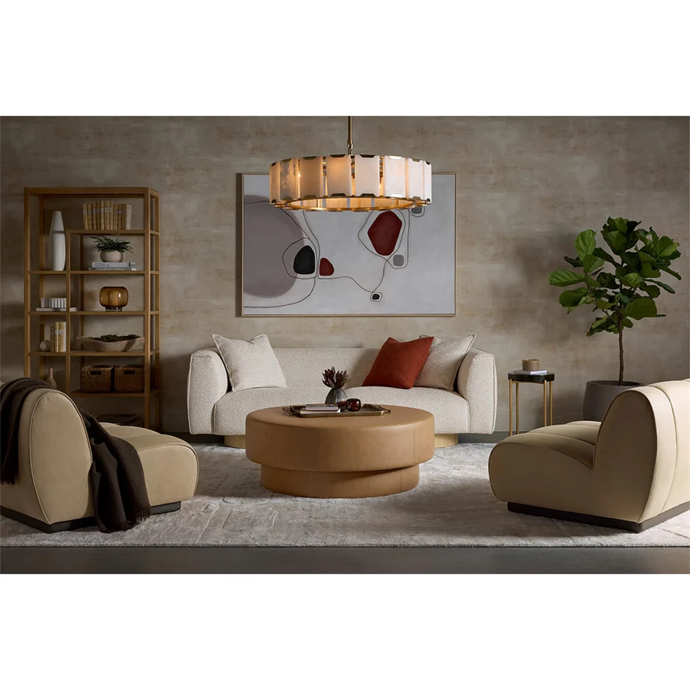 • Leith Modern Classic Cream Linen Boulder Brown Wood Round Ottoman|Kathy Kuo Home