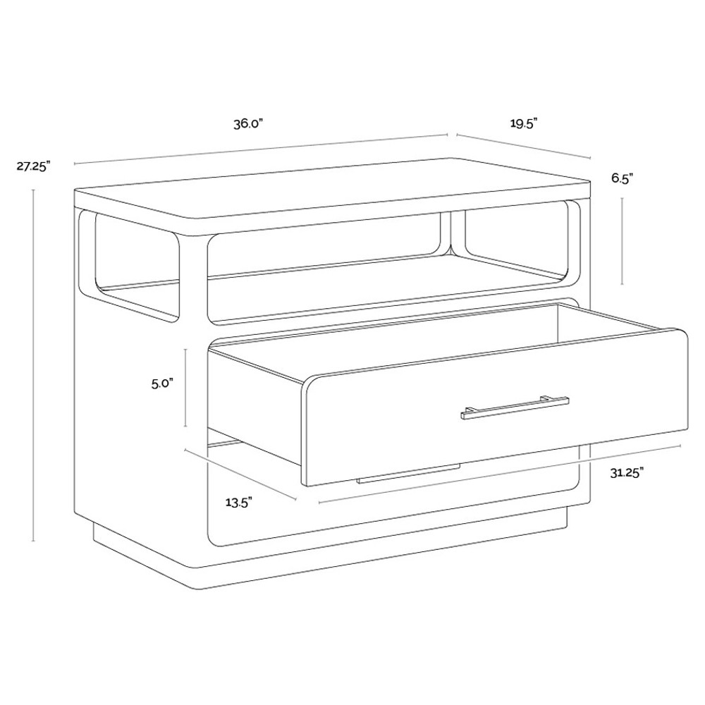 • Features 2 soft close drawers; Drawers open 3/4 way to prevent tipping an open top shelf provides extra space for added decor