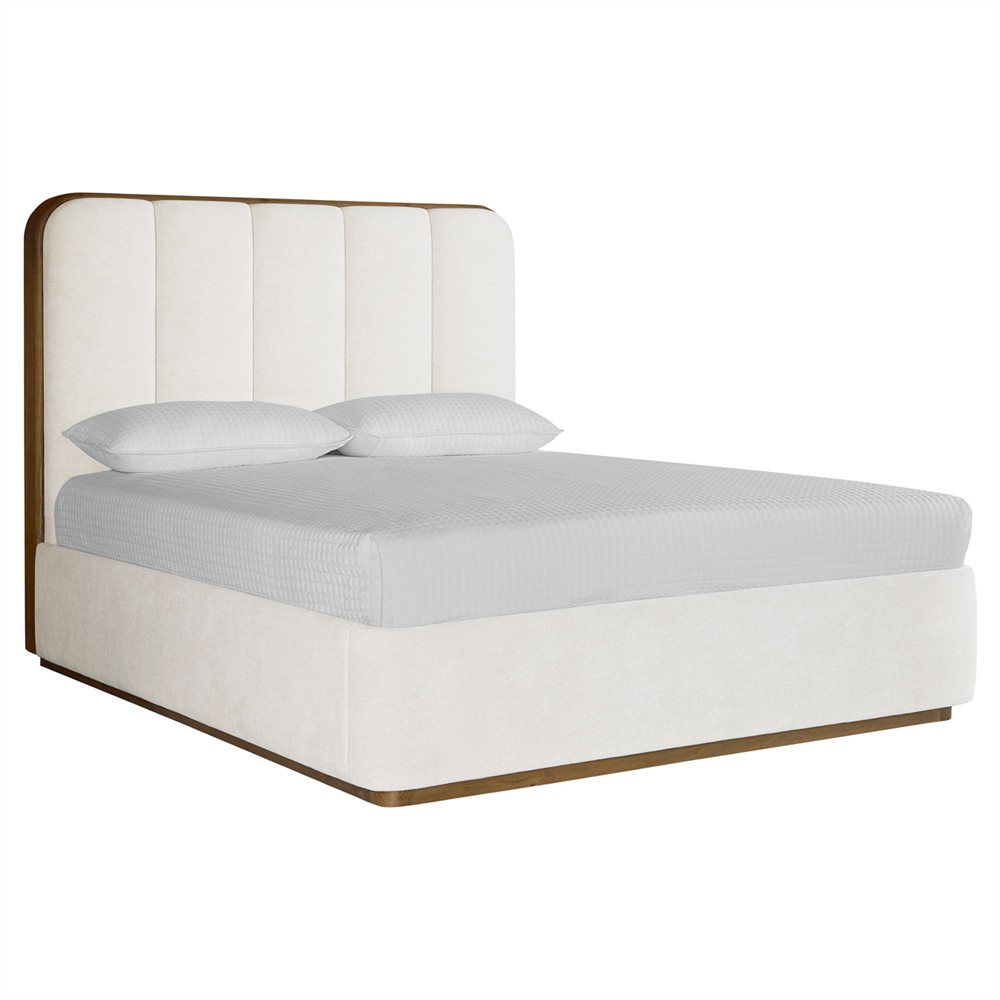 • Noelle Modern Cream Upholstered Light Brown Wood Frame Bed - Queen|Kathy Kuo Home