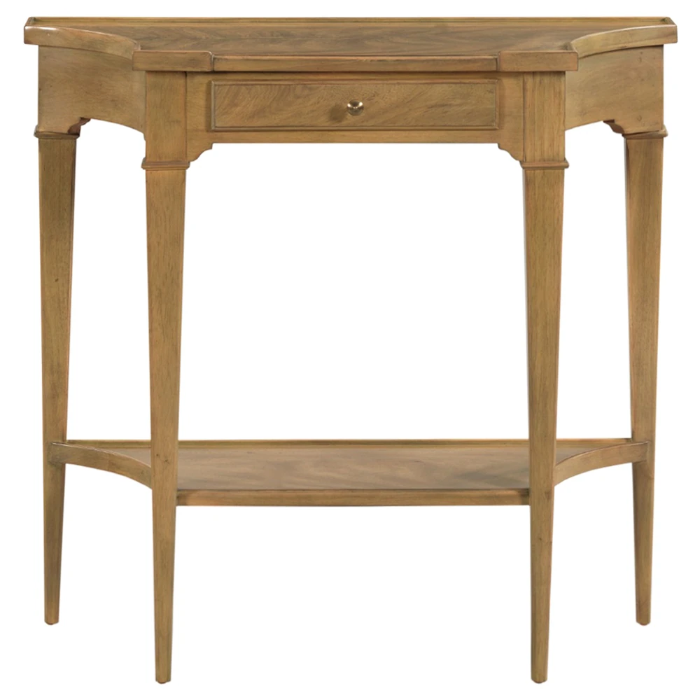 • Features a shallow depth, concave front corners, an apron rail drawer, and a low storage shelf for space-efficient functionality