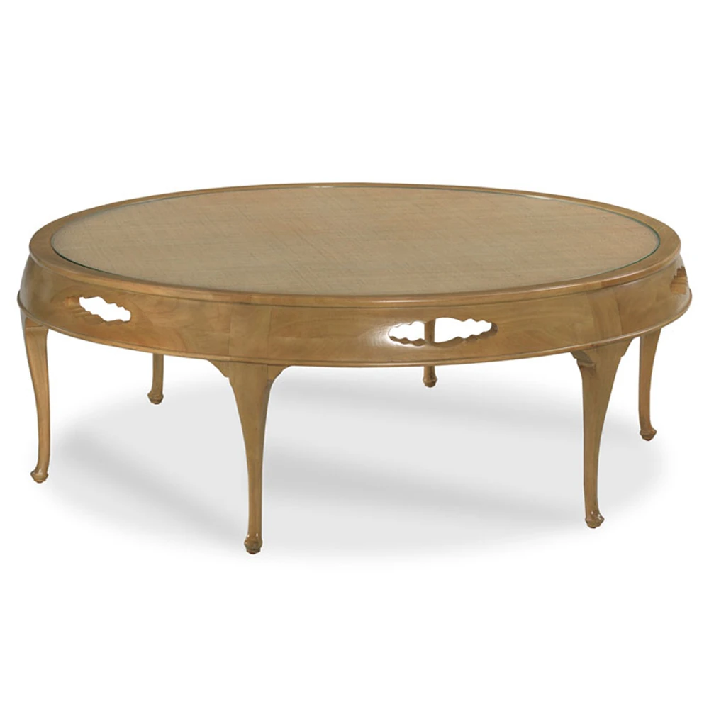 • Features a round inset glass top over woven cane, shaped cloud-like pierced apron rails, and cabriole legs inspired by 18th Century design