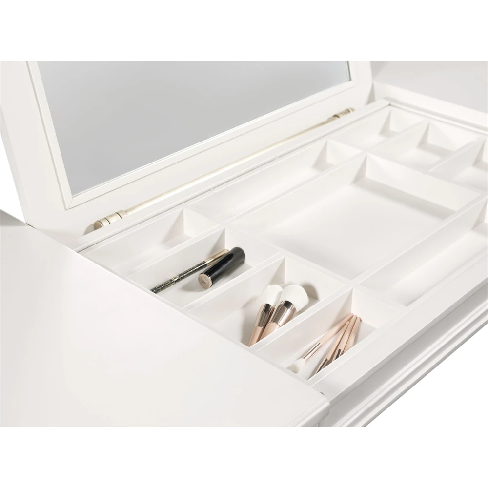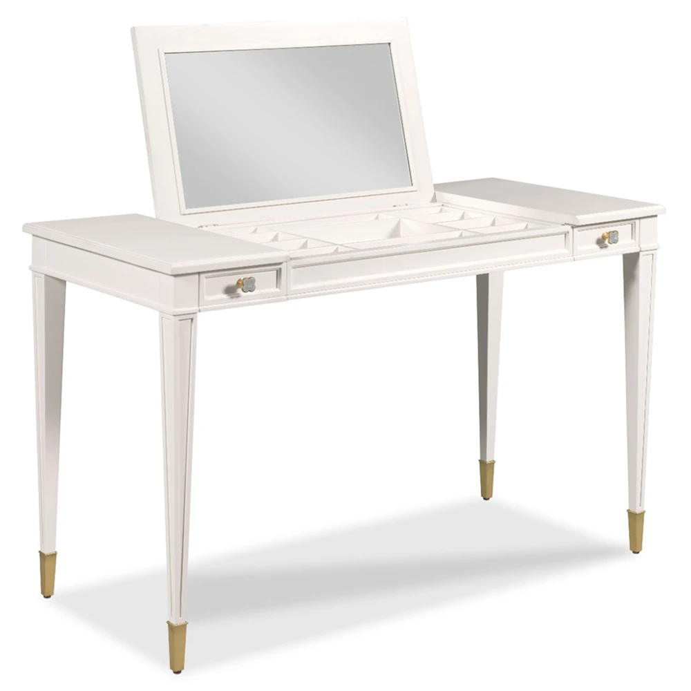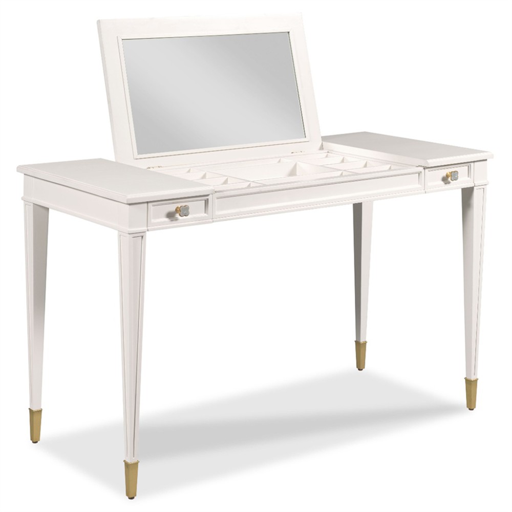 • Features 2 side drawers, a lift-top compartment with interior storage sections and mirror, and tapering legs with brass sabots