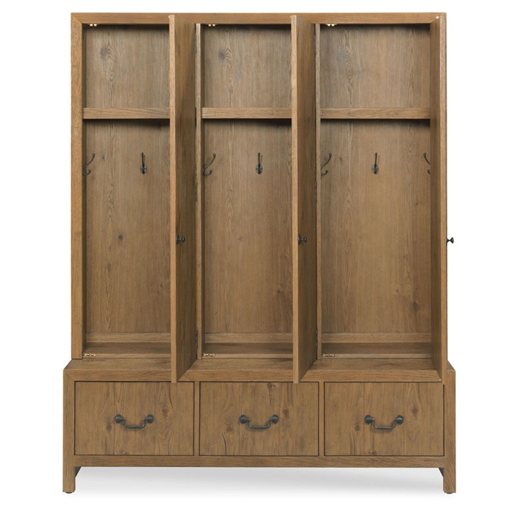 • Features 3 oak-veneered doors with storage compartments or bronze hooks above, and 3 spacious drawers with bronze hardware below the seat for versatile entryway use