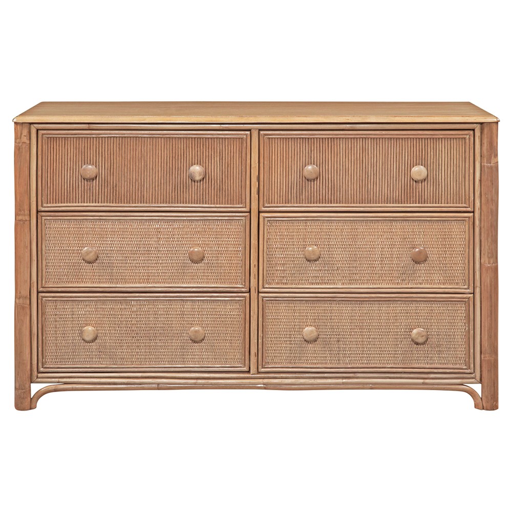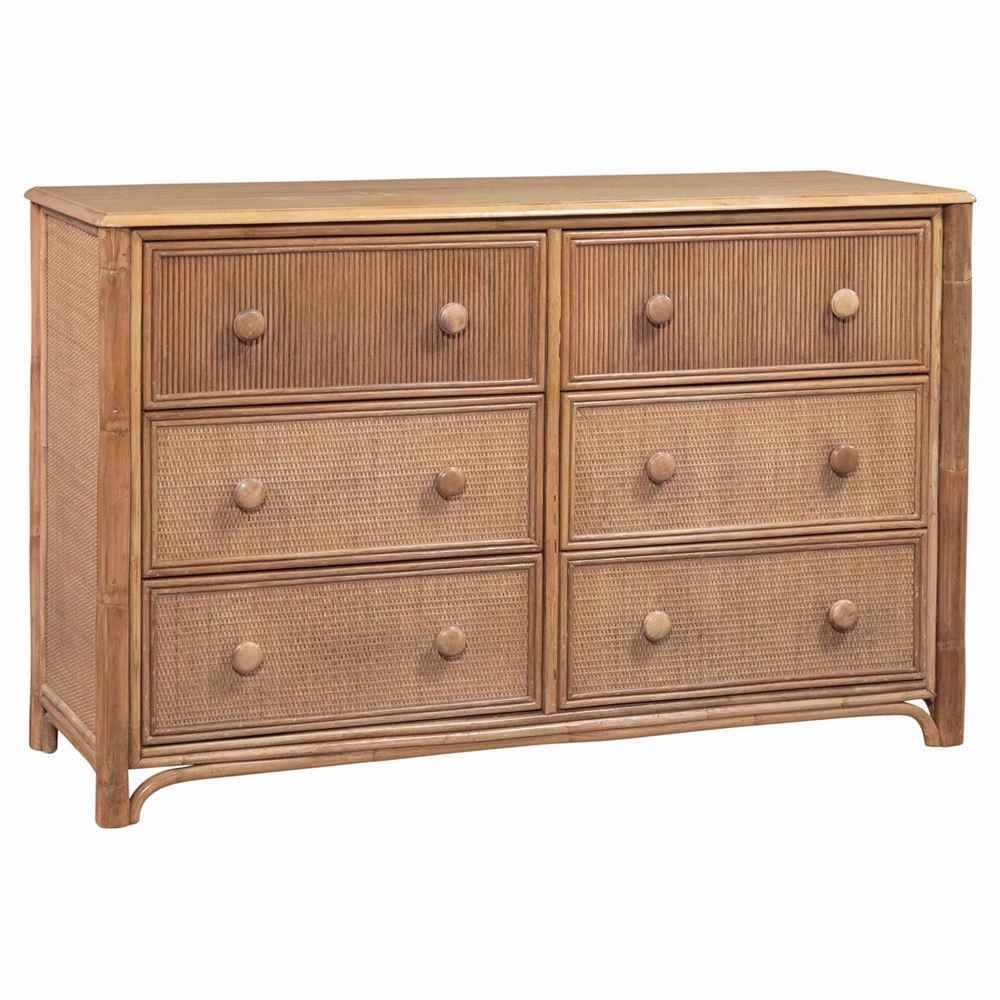 Rhian Coastal Beach Natural Mango Wood Woven Cane 6 Drawer Double Dresser