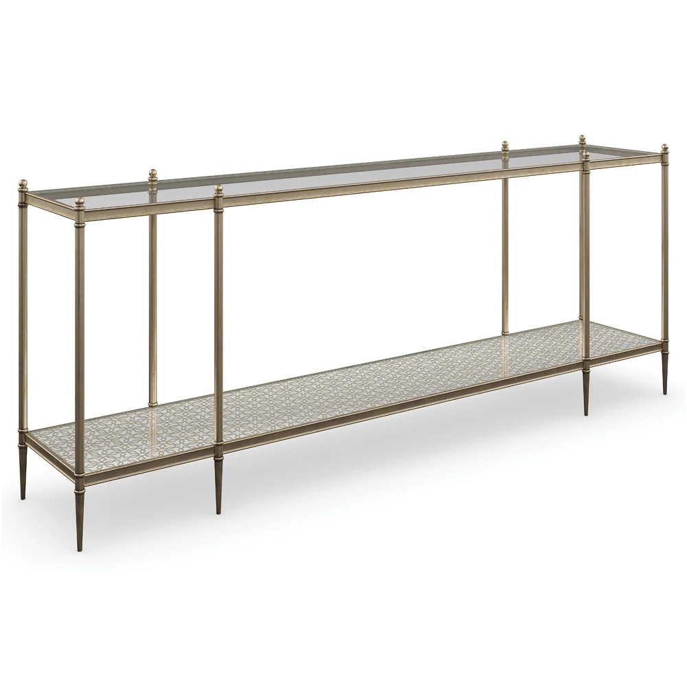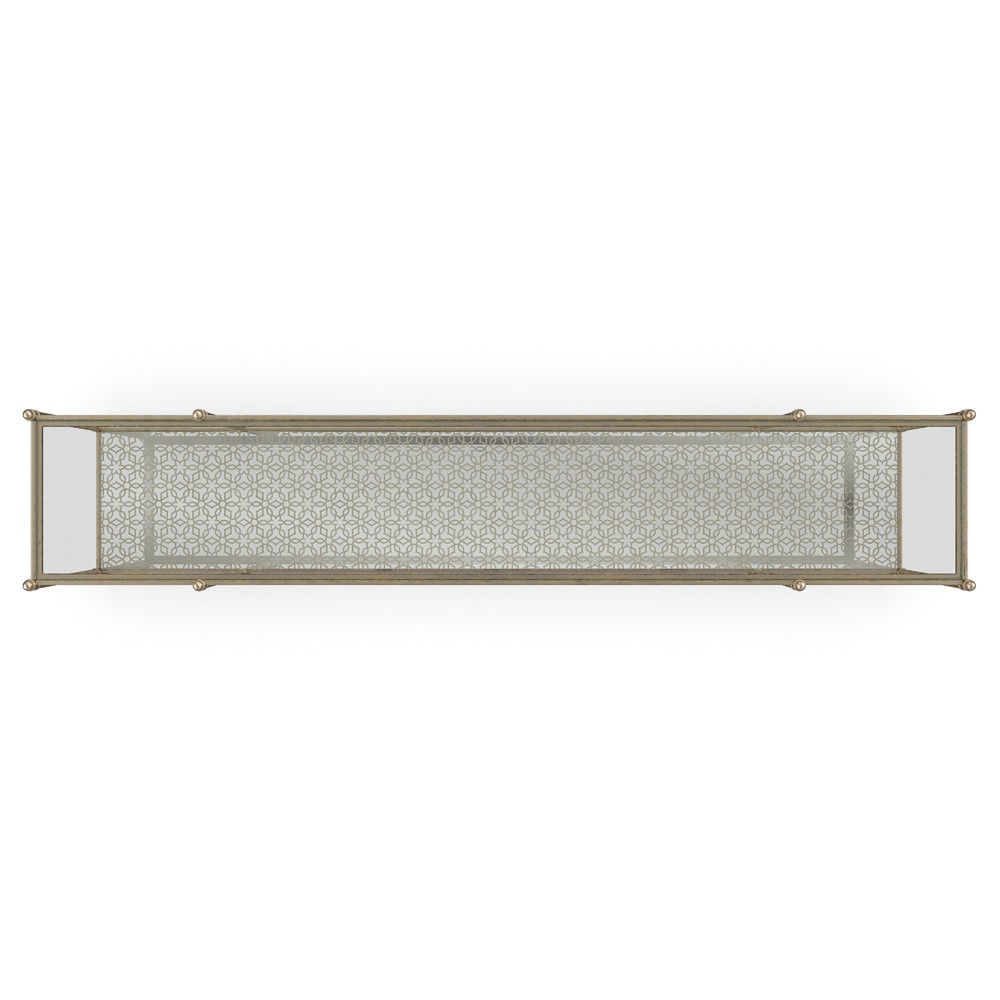 • Clear glass top. Silver Leaf pattern on back of bottom mirrored shelf