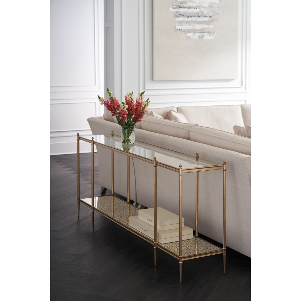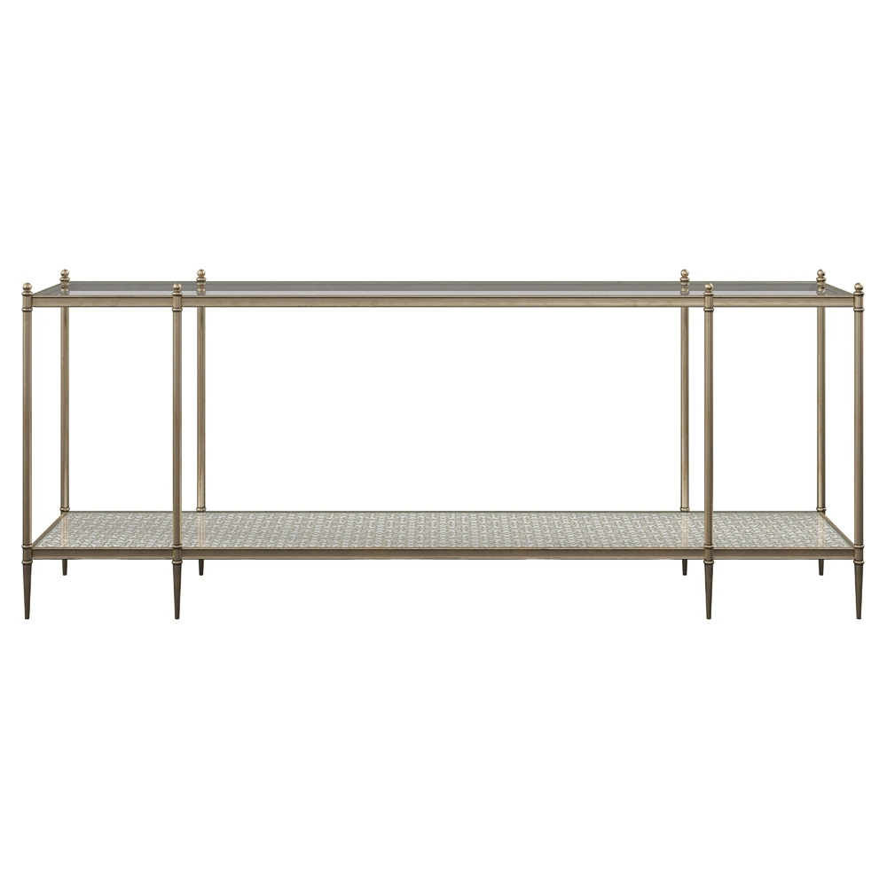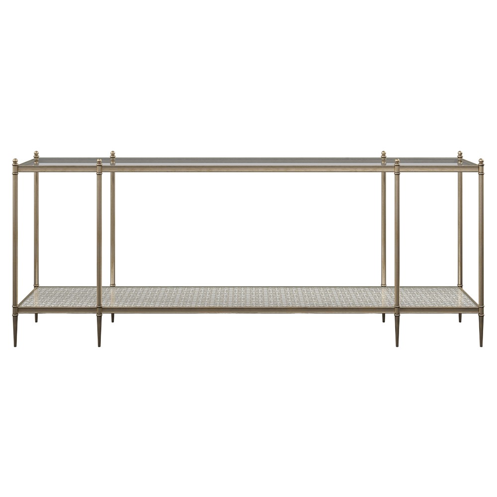 • Arlene Updated Traditional White Travertine Bronze Iron Rectangular Console Table|Kathy Kuo Home