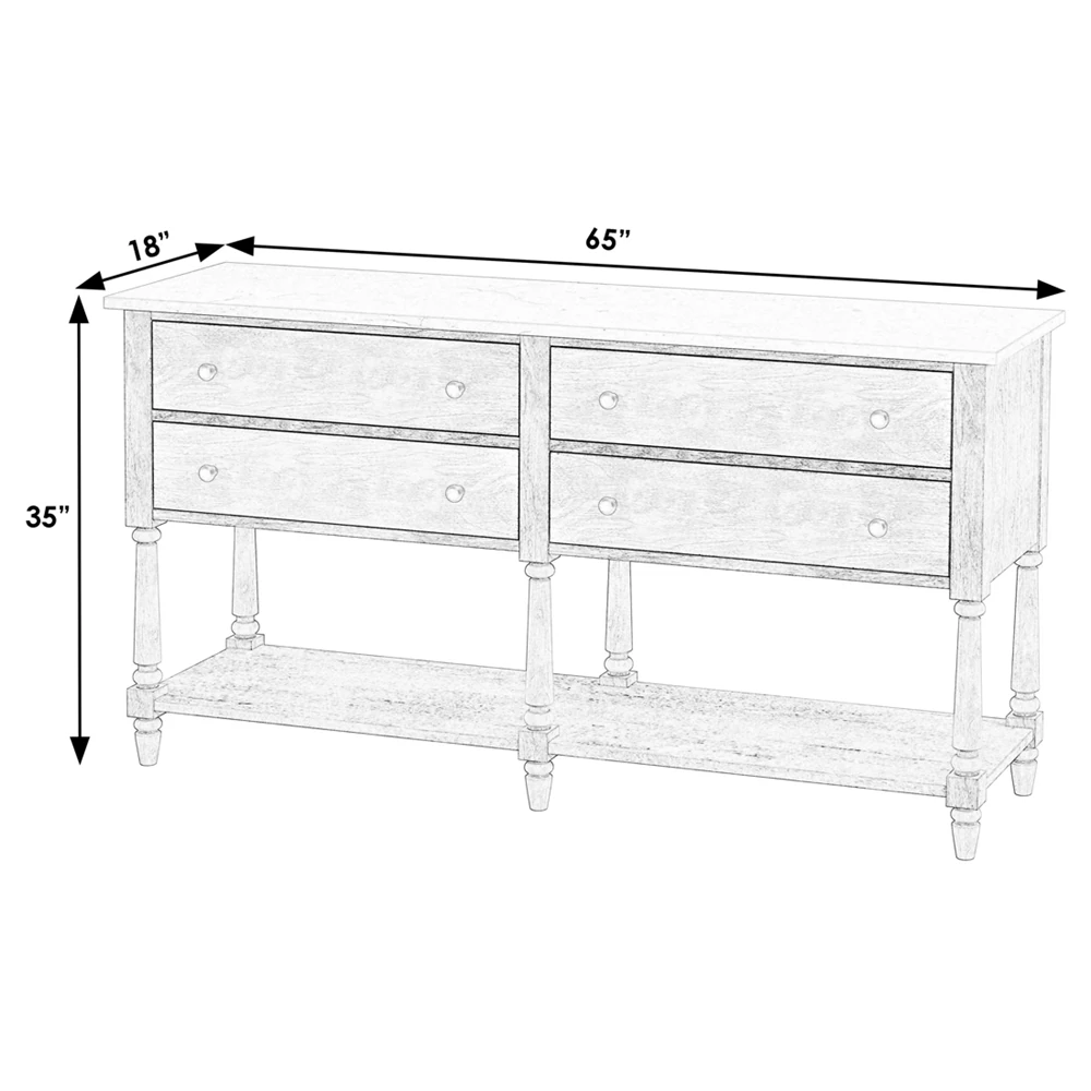 • Lower shelf: 64.5 inches wide x 17.5 inches deep; Drawer base: 13.25 inches high; Lower shelf to floor: 5.25 inches high; Weight Capacity: 200 pounds