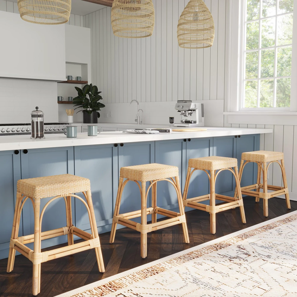 • Frances Coastal Beach Blue Woven Natural Rattan Counter Stool|Kathy Kuo Home