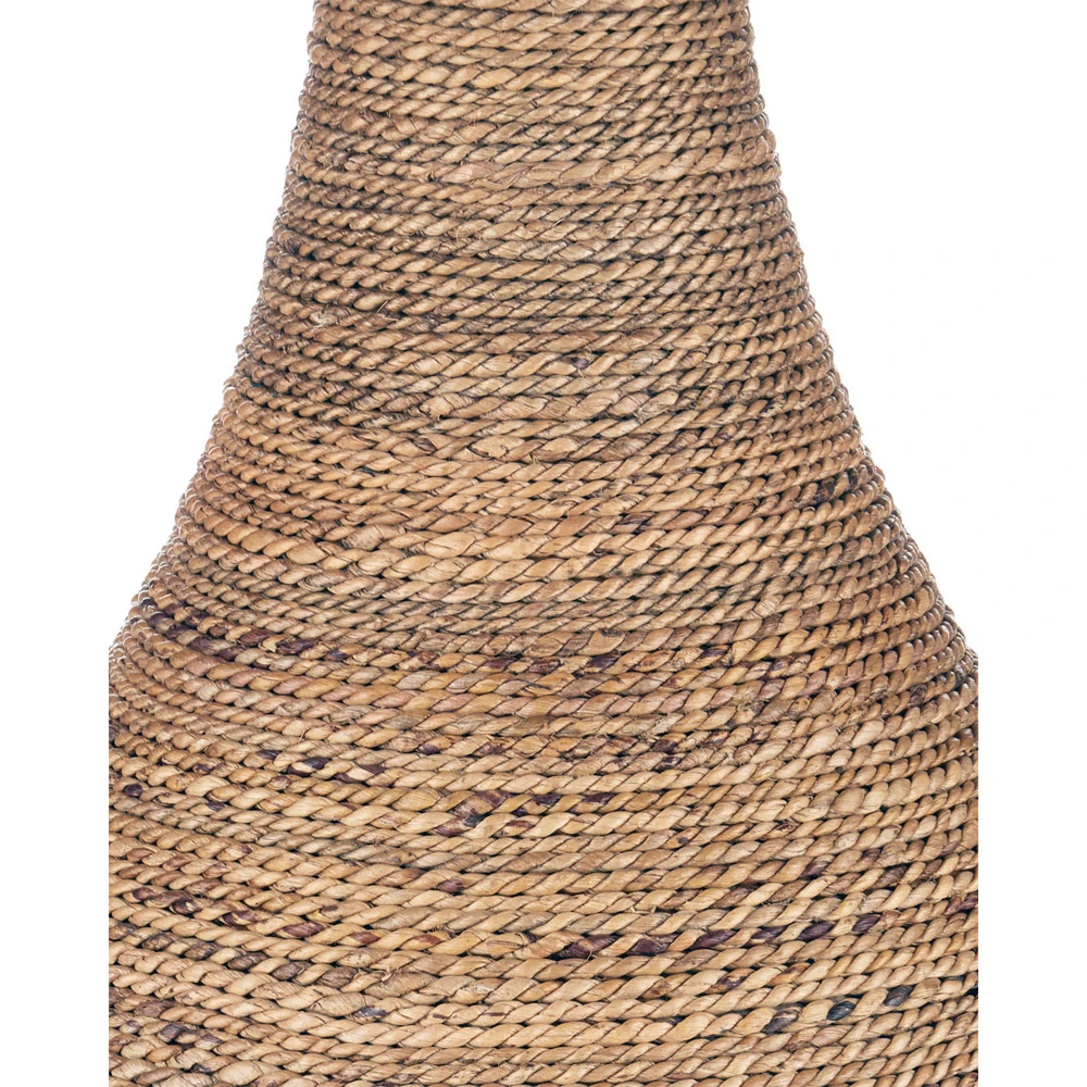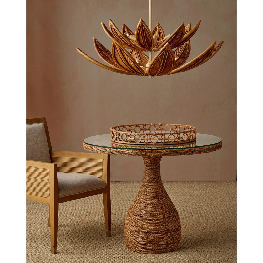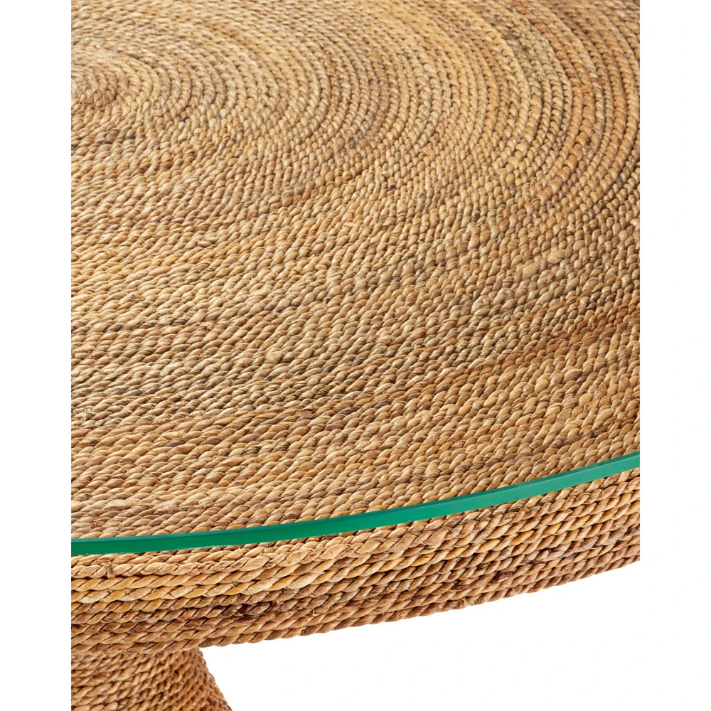 • Features a round glass top over a sculptural, abaca rope-wrapped base showcasing artisanal craftsmanship and organic texture
