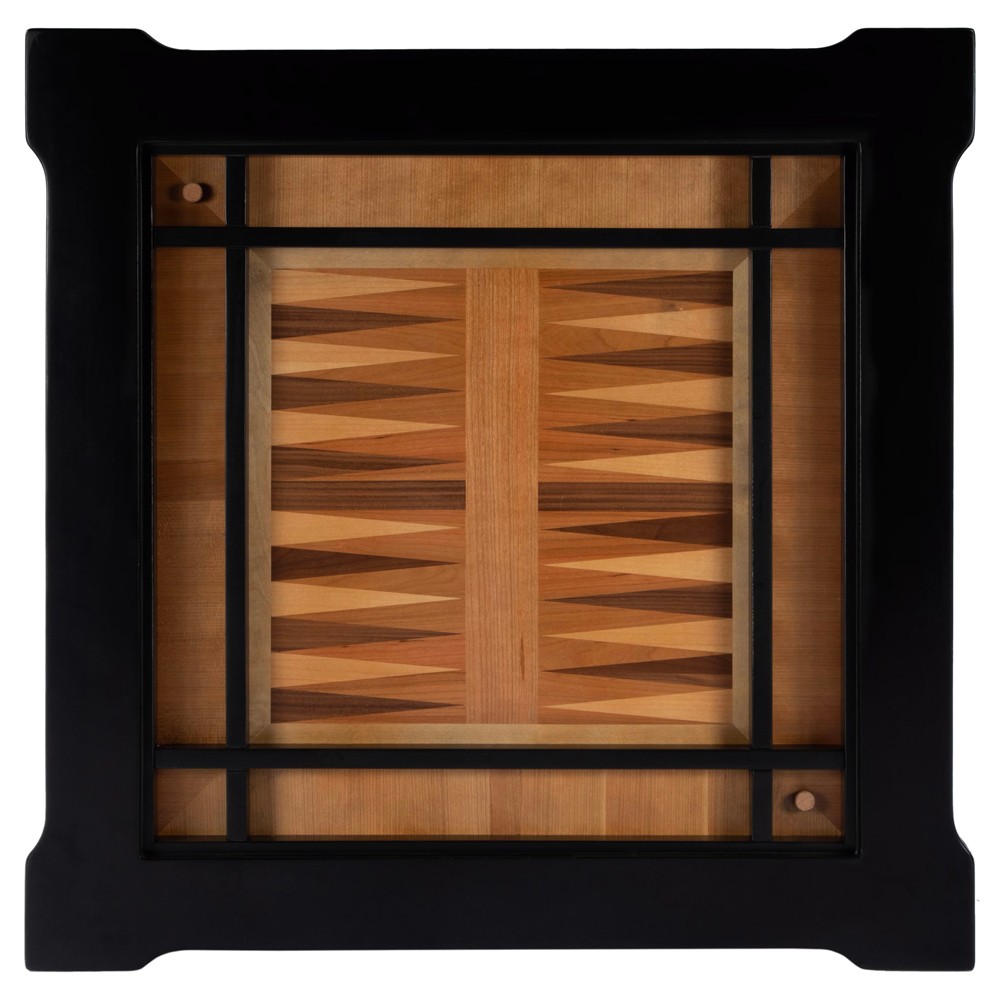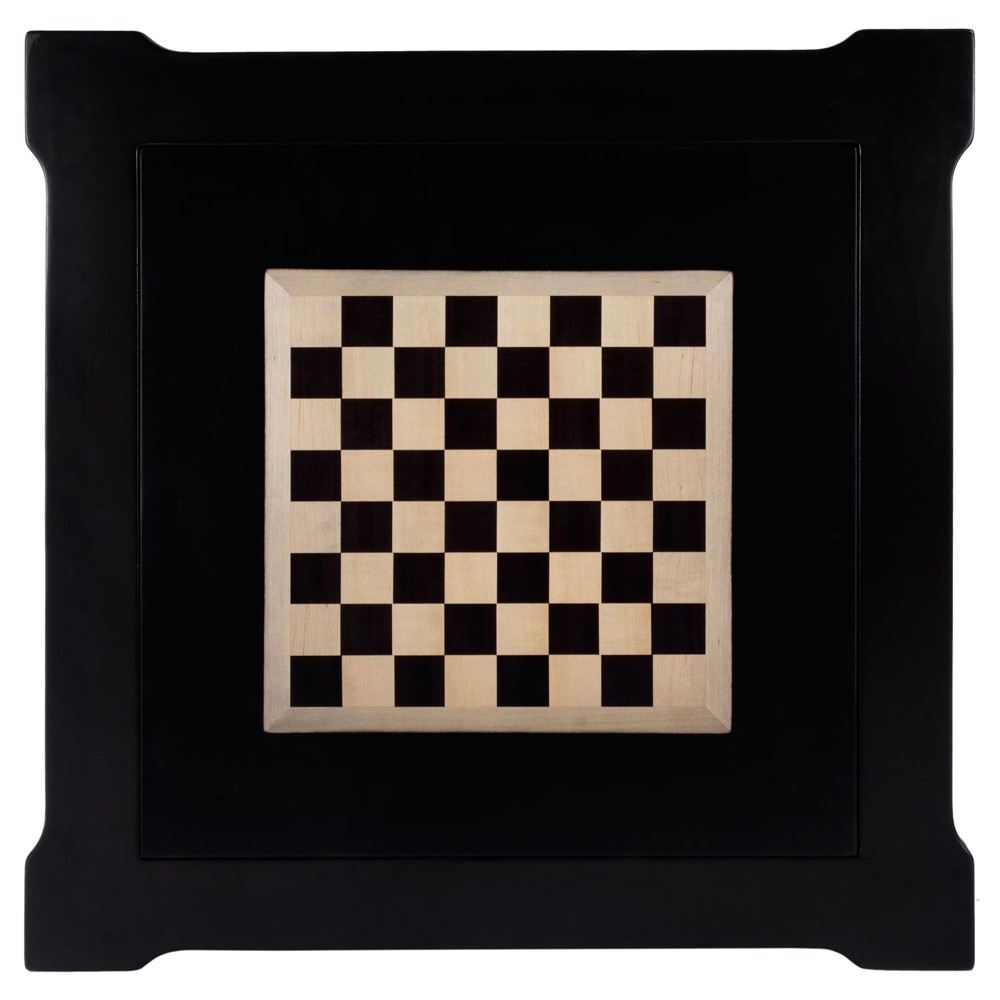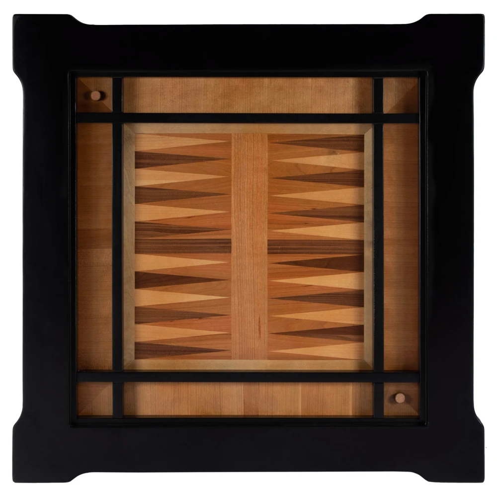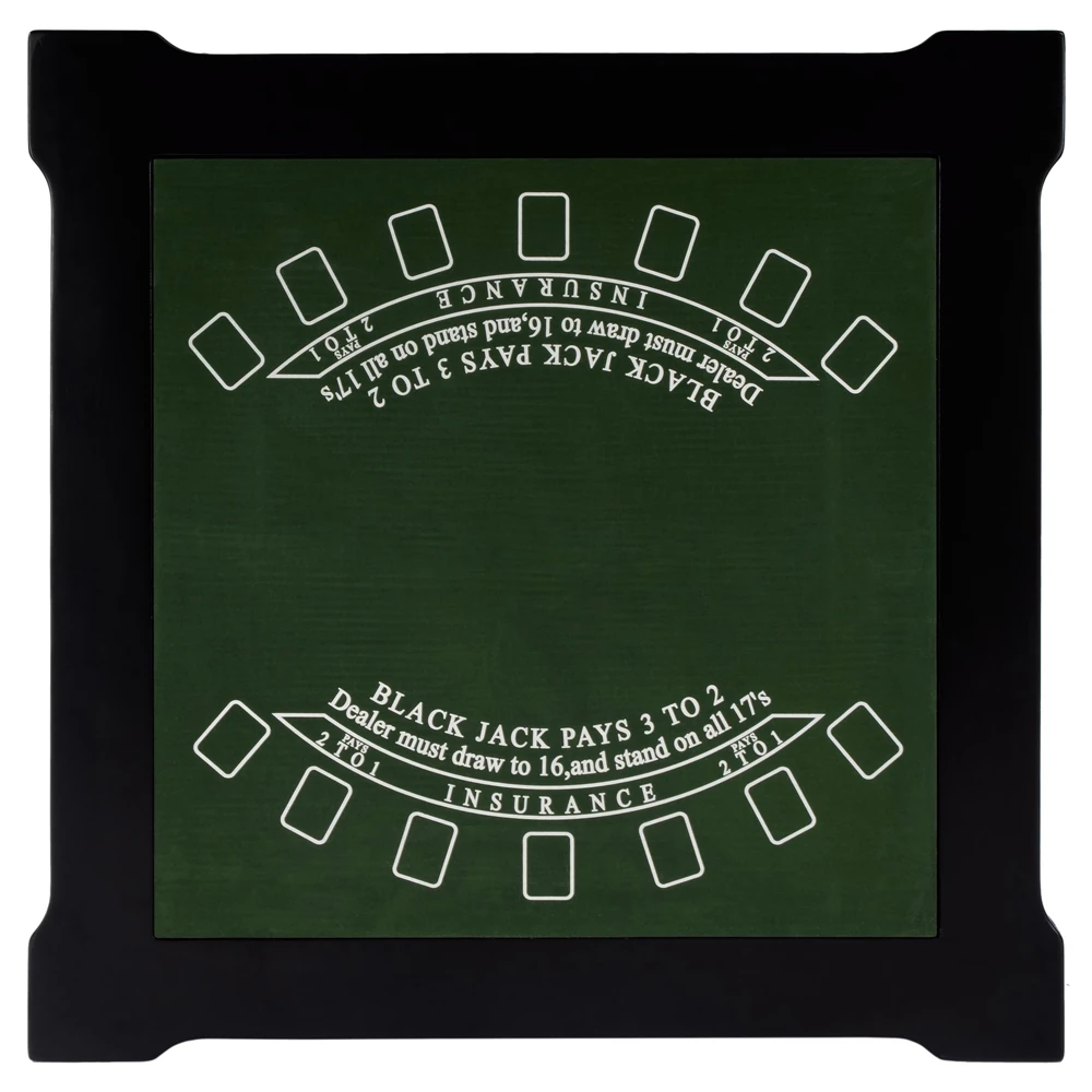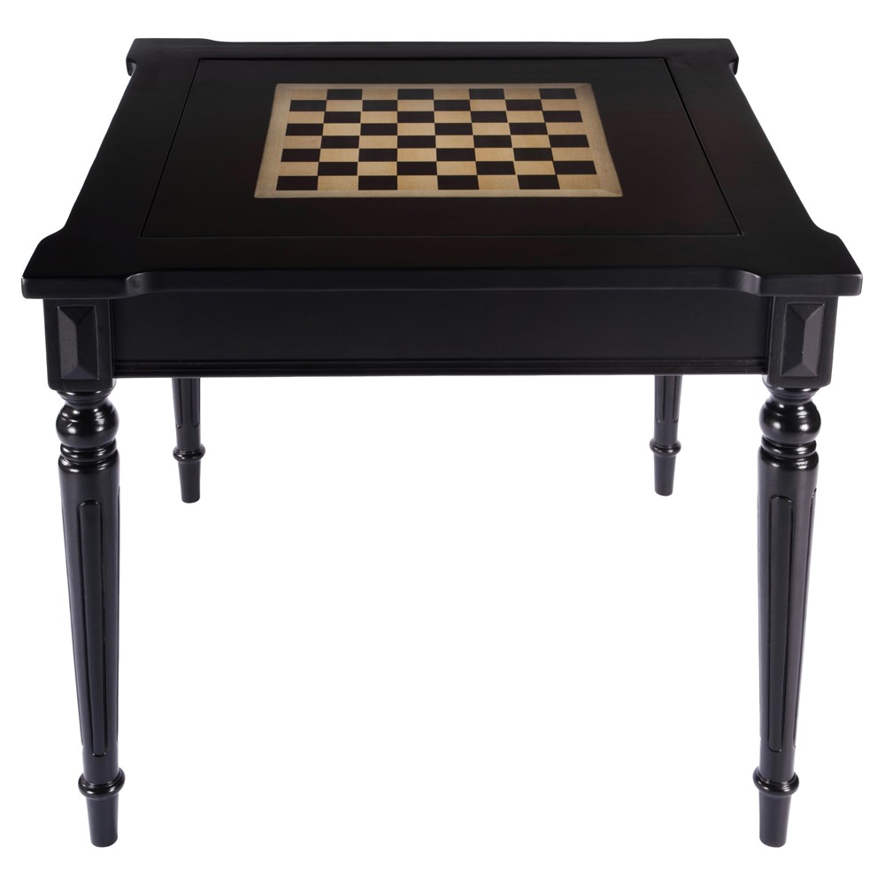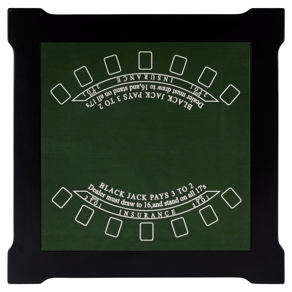 • Features a reversible basswood-veneered game board for chess, checkers, and blackjack, with a built-in backgammon board beneath the inset
