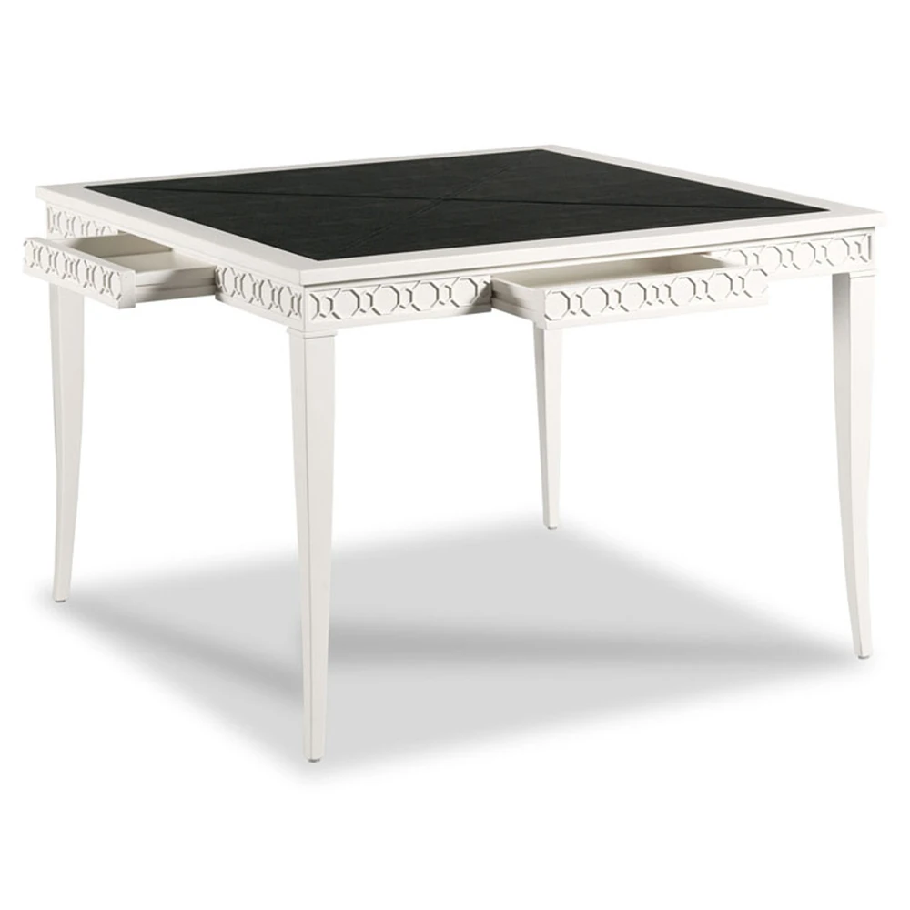 • Features a framed square top inset with Pindler Buckaroo Black vinyl, pierced fretwork apron rails with game piece drawers, and squared posts with stylized cabriole feet