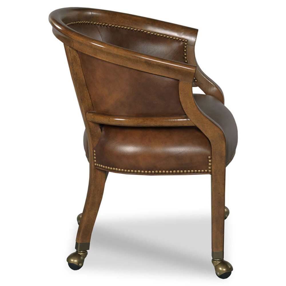 • Features a curved crest back rail with sloped arms, upholstered seat and back in Carroll Leather Applause Coconut Husk with brass nail head trim, and casters for easy movement