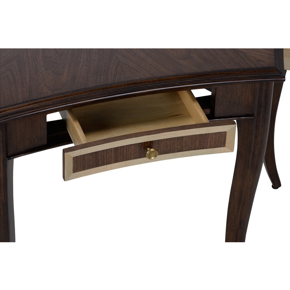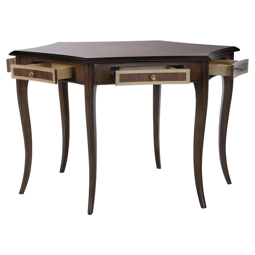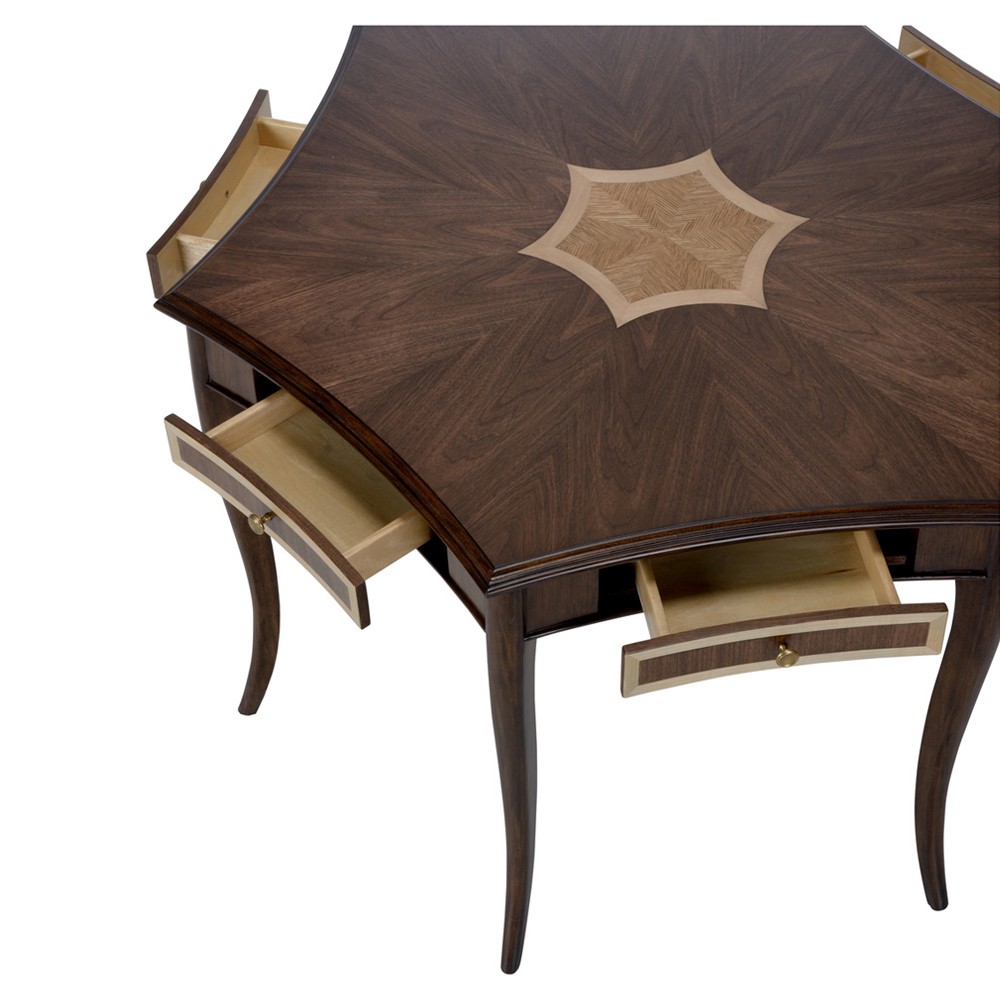 • Features a hexagonal walnut crown veneer top with oak and maple inlay, plus side drawers for storing cards or game pieces